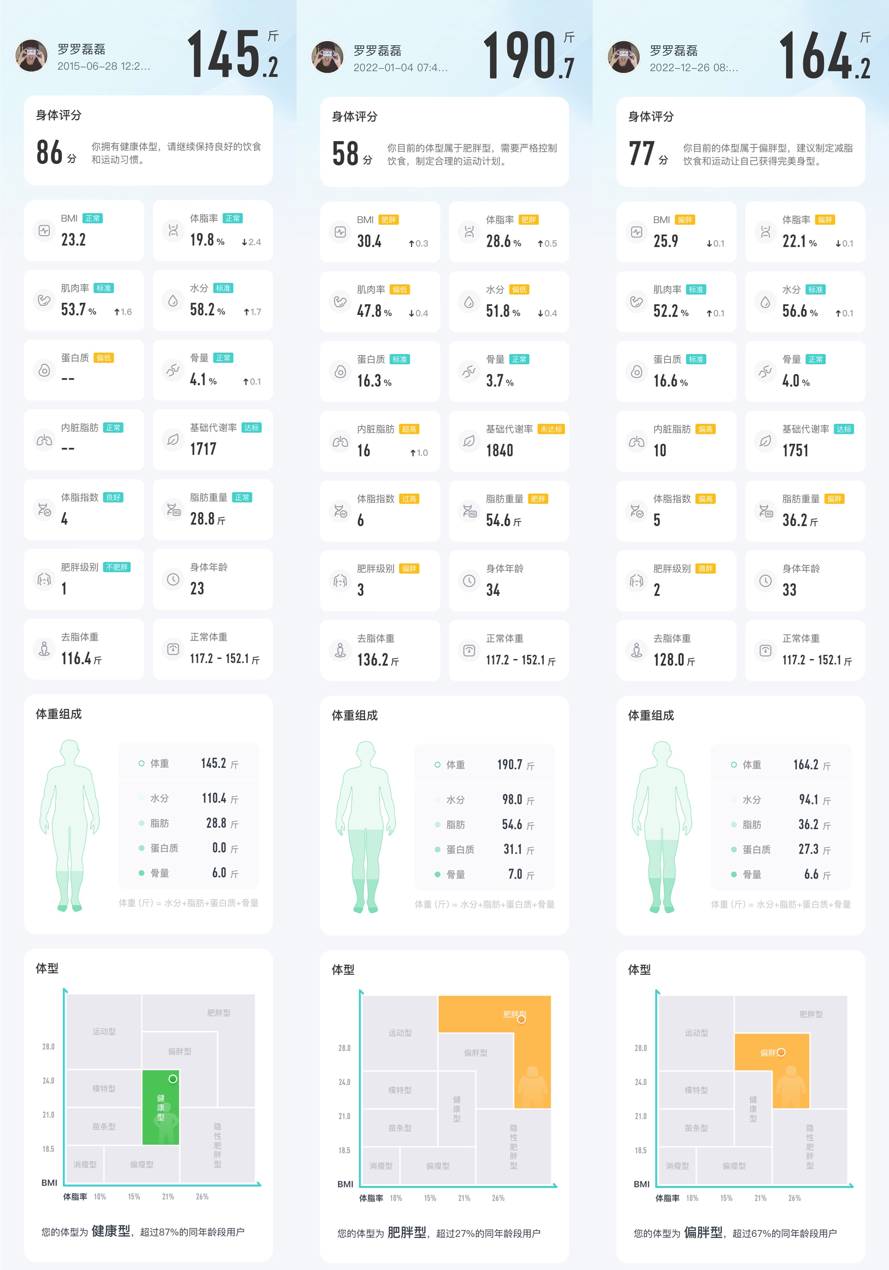 我从2015年开始使用智能秤来记录体重,为了方便大家直观对比,我分别截图了三个阶段的身体数据变化。