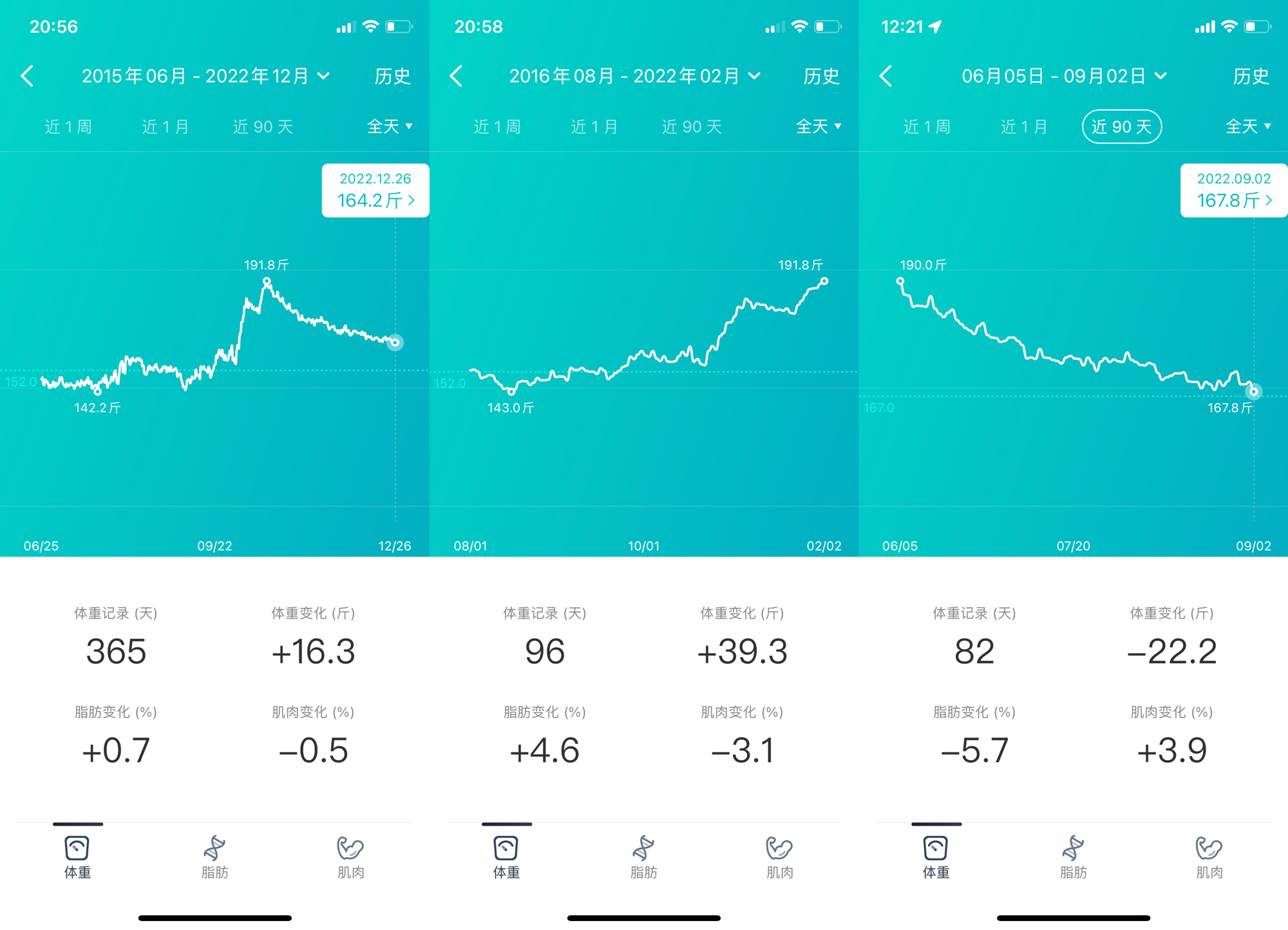 - 失控期(2016年8月-2022年): 从2016年8月开始,我的体重逐渐增加,2022年2月达到最高点 96 kg/ 191.8 斤,在这7年时间里,我的体重累计增加了将近20 kg / 40斤。