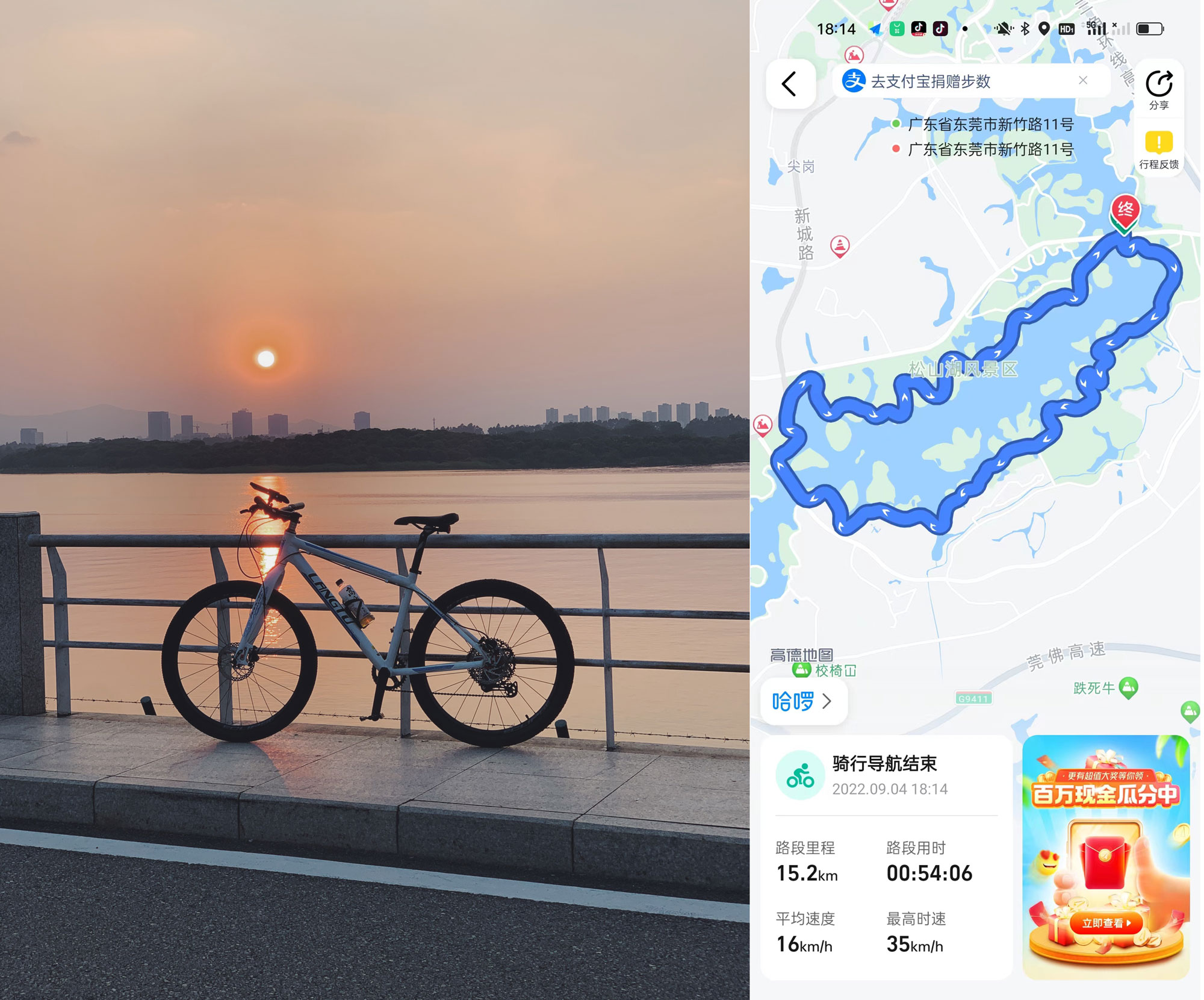 除了室内 HIIT,我后面也开始在一周中穿插一些户外骑行。我现在住的地方靠近松山湖,有时候早上我会环绕松山湖骑行一圈,总里程 15-20 公里,一圈 1 个多小时,回家冲个凉再去上班。