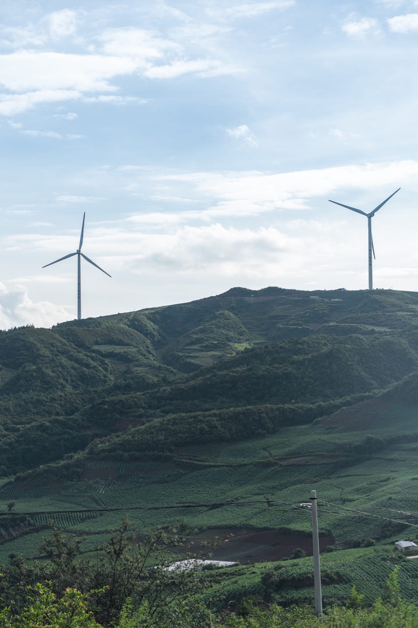 登上山坡,看到山脊上,布满了风机。