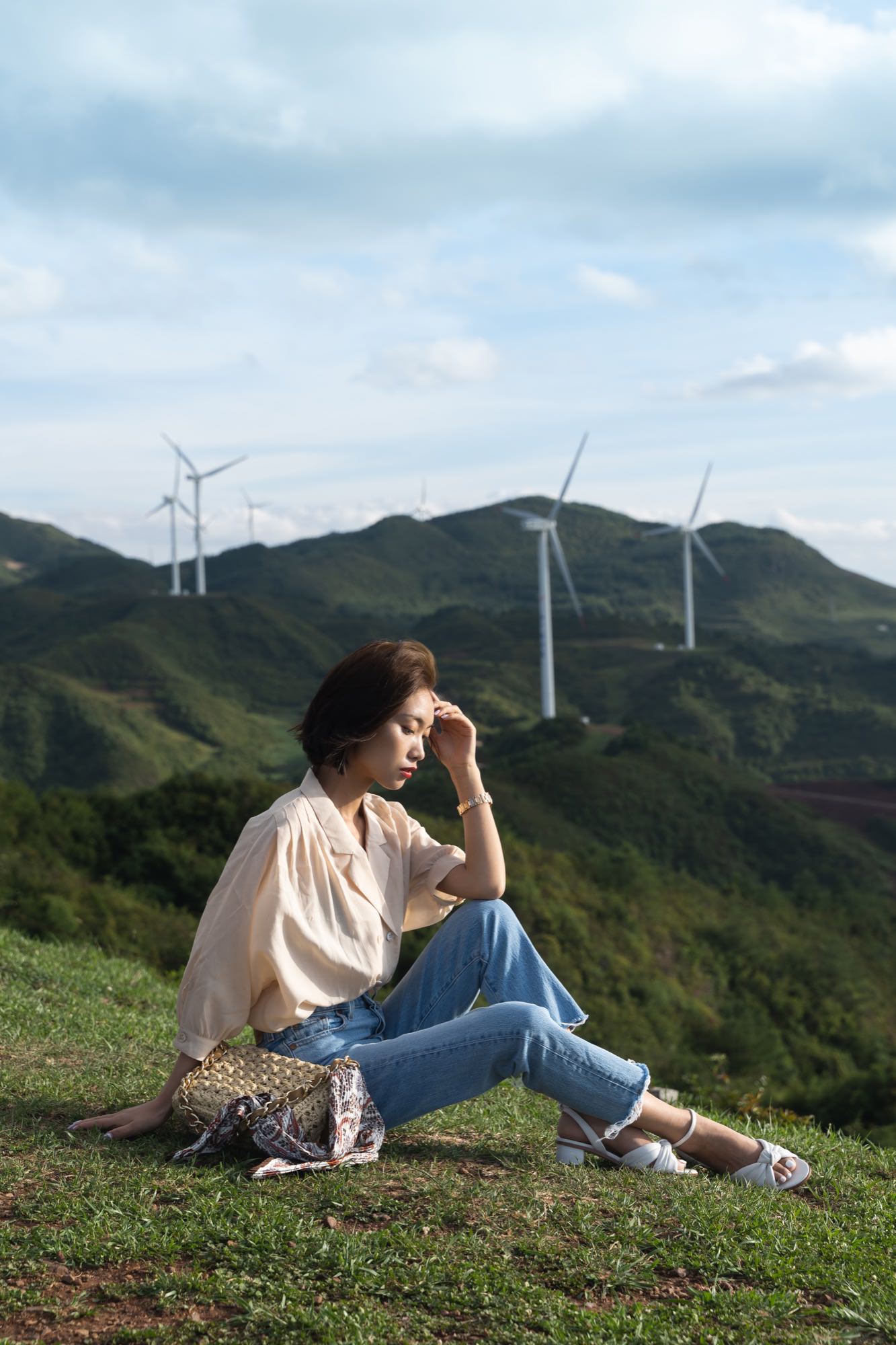 站在风力发电机下面,倒是被这个高度给震撼了,没想到风力发电机居然这么大,扇叶呼呼直转,山顶的风也的确是很大。