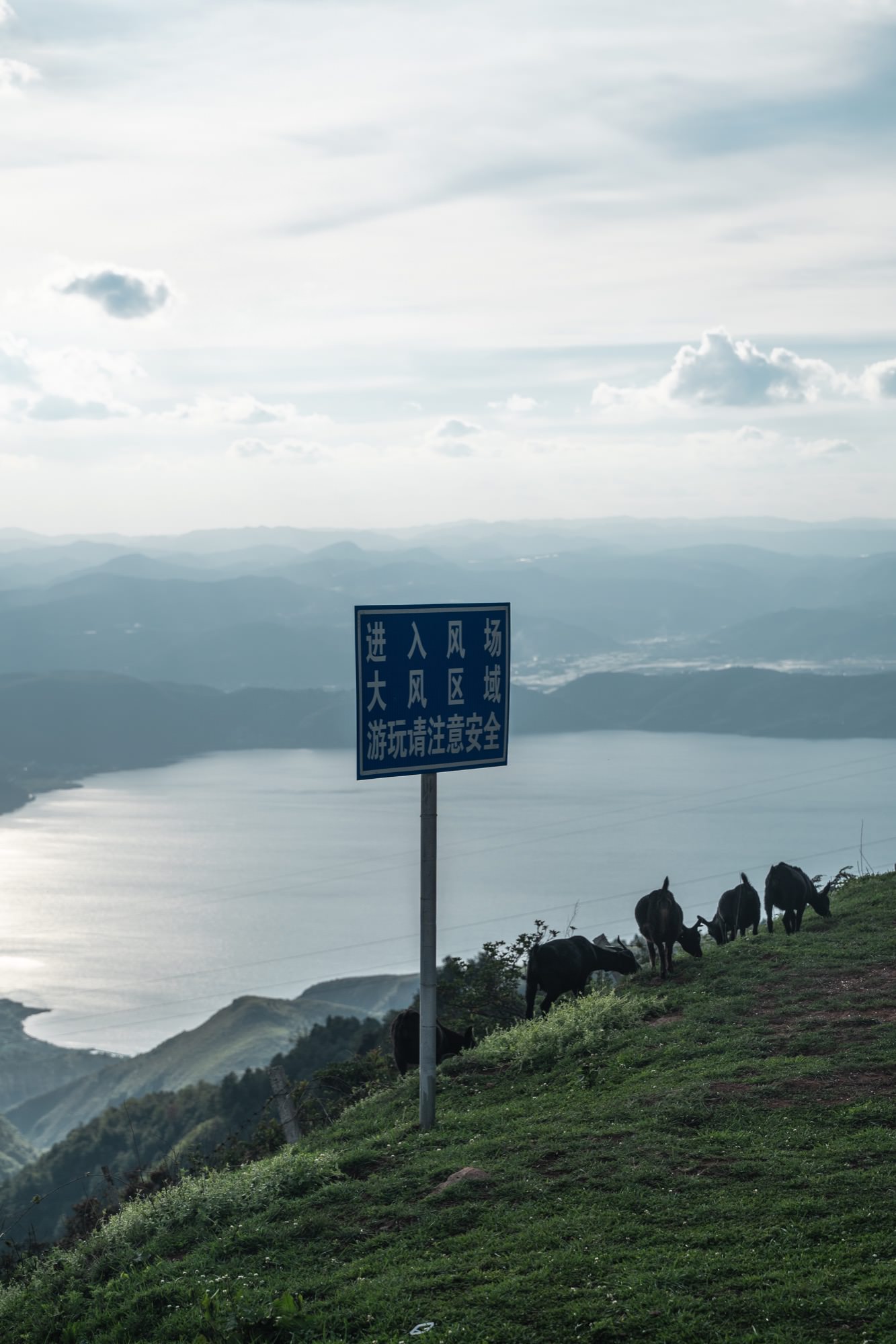 往下望去,就是抚仙湖,今天沿着湖走过的路,尽收眼底。山上还有羊吃草。