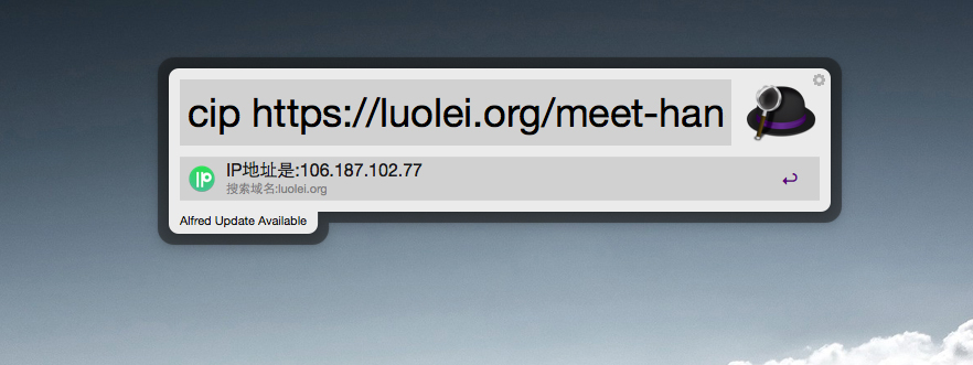 Alfred3:使用最多的几个功能:翻译,查 IP 来源,自己还写了一个查 IP 的插件 Alfred 域名 IP 速查。