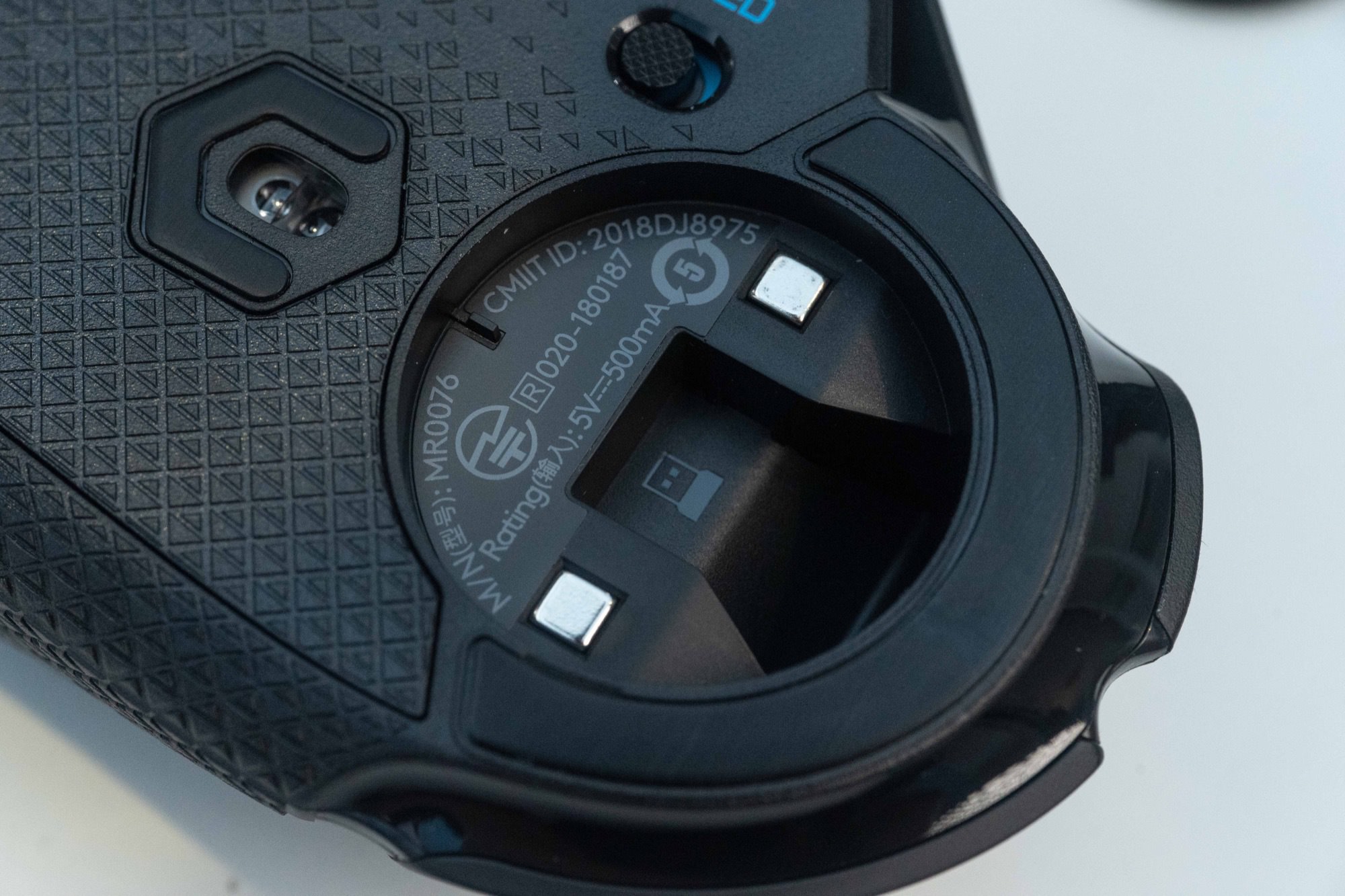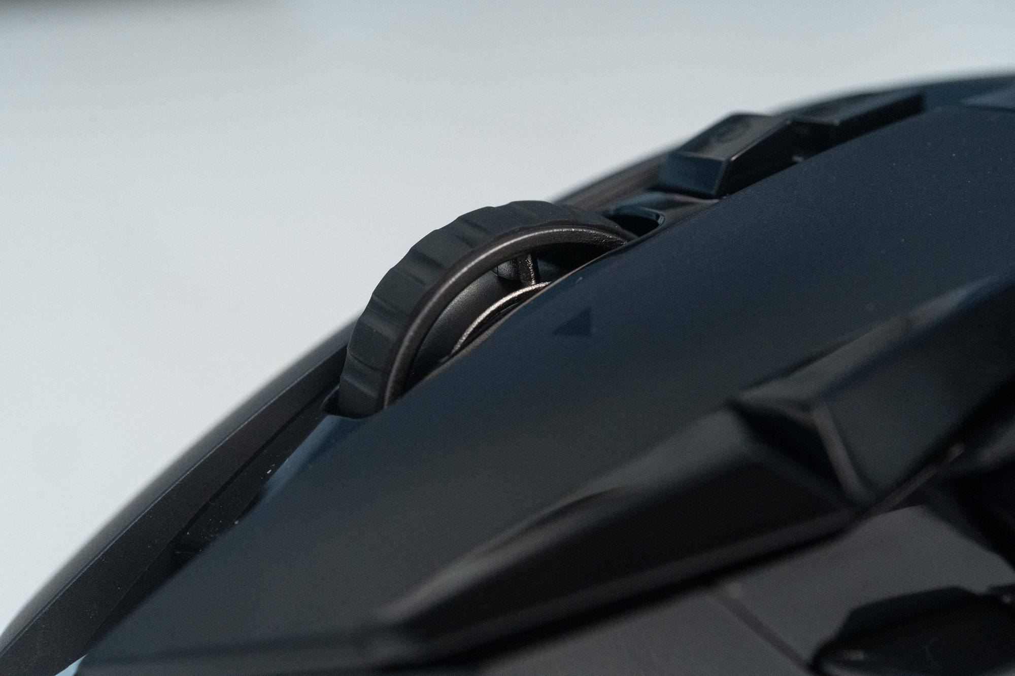 不同于老款的金属滚轮,无线G502采用的镂空滚轮,重量稍微又轻了一点。