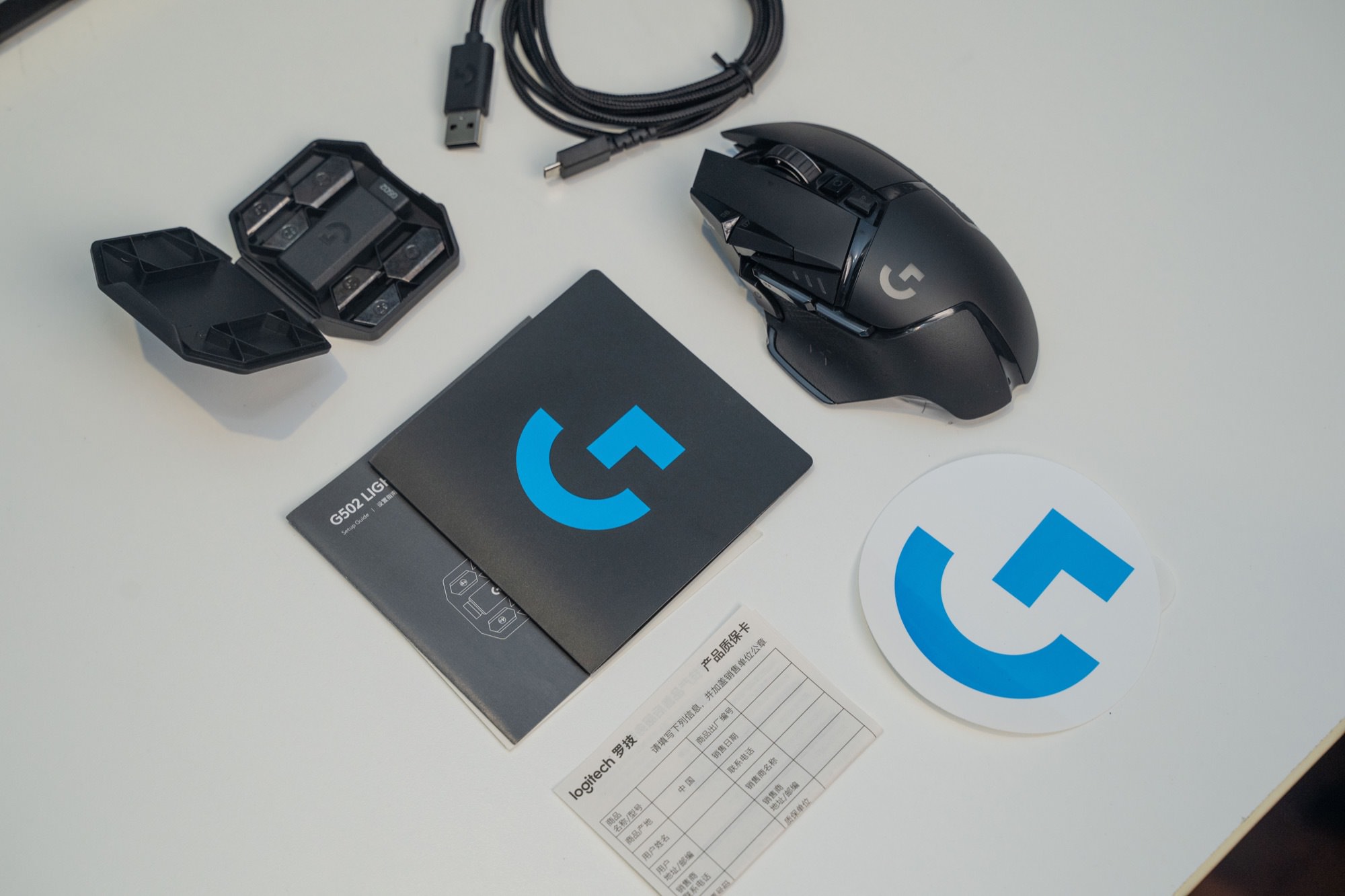 盒子里的全部东西,保修卡、说明书、贴纸、配重、数据线,唯一差评的就是,G502 LIGHTSPPED作为一个款 2019 年的产品,还是使用 microUSB 接口,换个 Type-C 不好么。