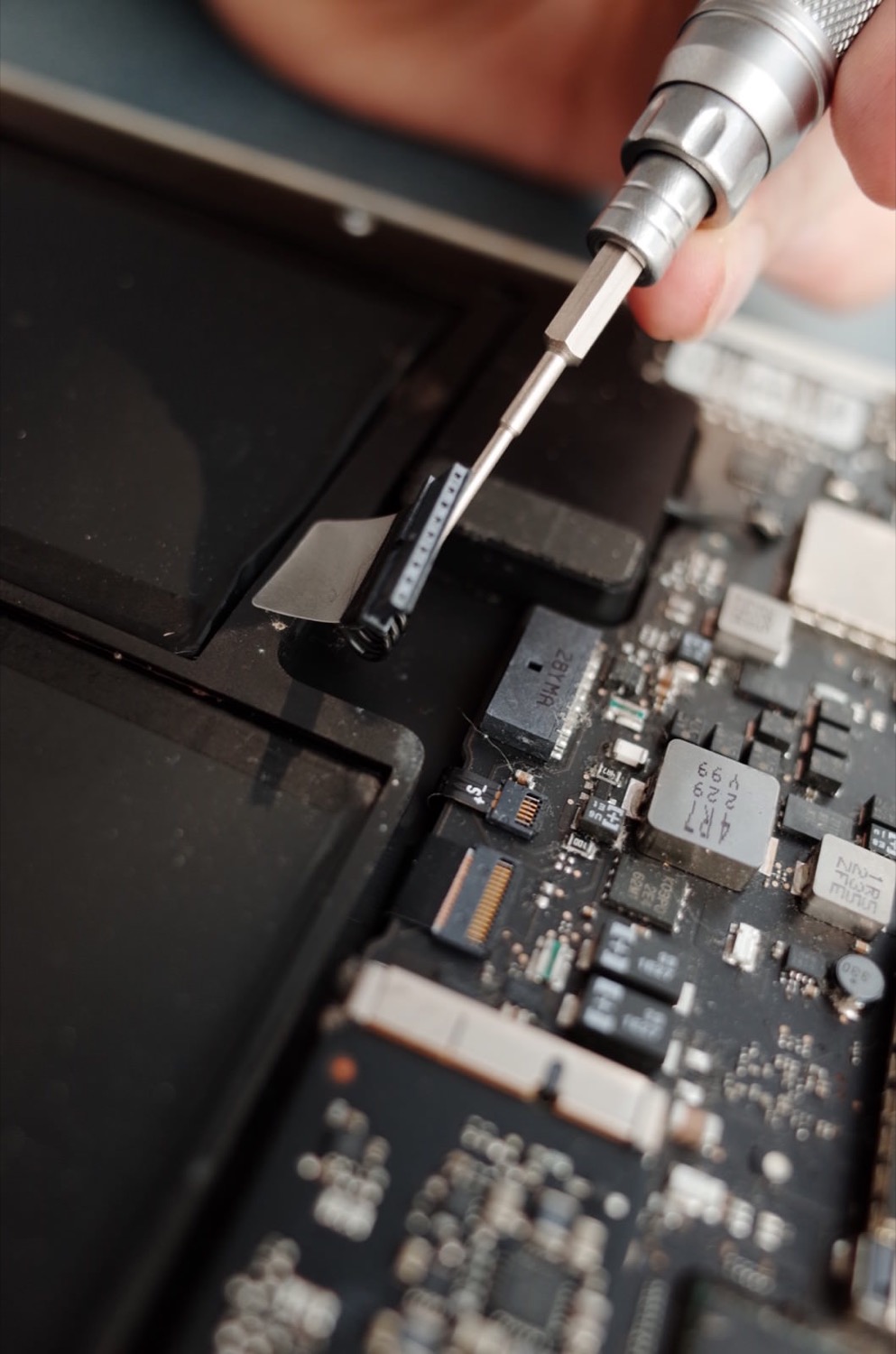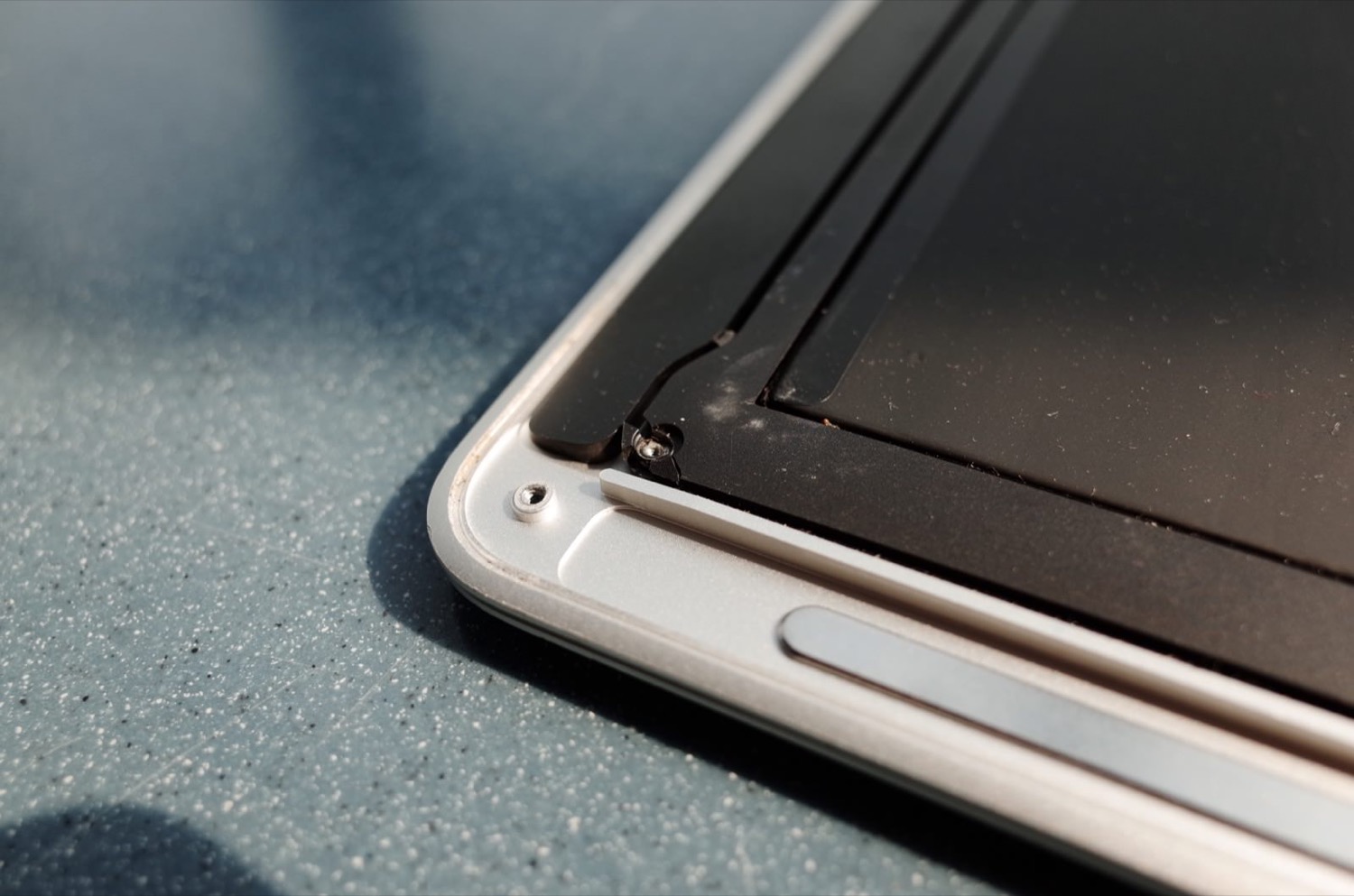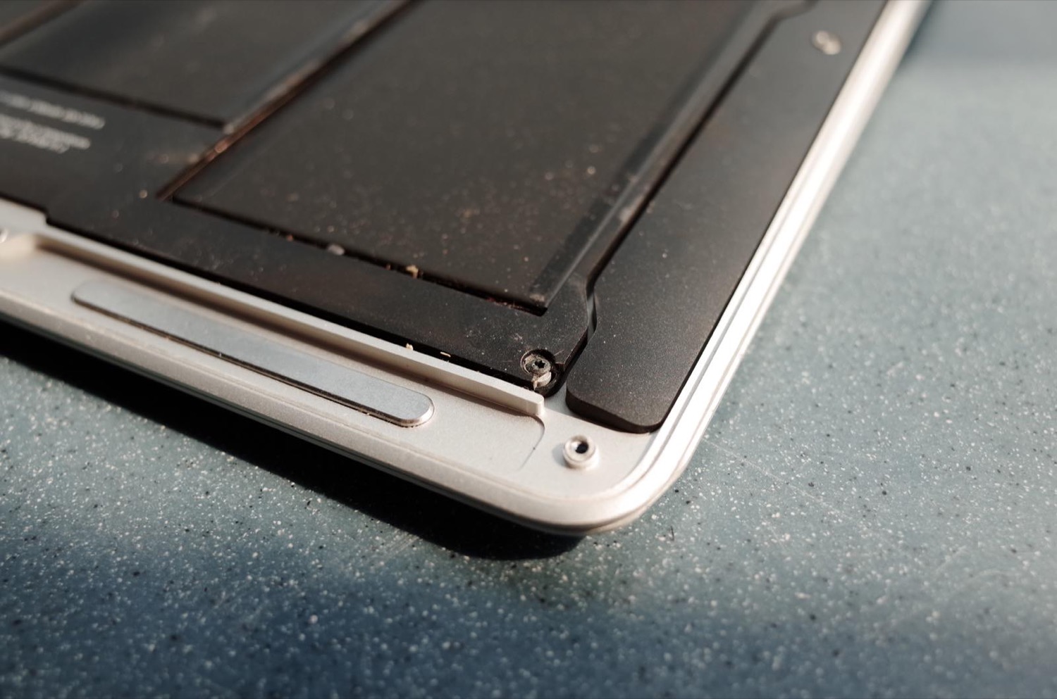 首先拆下Macbook背面边角的所有螺丝,需要用到专门的螺丝刀。