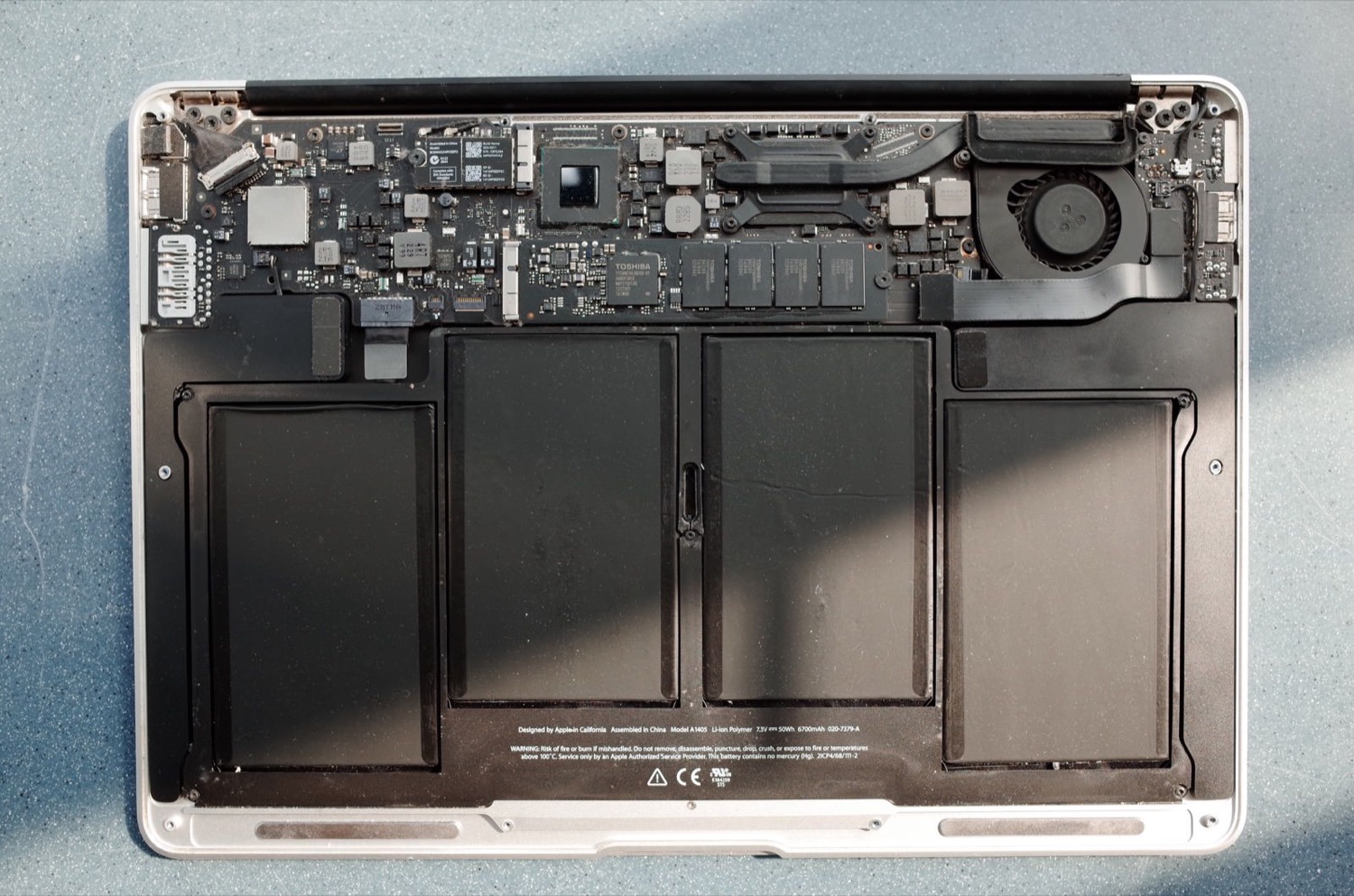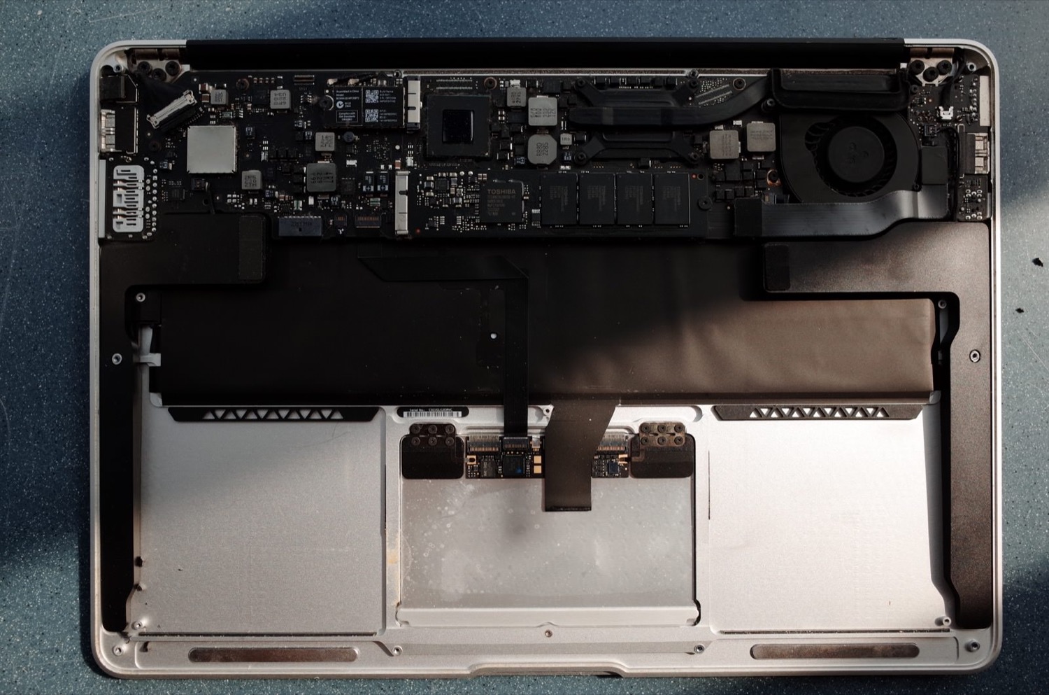 轻轻地撬动掰开背后的金属背壳,Macbook的内部就一览无余了,上方是主板,下面这么一大块黑色的就是电池了,多亏了Macbook精良的工艺,这都三年半的老机器了,里面的可以说还是很干净的,可以拿小刷子清理下灰尘。