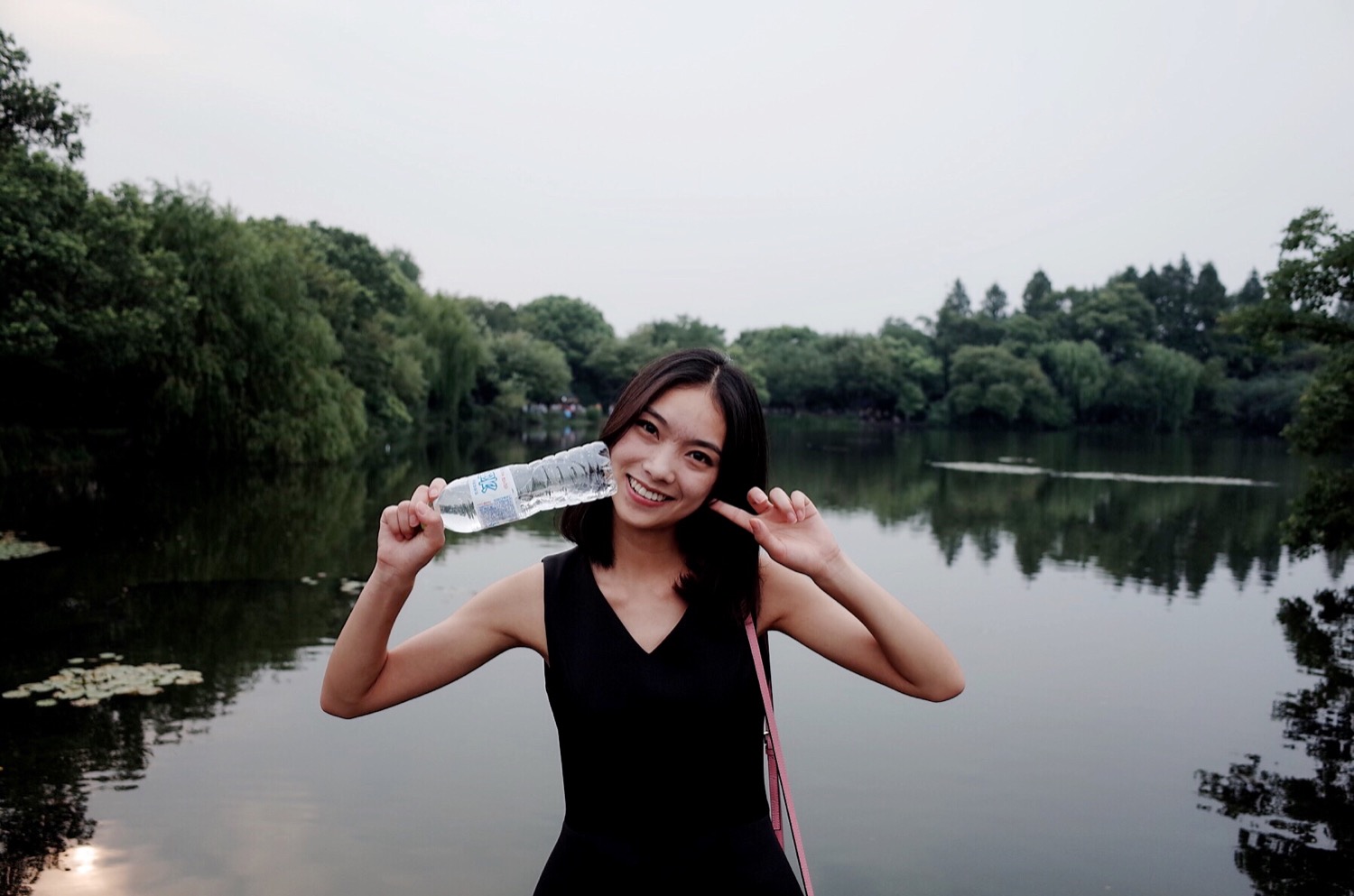 登上中间的三潭印月,人也不少,但肯定比湖边的人流要小多了,四点半的太阳刚刚好,走到最里面的潭子,拍下妹纸开心的一笑。
