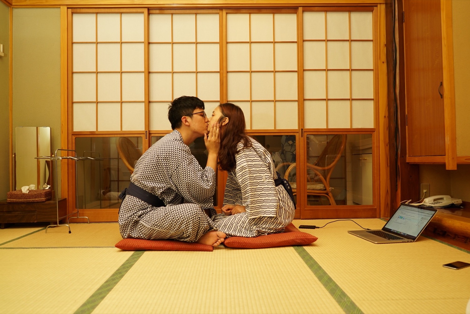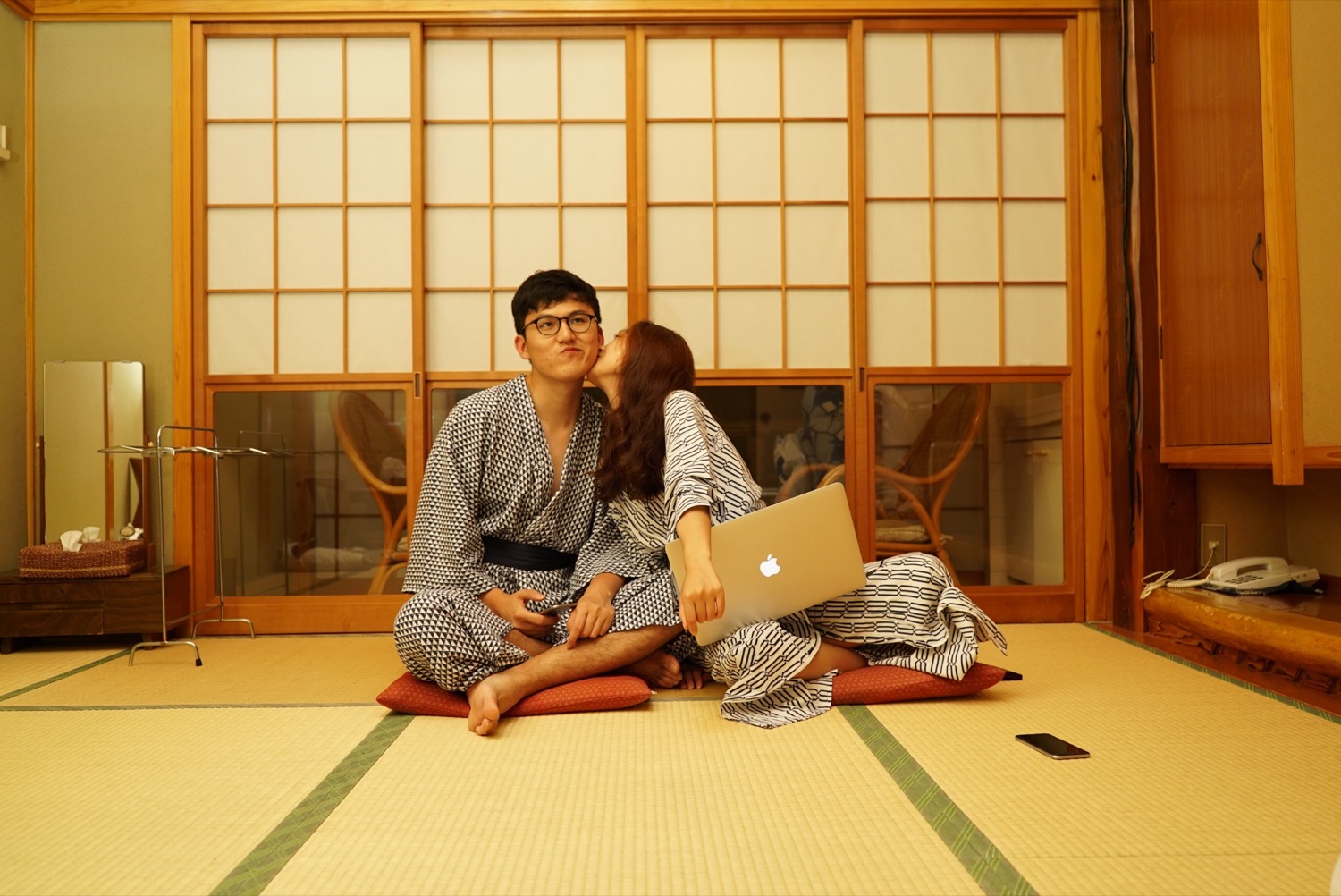 泡完温泉,回到房间,把被子移开,把闪光灯架起来,跟妹纸玩起了榻榻米表情包。