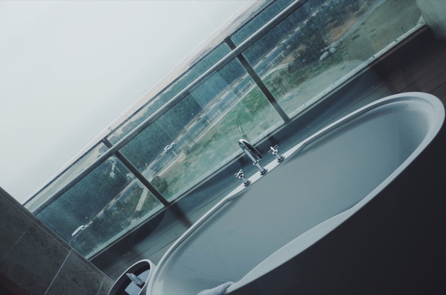 洗手间也是一面墙的玻璃,可以边泡着热水澡,边看海,当然,由于建筑角度,需要把一边的窗帘拉下来,要不就春光乍泻了。