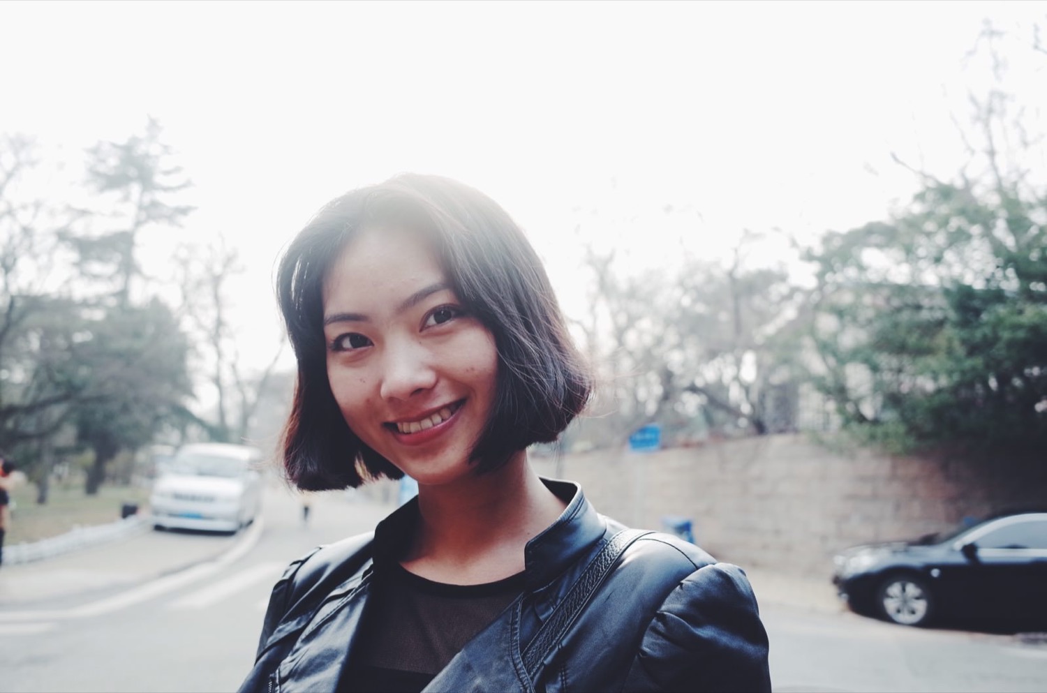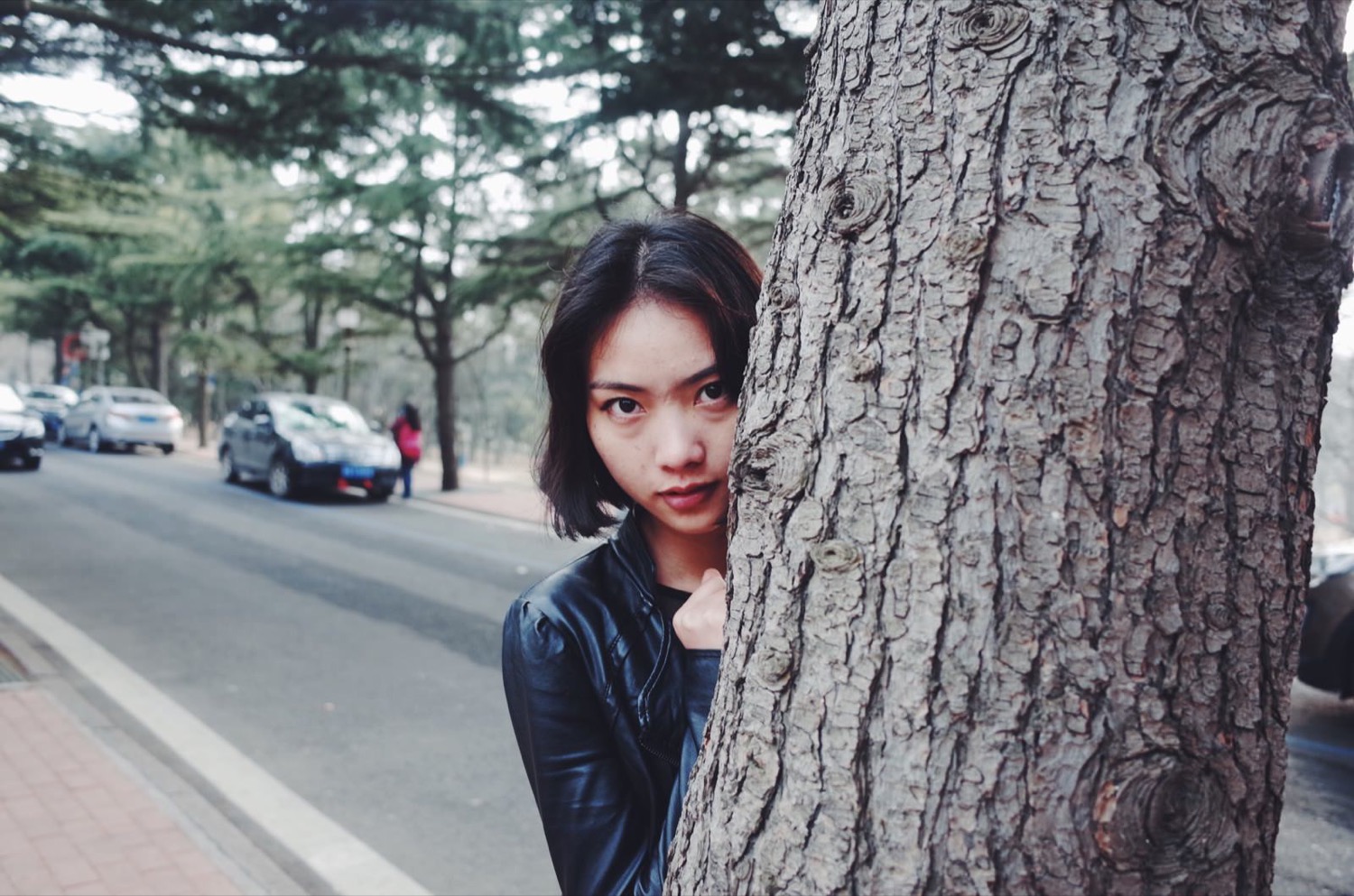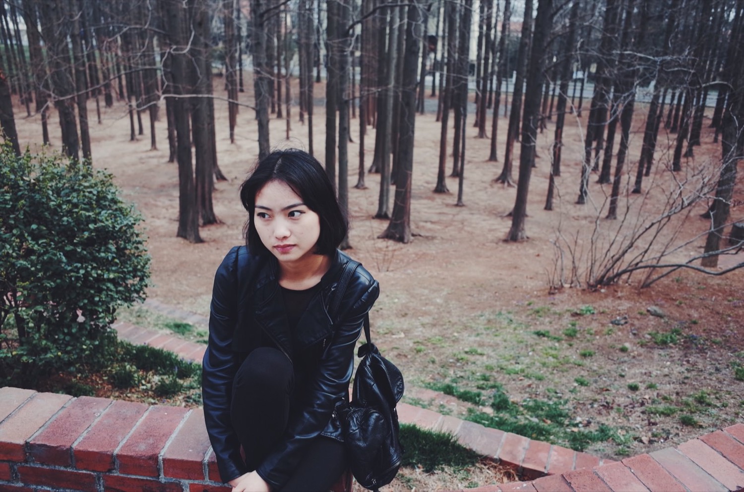 路边有一篇小树林,妹纸坐在旁边的矮墙上,摆拍一张。