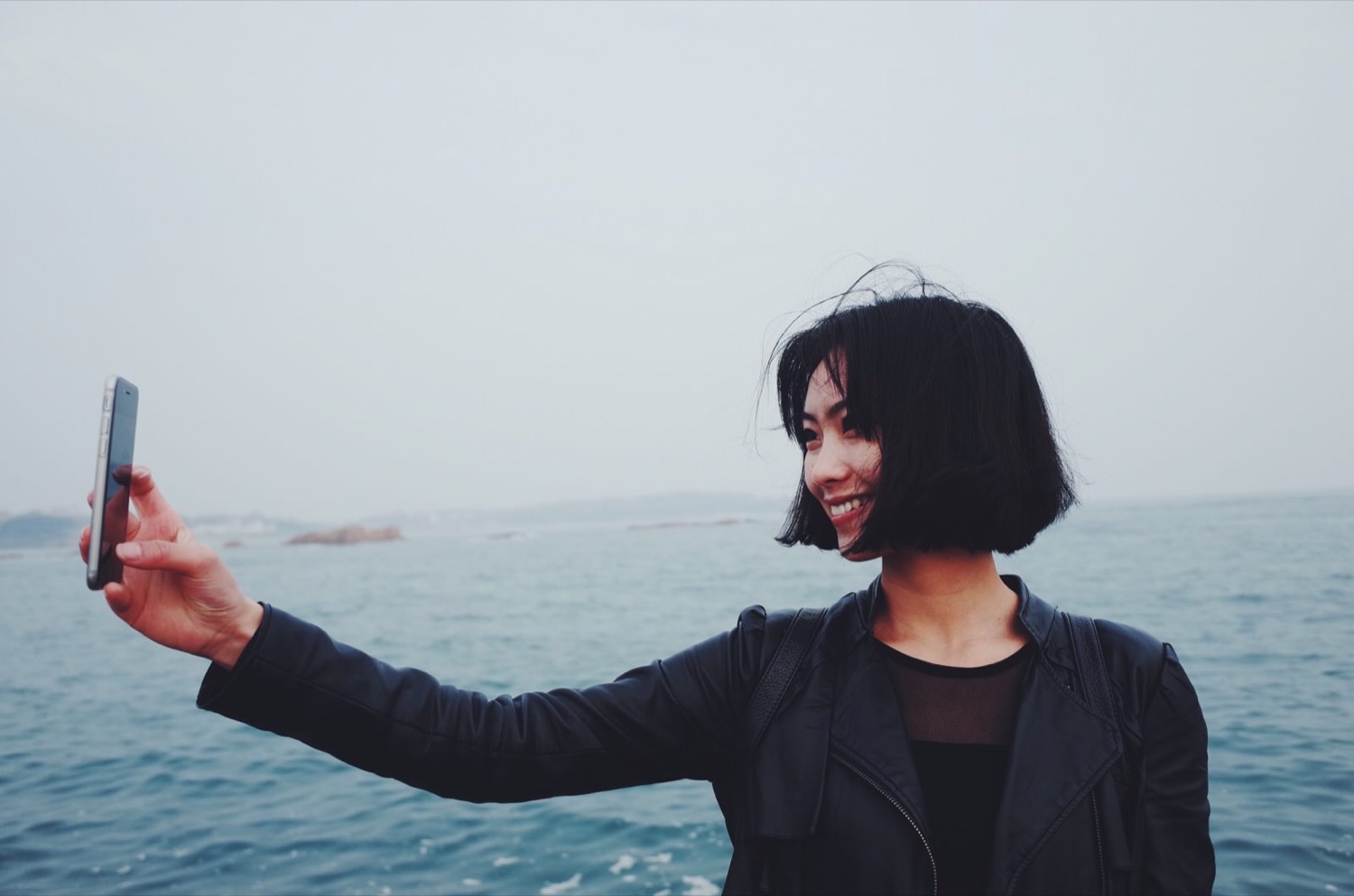 妹纸在用手机拍海,妹纸还是很喜欢海的。