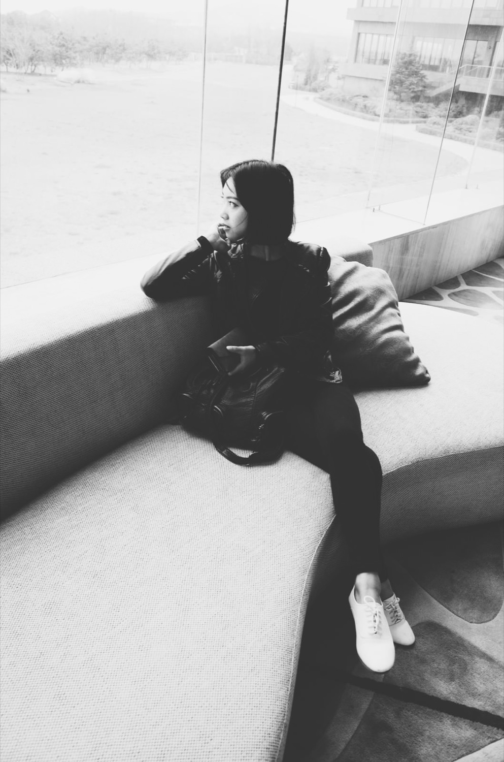 不像昨天,天气灰蒙蒙的,玻璃上映着背后的沙滩和大海,海浪还挺大的,想一想过去见过的海滩,深圳、惠州、珠海、秦皇岛,这次青岛的银沙滩,应该算是干净、安静的一个,挺适合来当放松心情的一个地方。