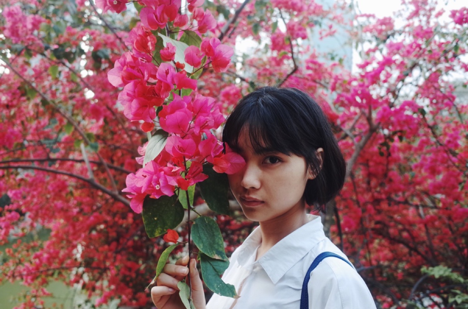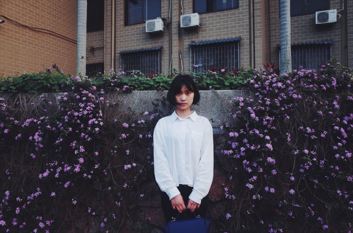湖边的留学生宿舍,墙上开满了紫色的蔷薇,恰好墙上有一处空缺,叫妹纸站到中央,咔嚓记录这一瞬间。