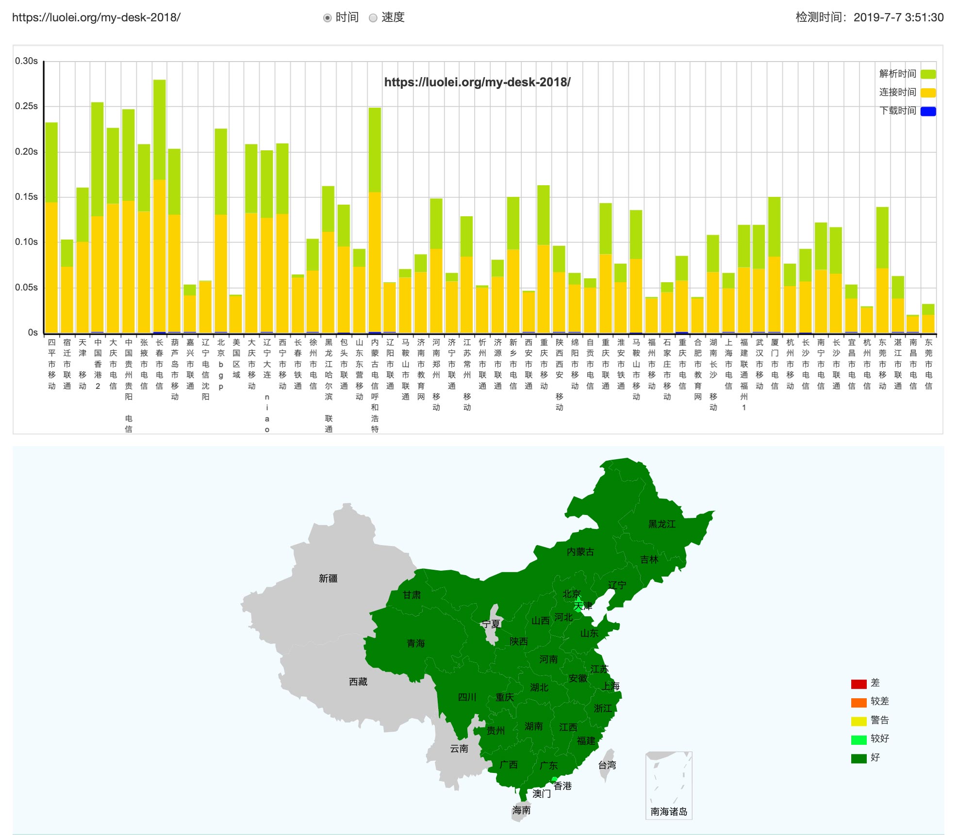 有nginx缓存的情况下,全国测速大概这样的情况,比较欣慰,第一次见到自己博客一片绿。