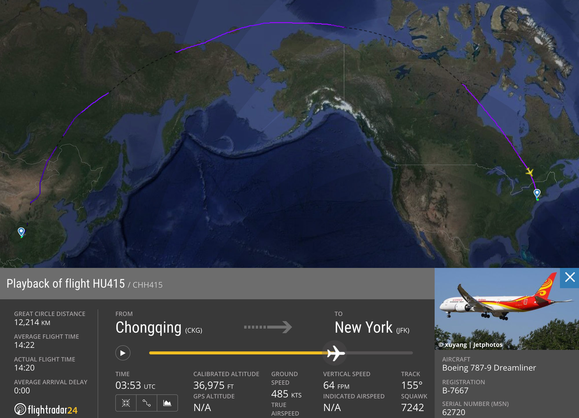 当日航班的航迹图,总共飞行了 14 个小时,这也是我和老婆体验过的最长的一段飞行了。