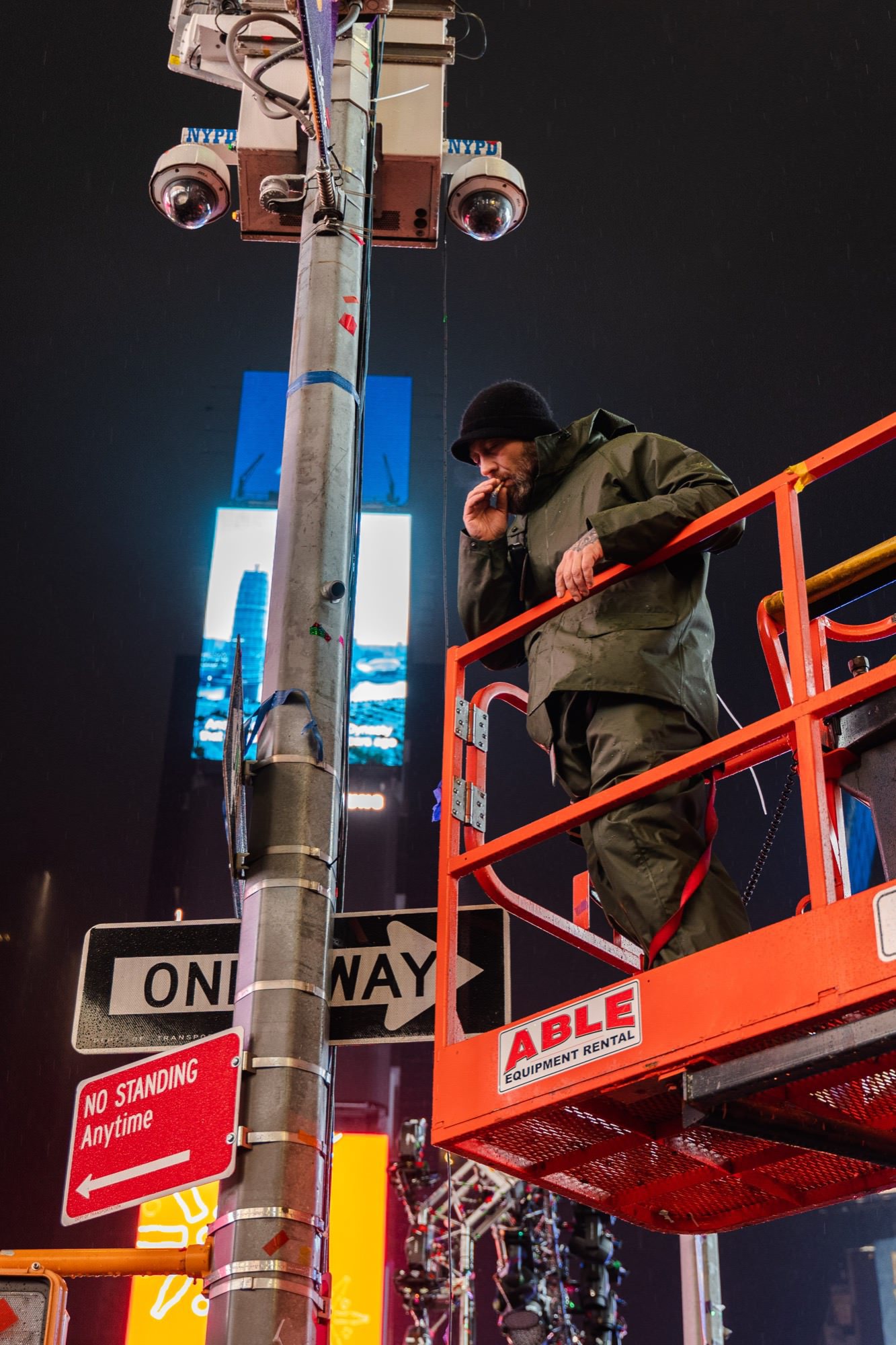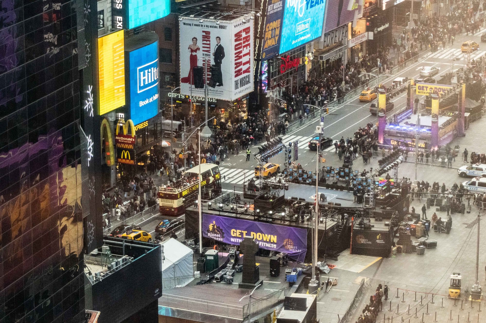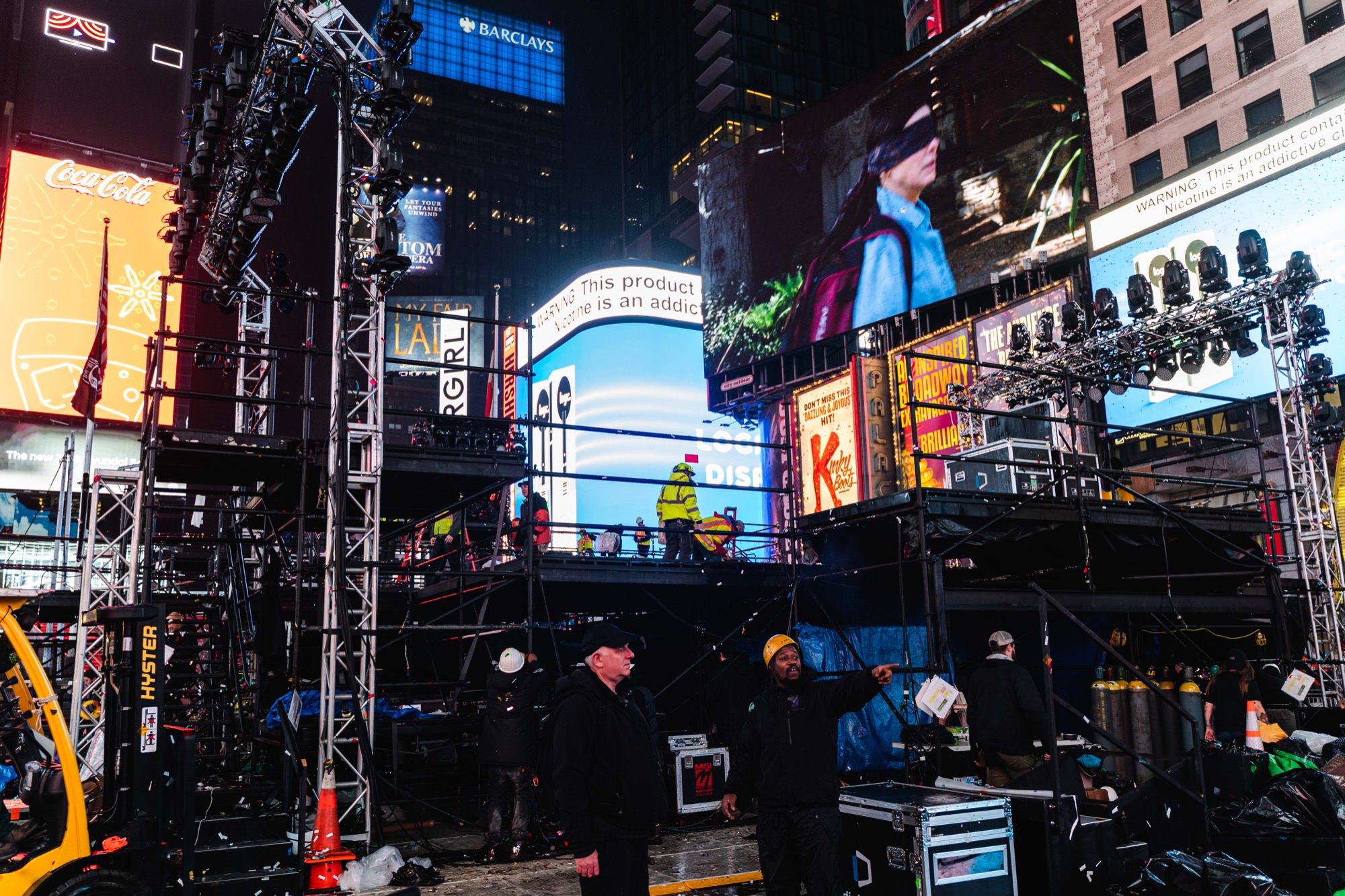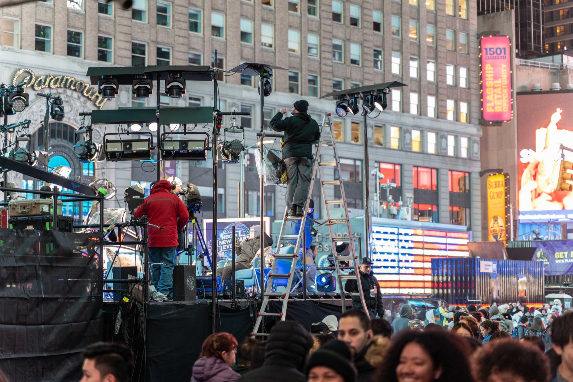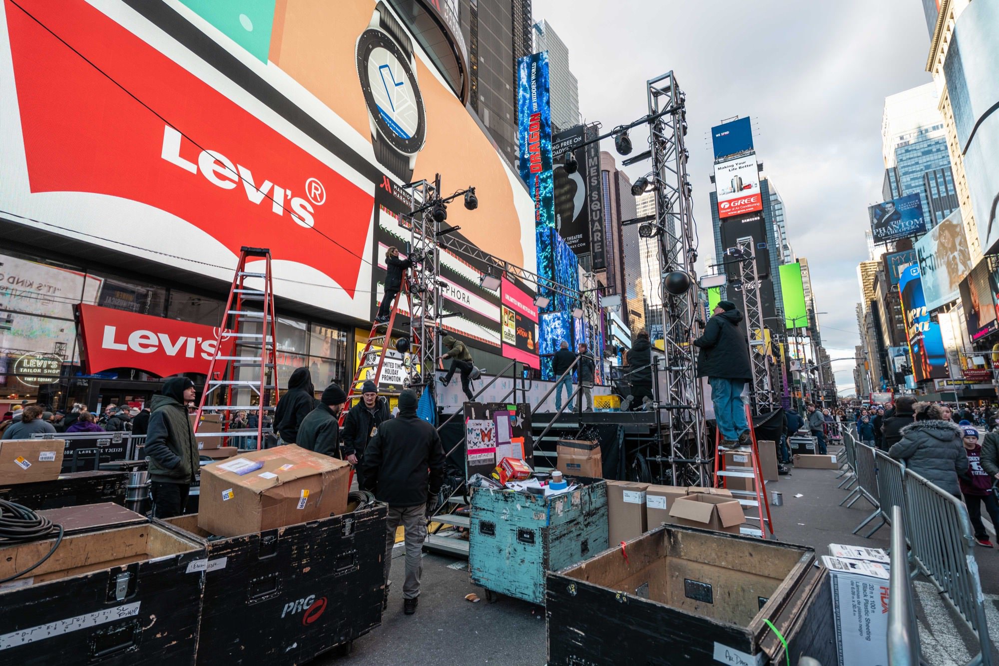 临近跨年,街头正在搭建舞台的工作人员,12 月 31 日晚,时代广场将聚集来自全球的几十万人。