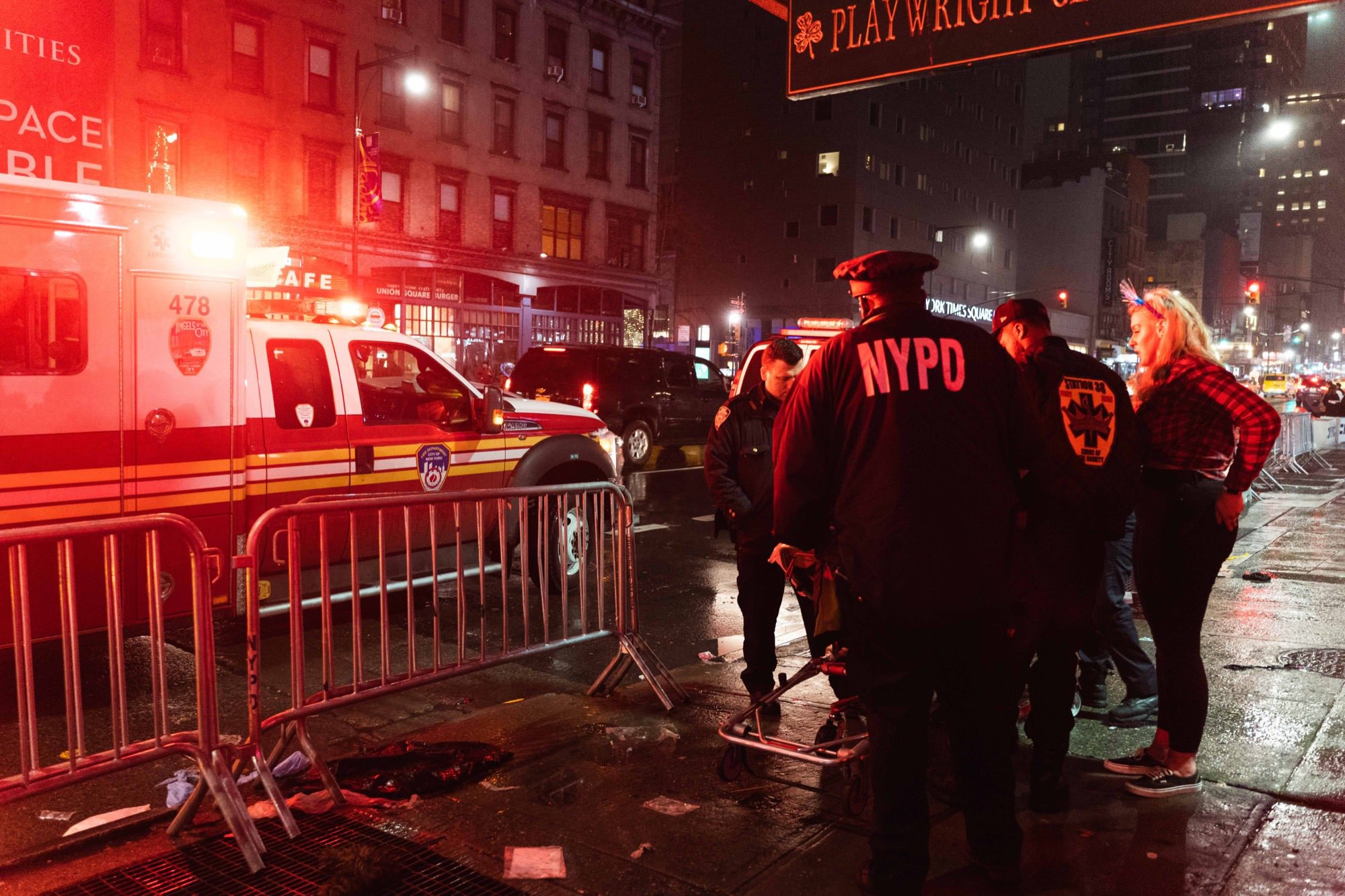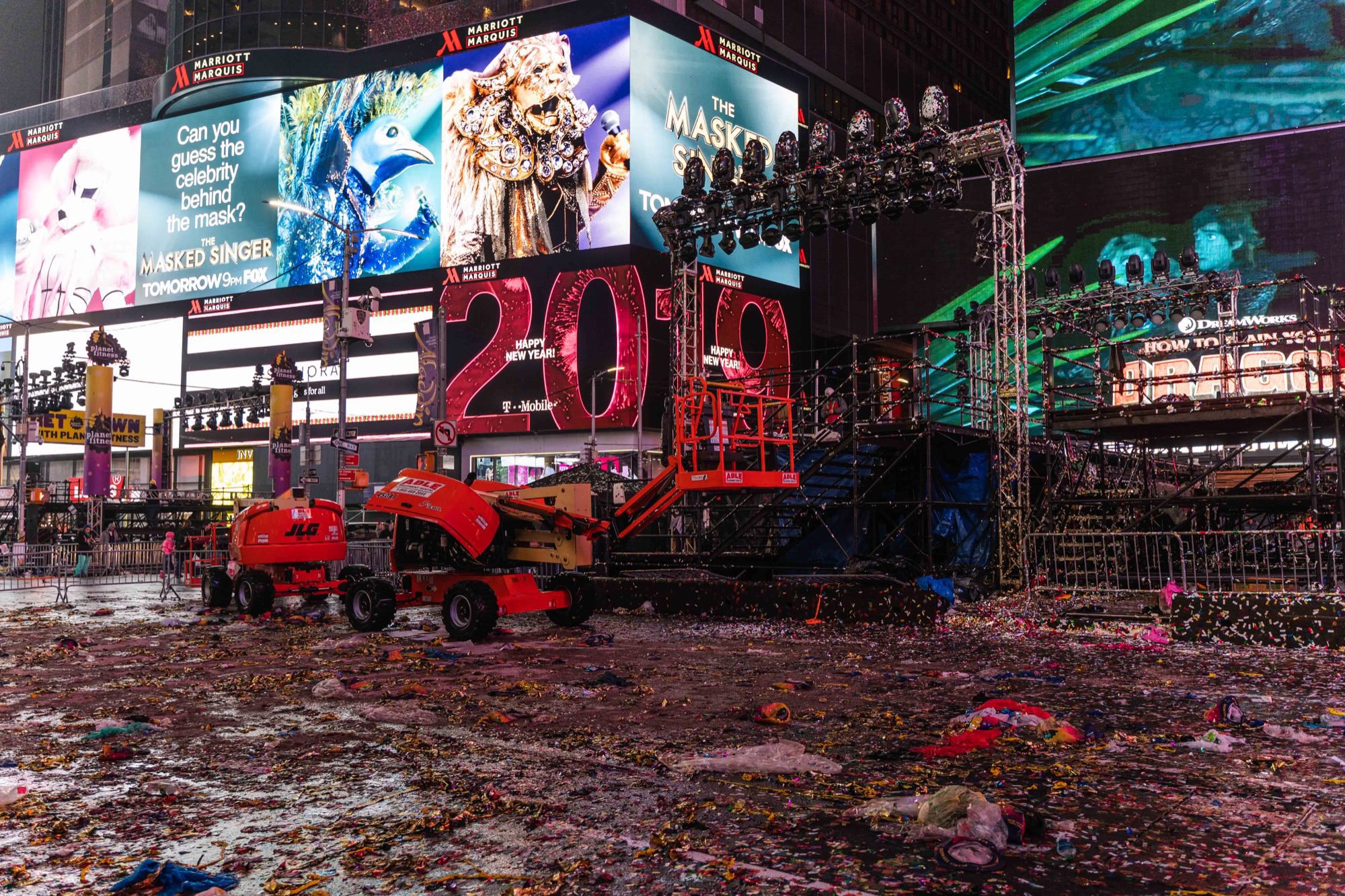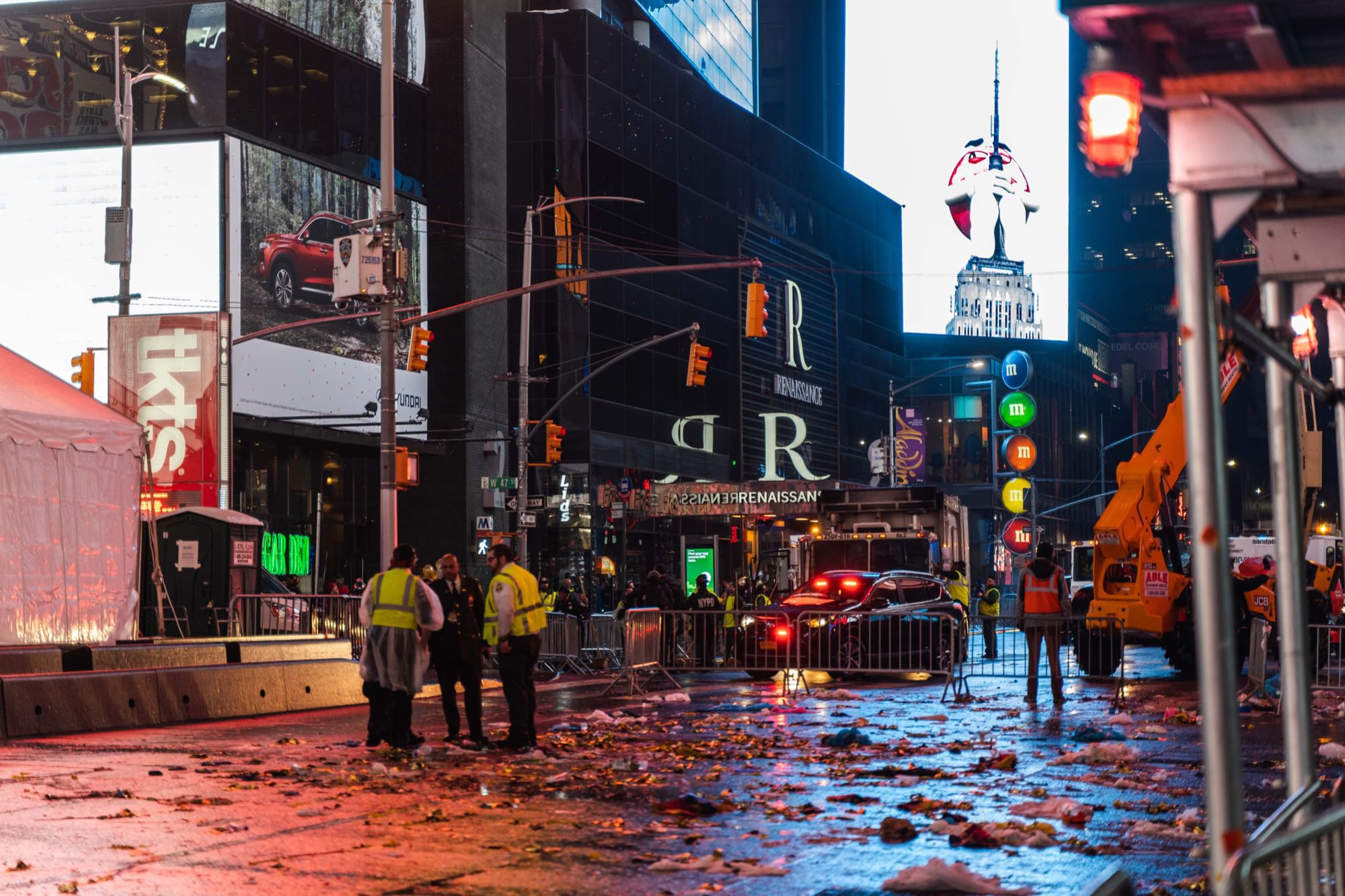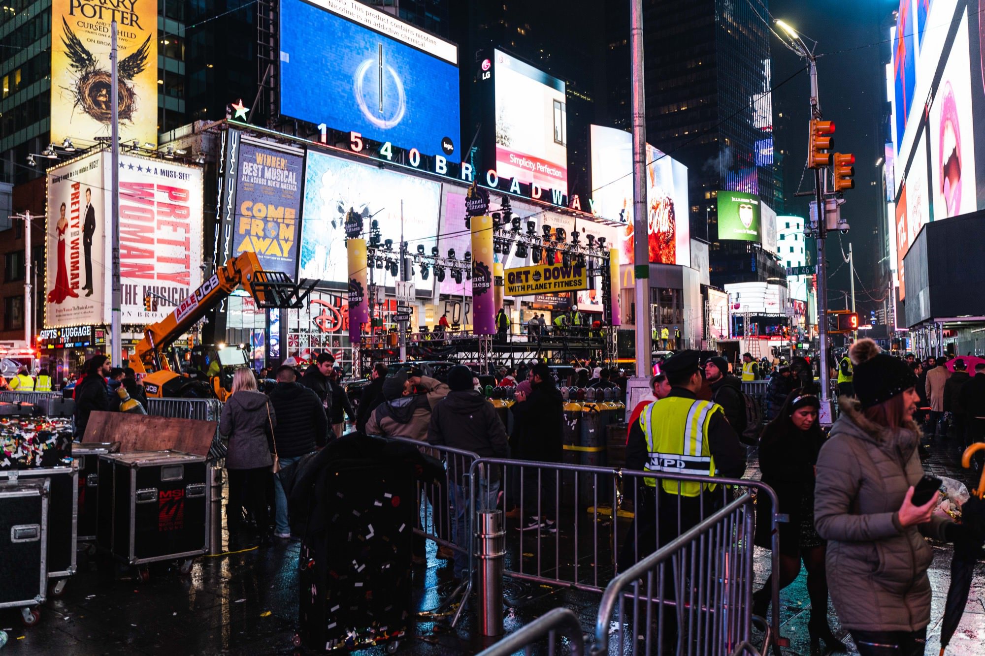 临近跨年,街头正在搭建舞台的工作人员,12 月 31 日晚,时代广场将聚集来自全球的几十万人。