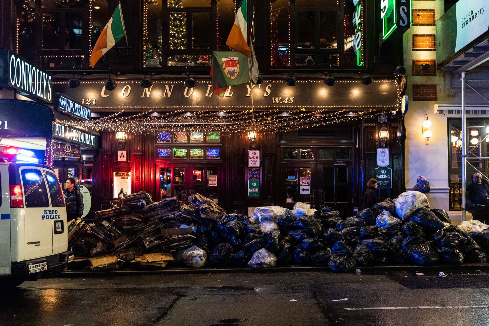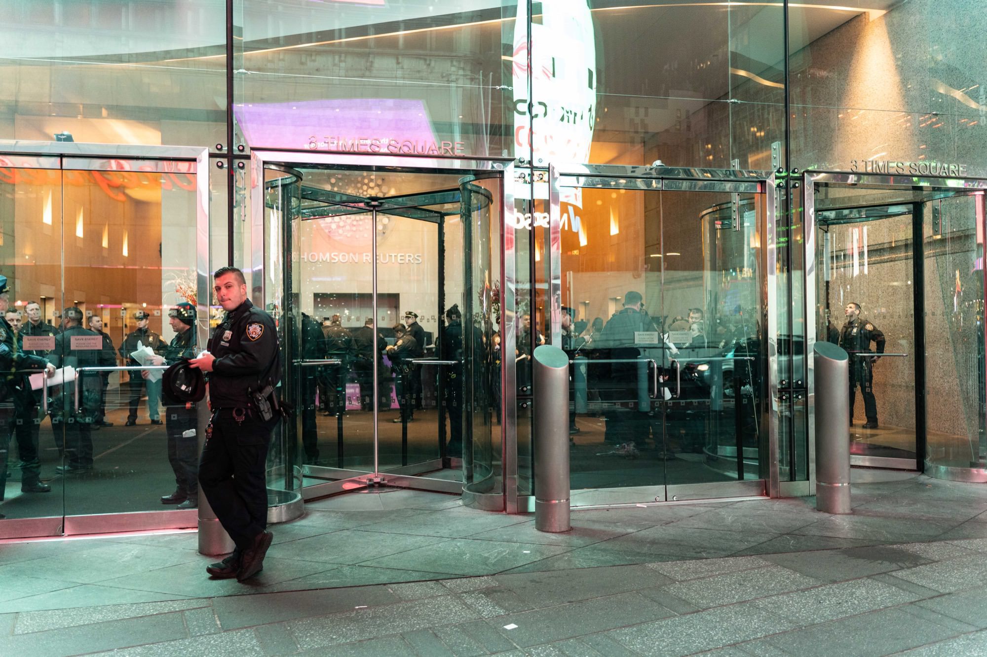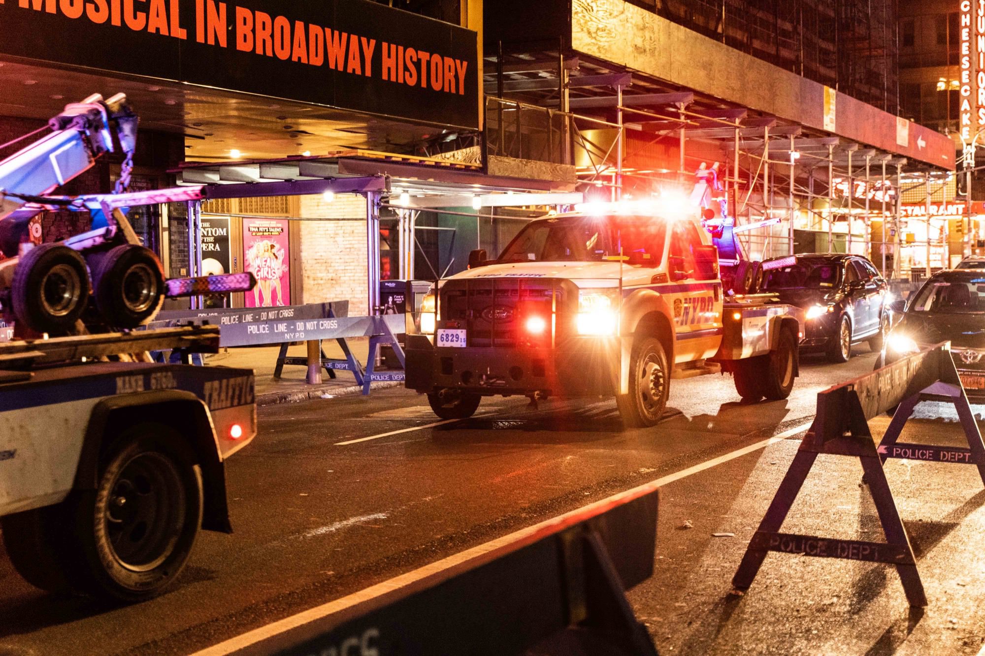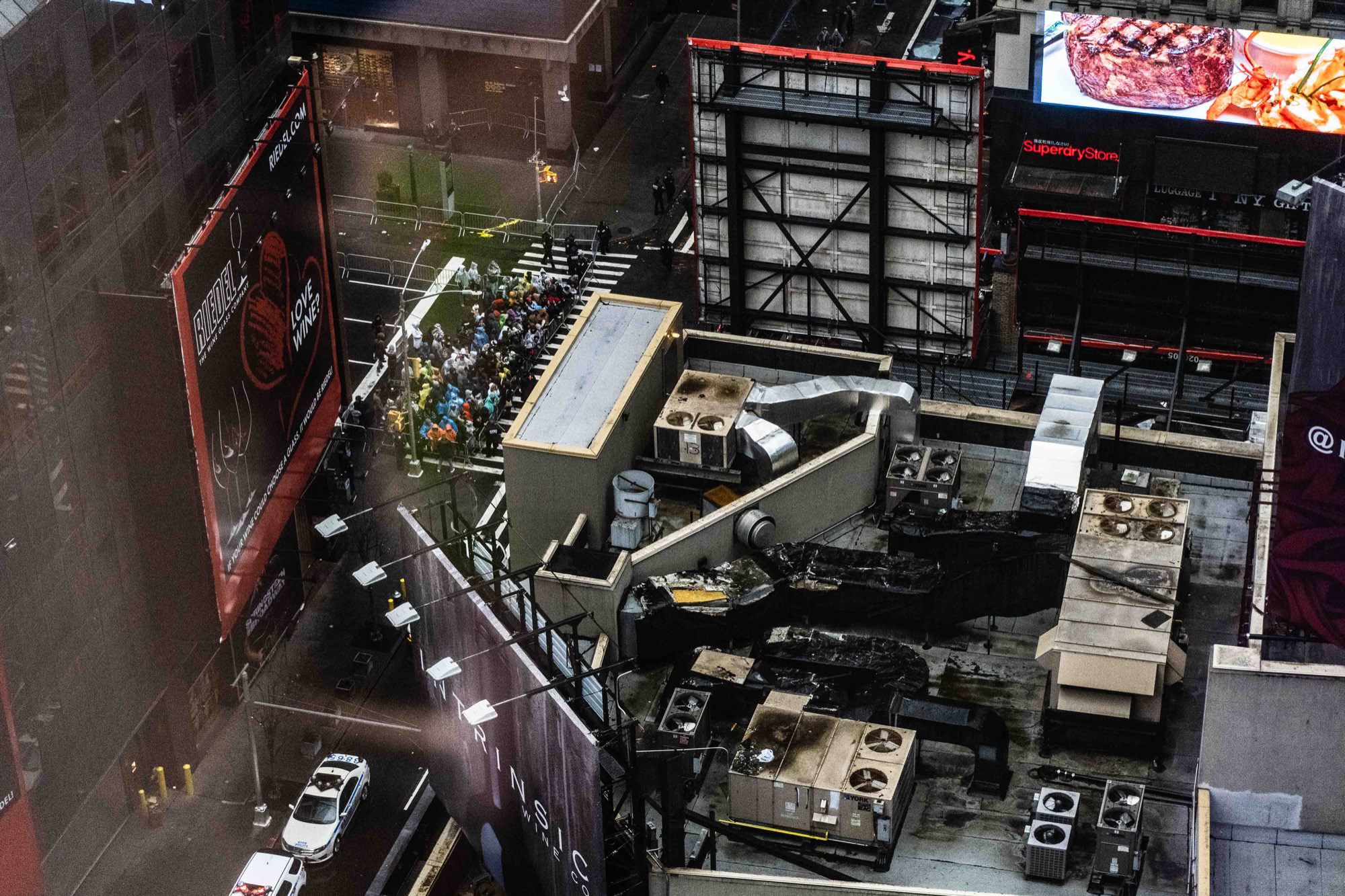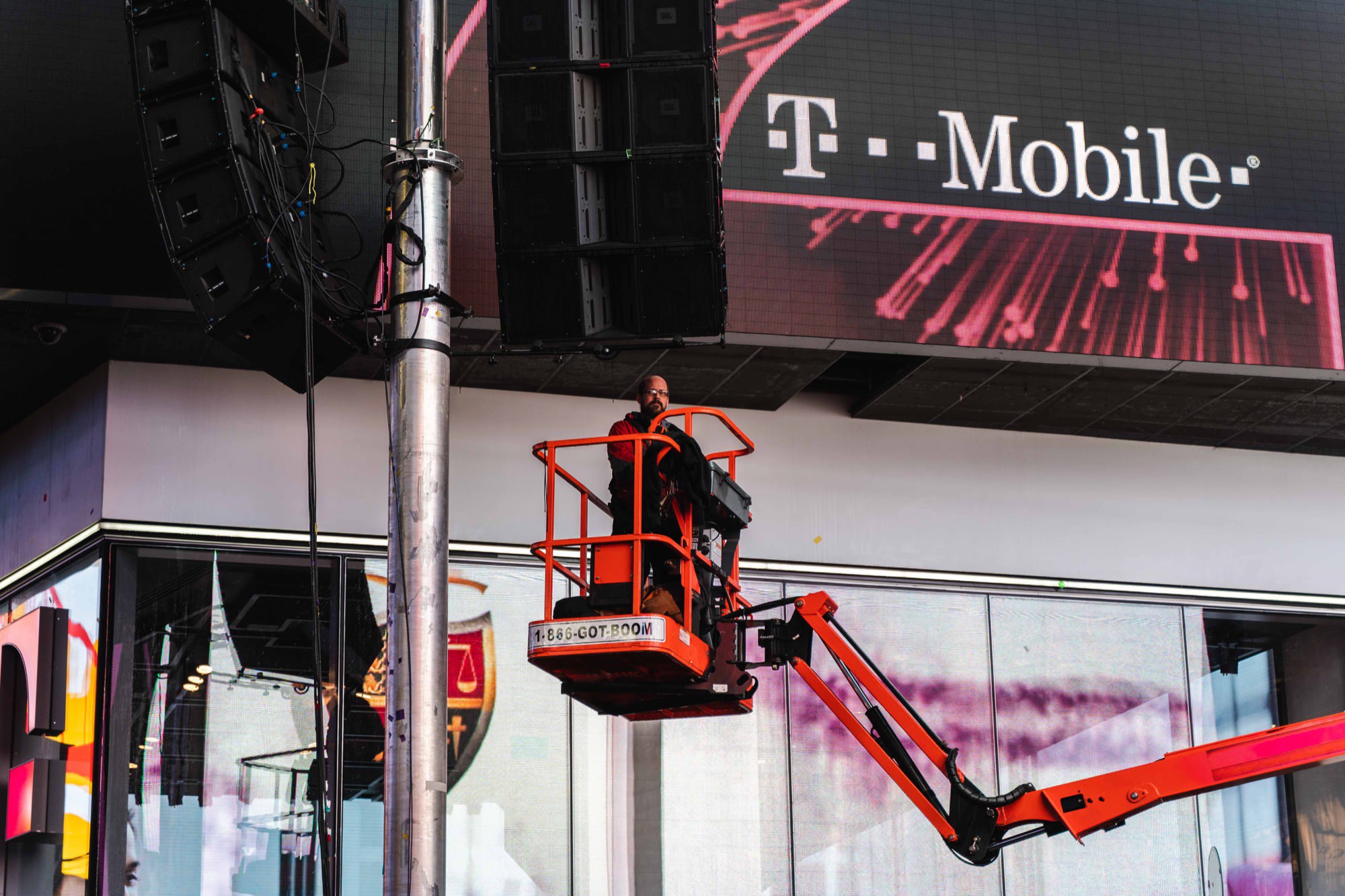 临近跨年,街头正在搭建舞台的工作人员,12 月 31 日晚,时代广场将聚集来自全球的几十万人。