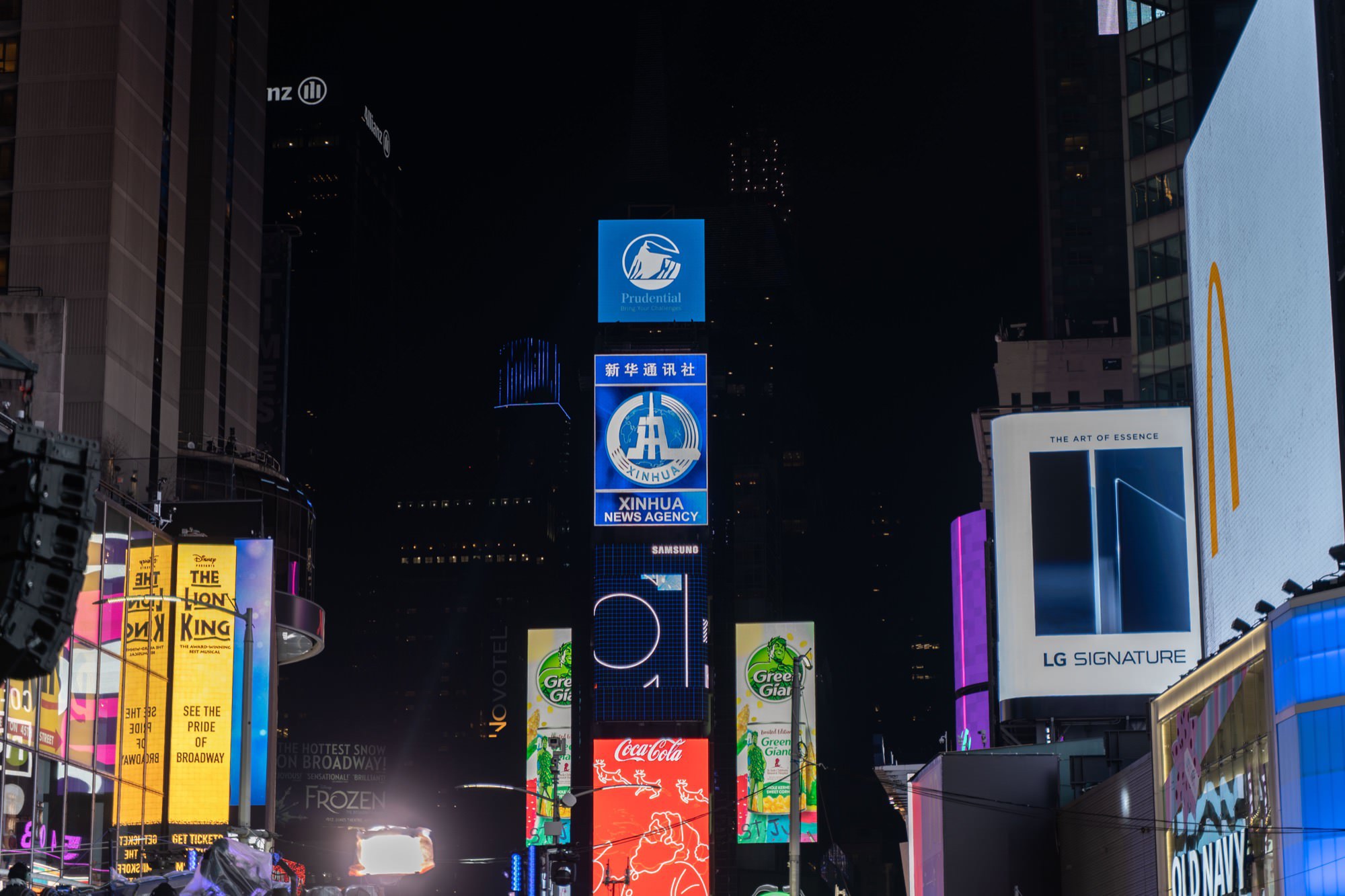 新华通讯社广告牌,常驻时代广场,话说新华社在时代广场也有办公室,跨年那晚我刷微博,看到一个新华社的员工在他们办公室发照片了。