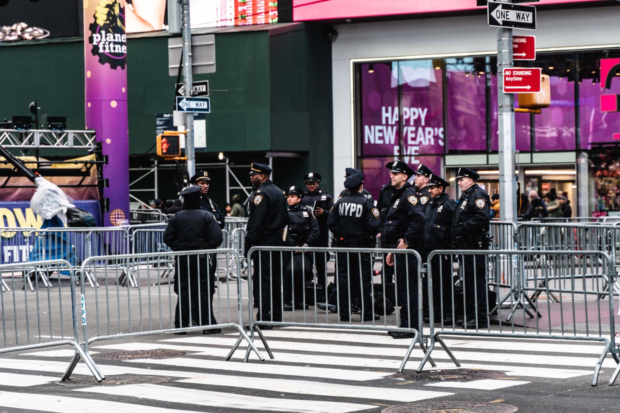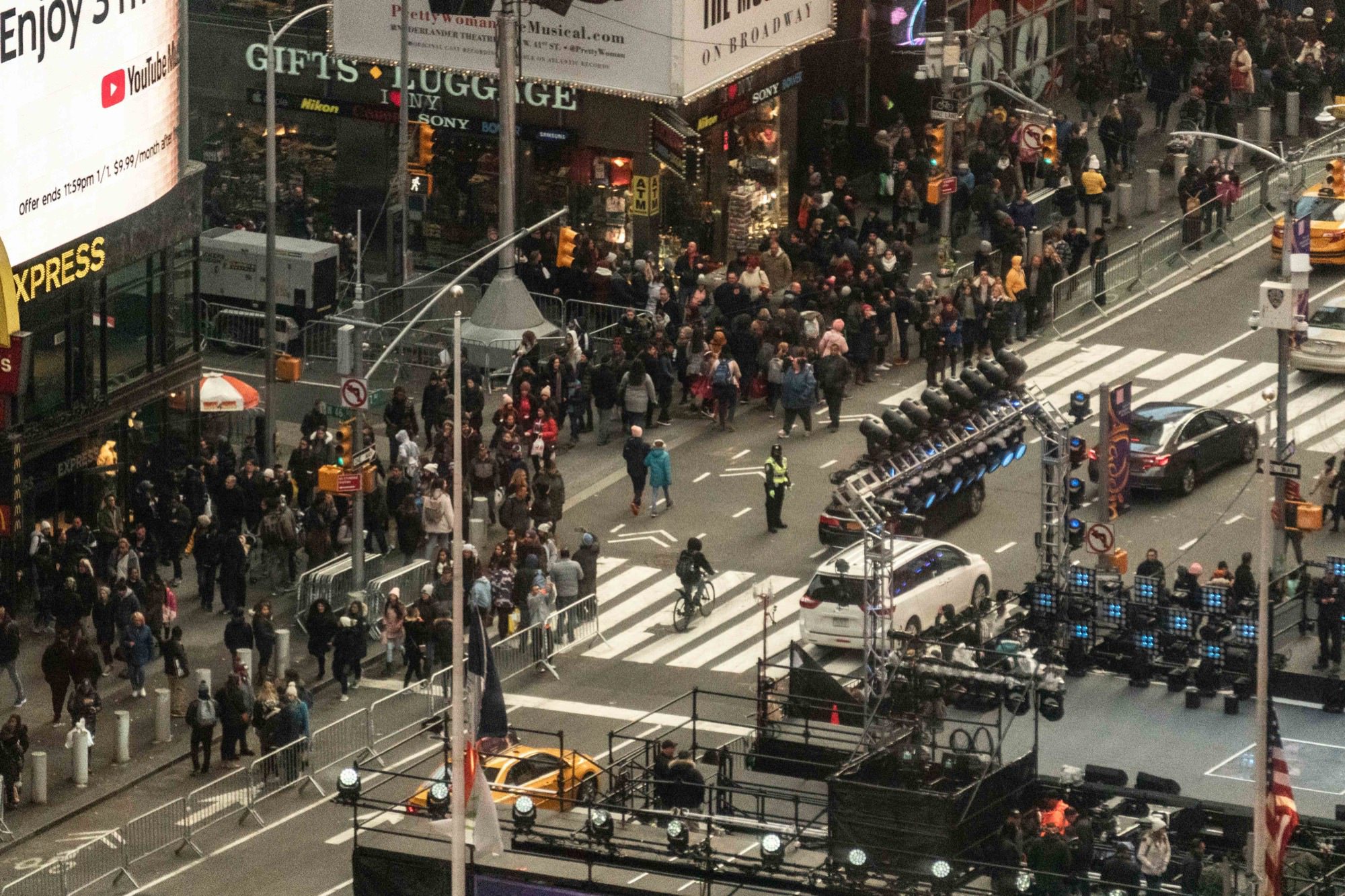 时代广场街道,人来人往,铁马也都部署好了,整体秩序还是挺良好的。