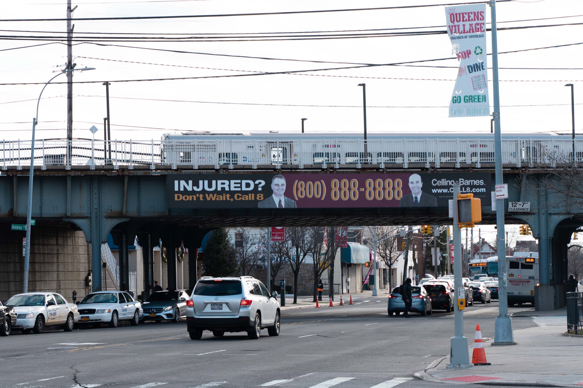 皇后区街头,桥上就是我们要坐的长岛火车,开往曼哈顿中心区。广告牌上这个电话号码挺好的。