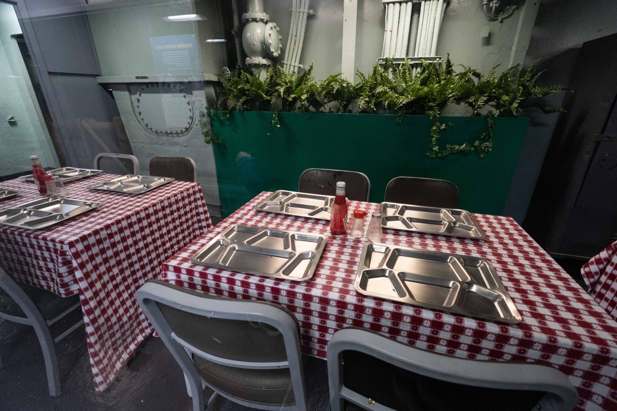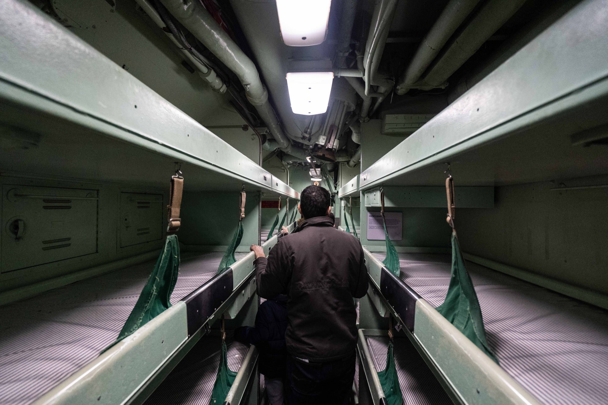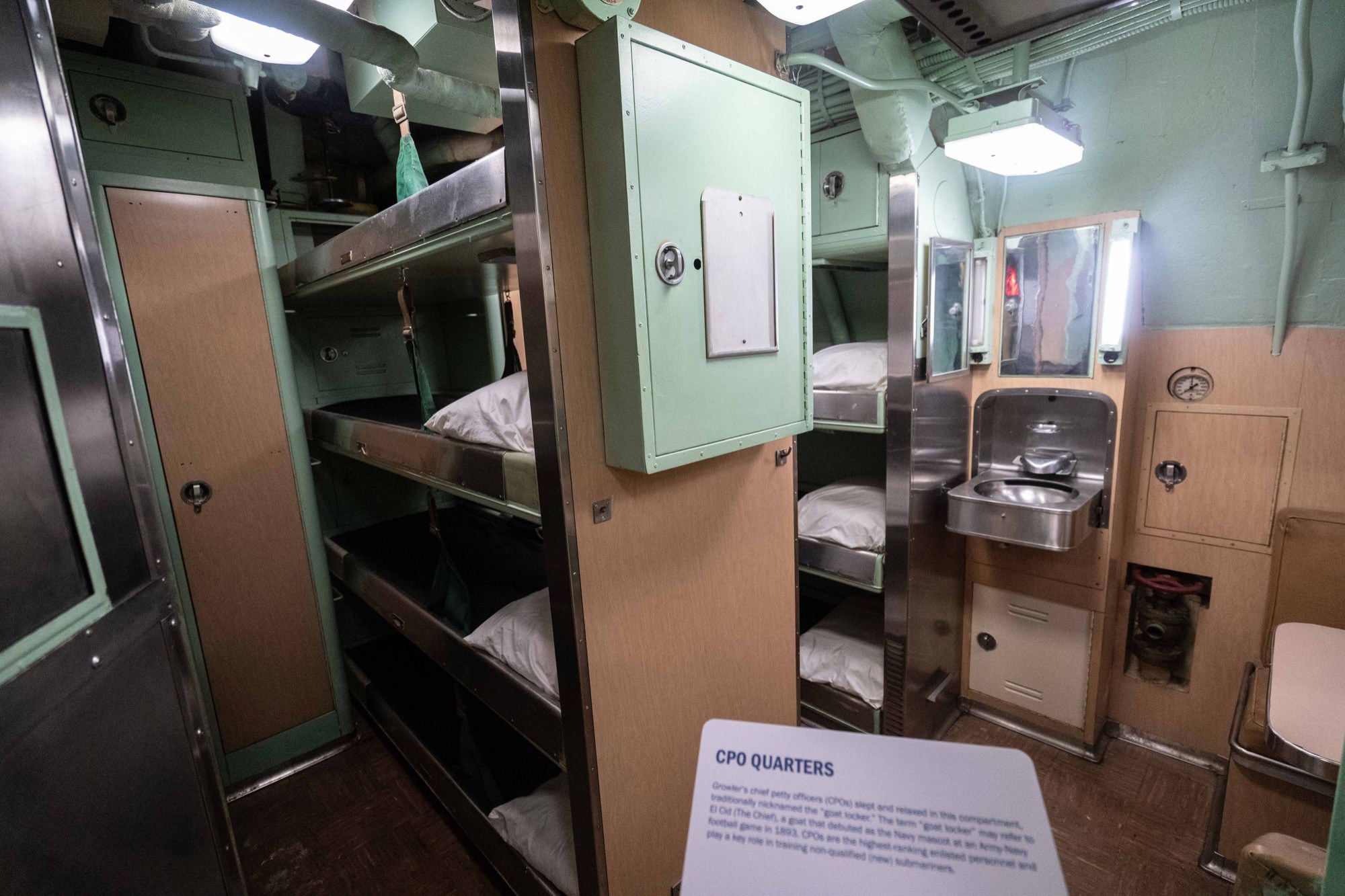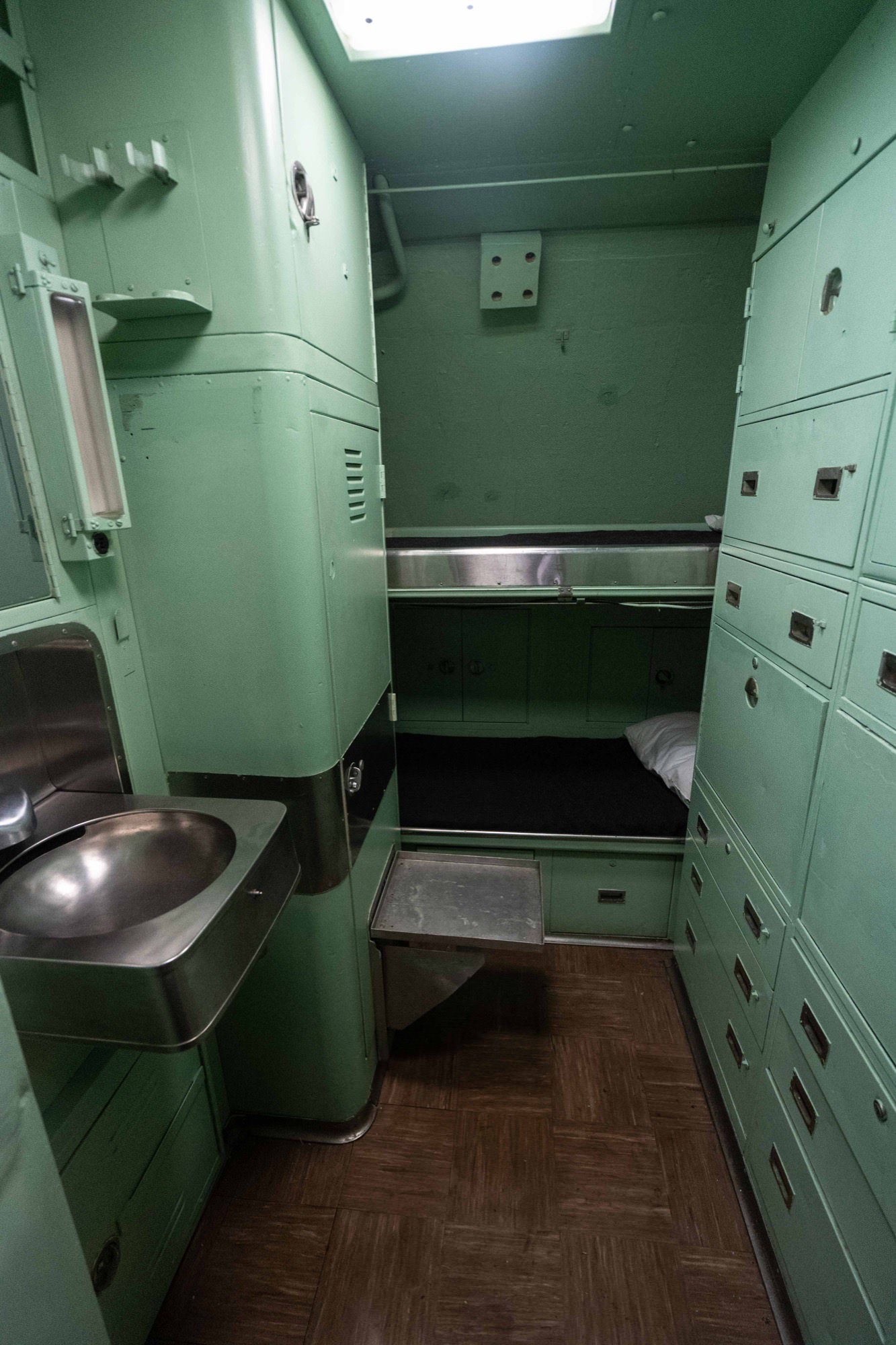 水兵舱,上下铺,很狭小,好像一般都是轮流使用。