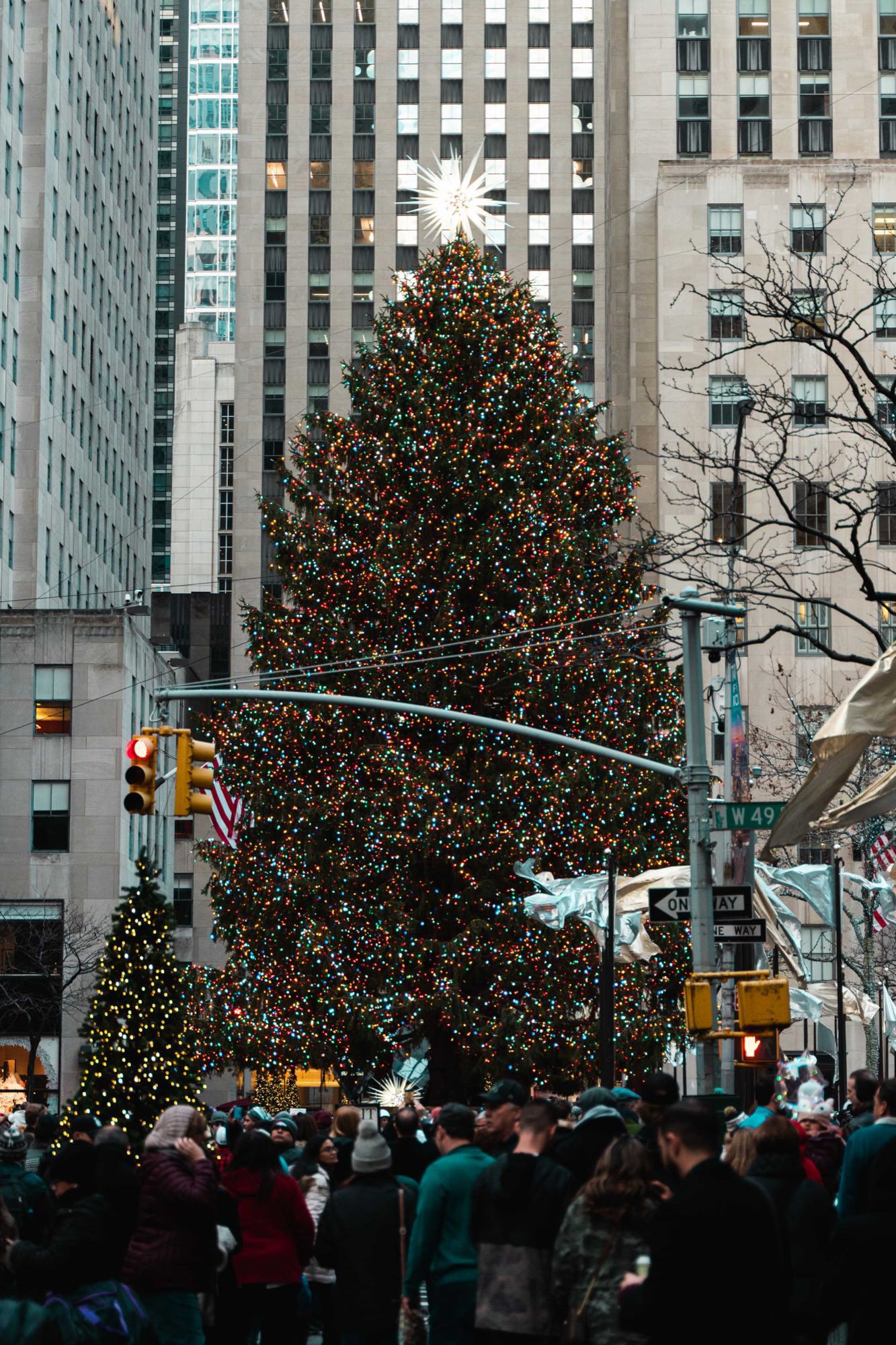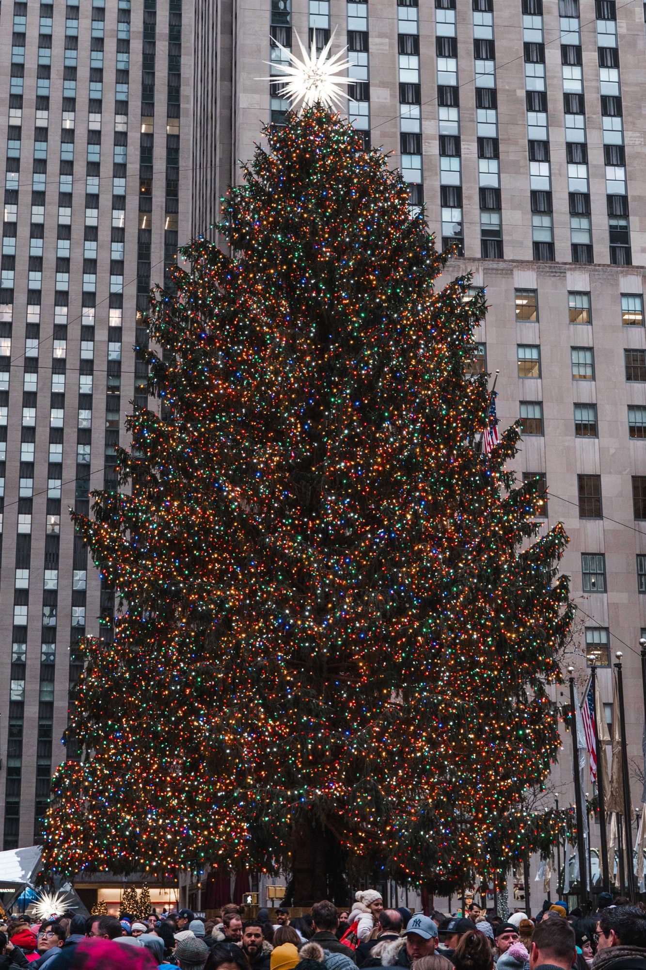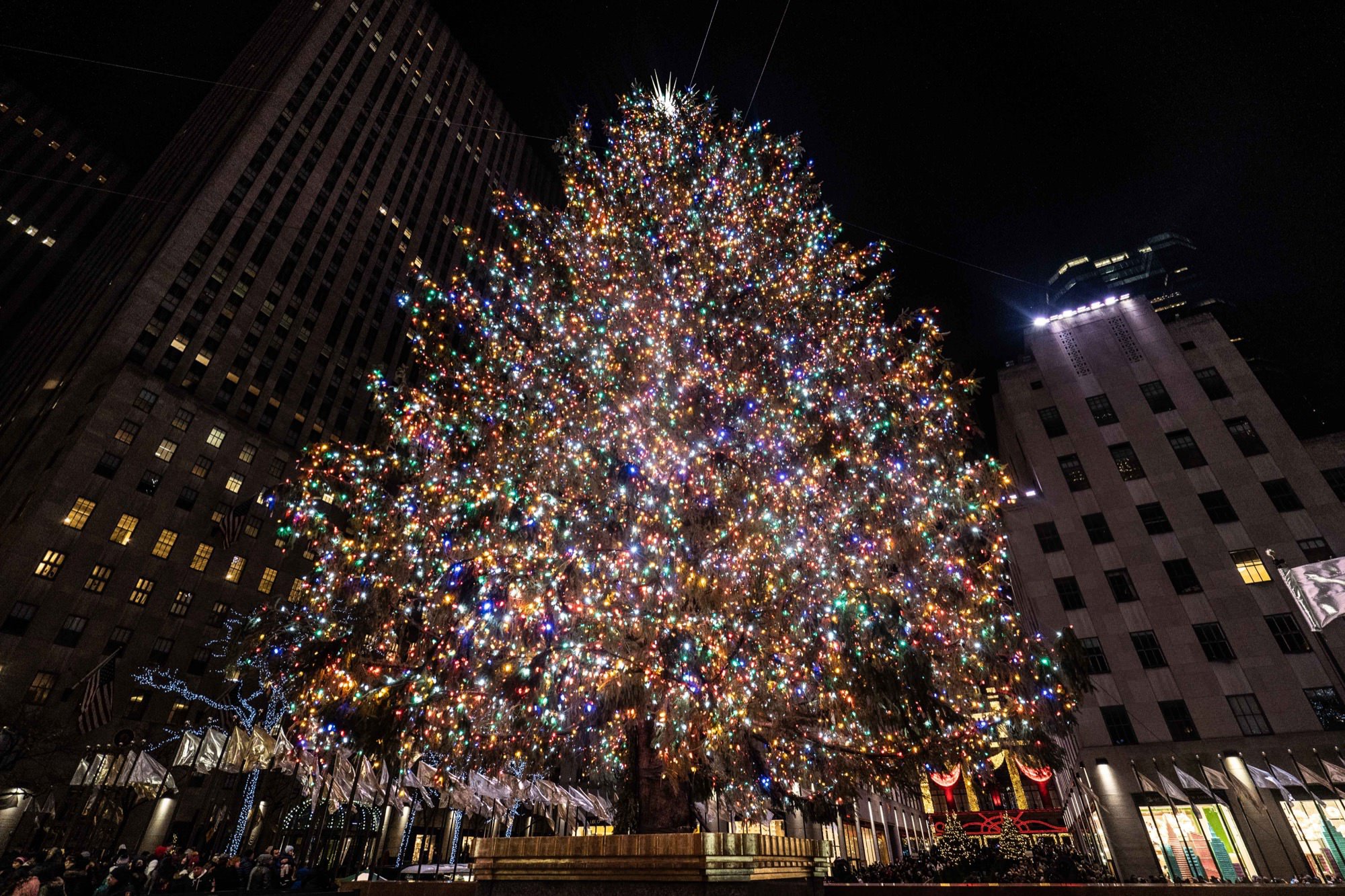 入夜了,洛克菲勒的圣诞树依旧闪亮。