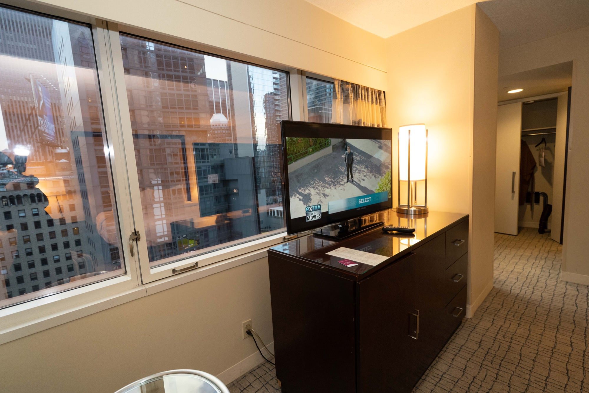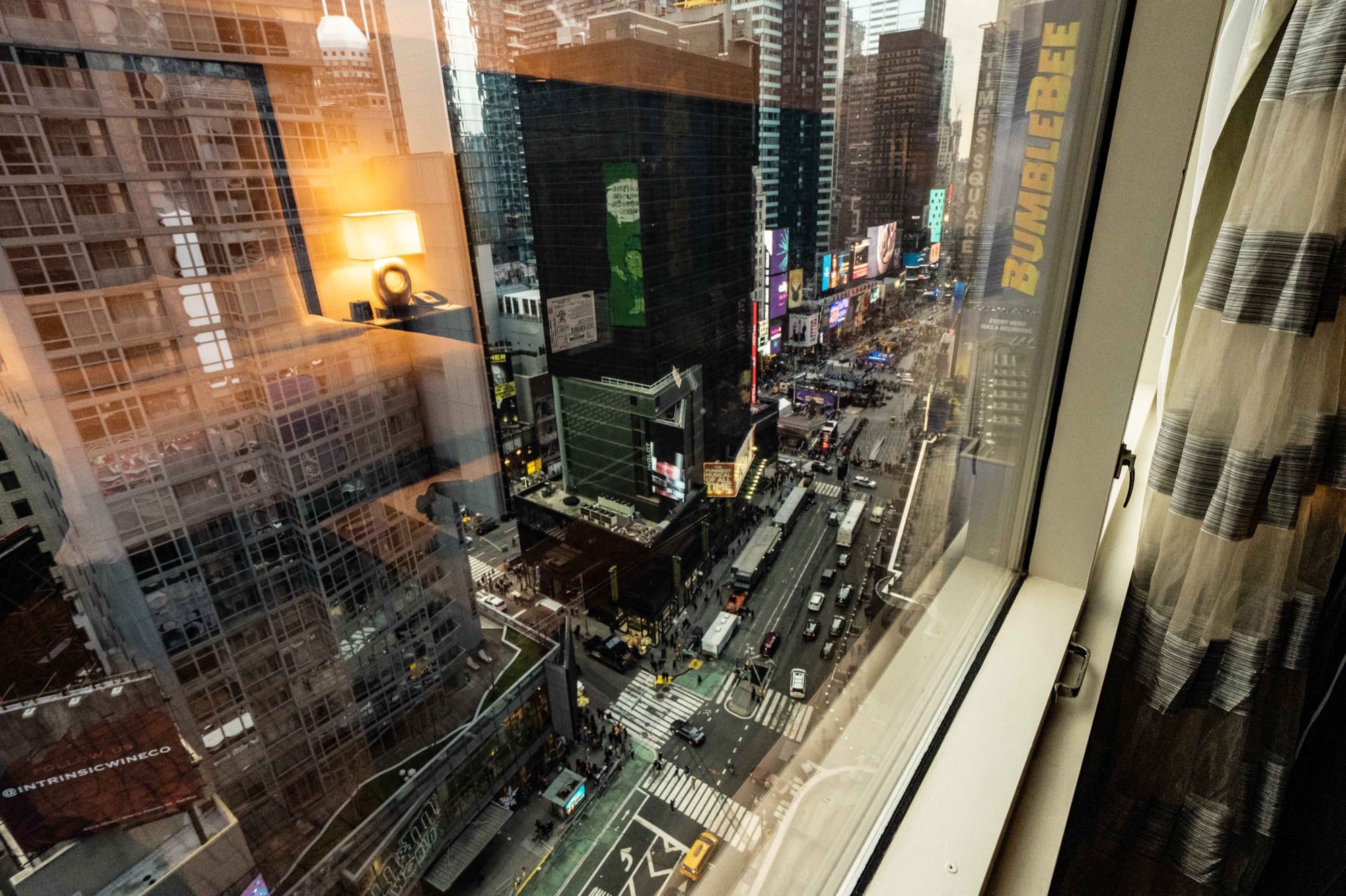 我订了两晚,房型是时代广场无烟特大床,拐角两面墙都有玻璃,能直接看到时代广场。