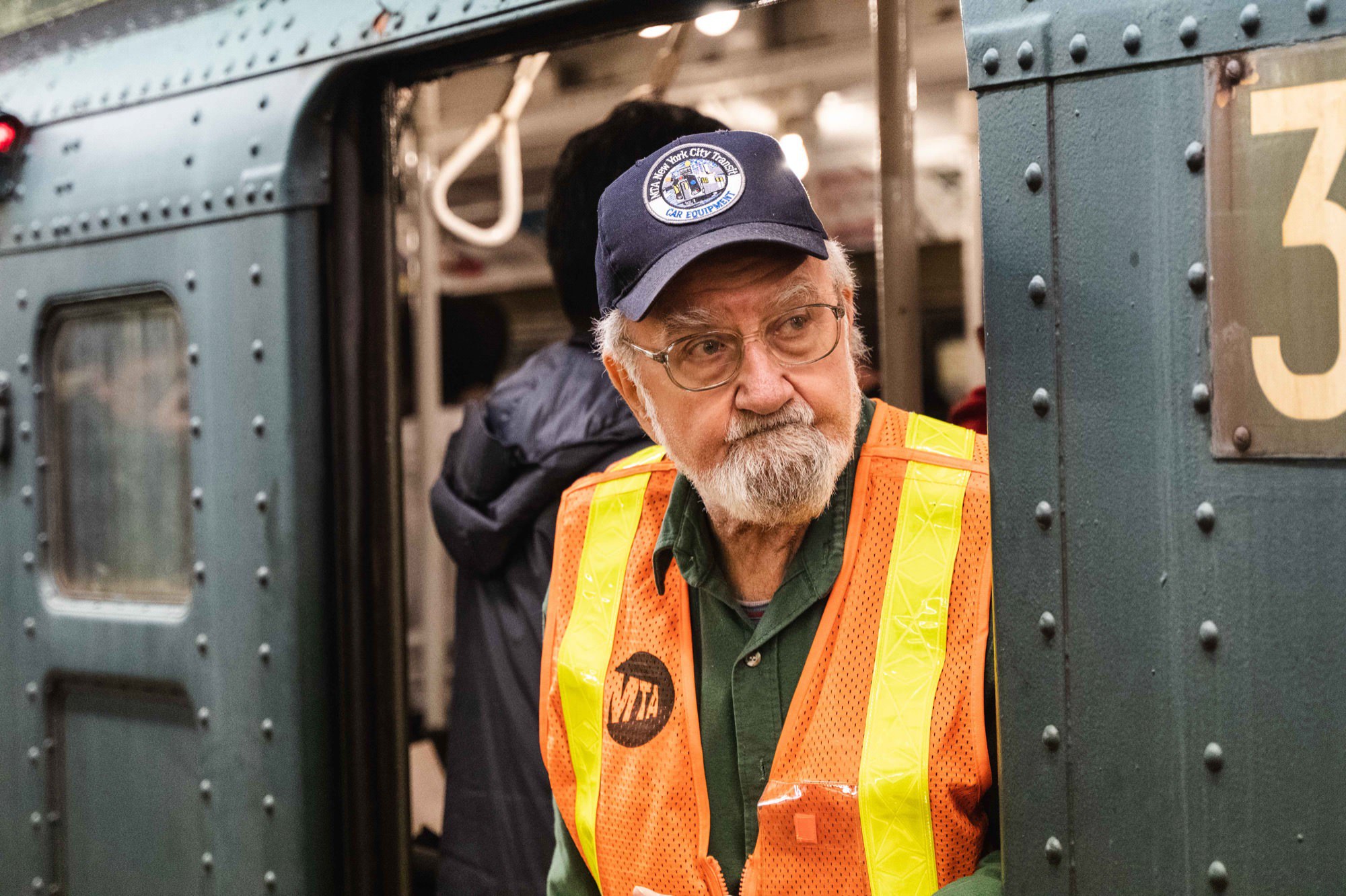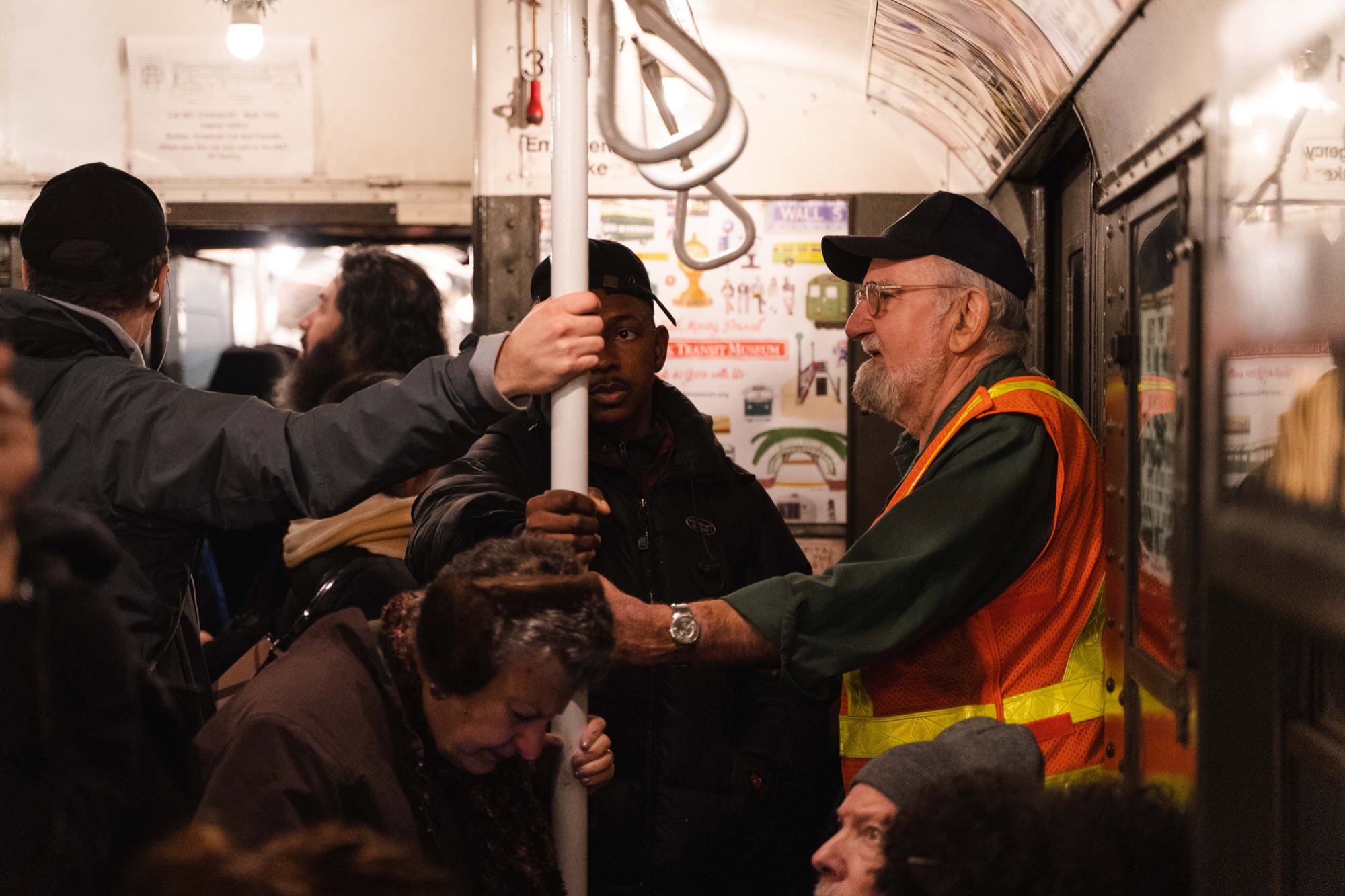 由于是老式车厢,车厢都要手动关闭,每个车厢都有一个 MTA 的员工,我们这个车厢的老头长得还挺有味的。