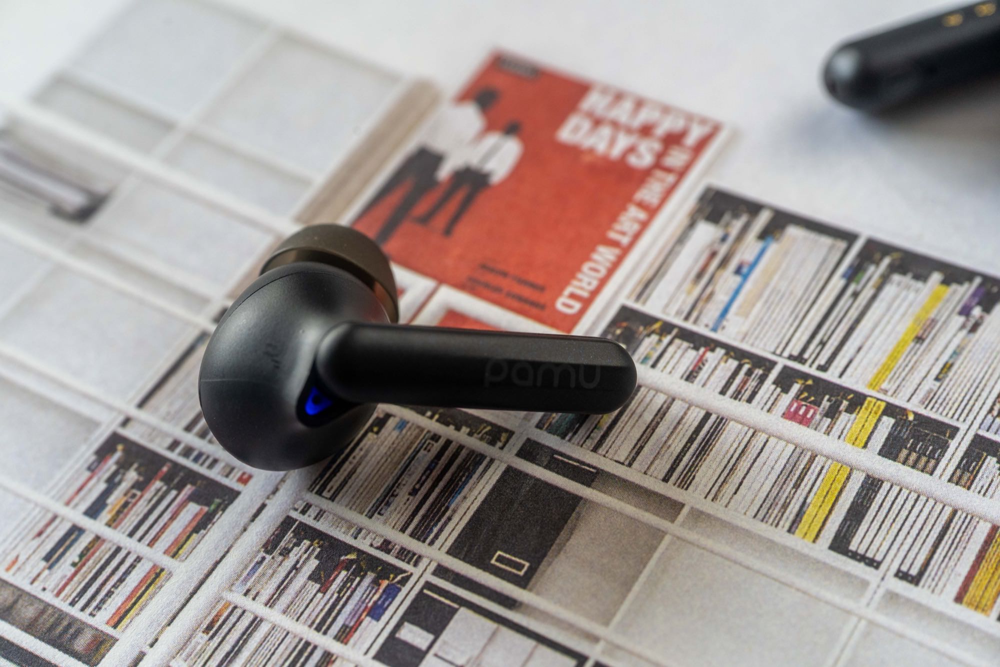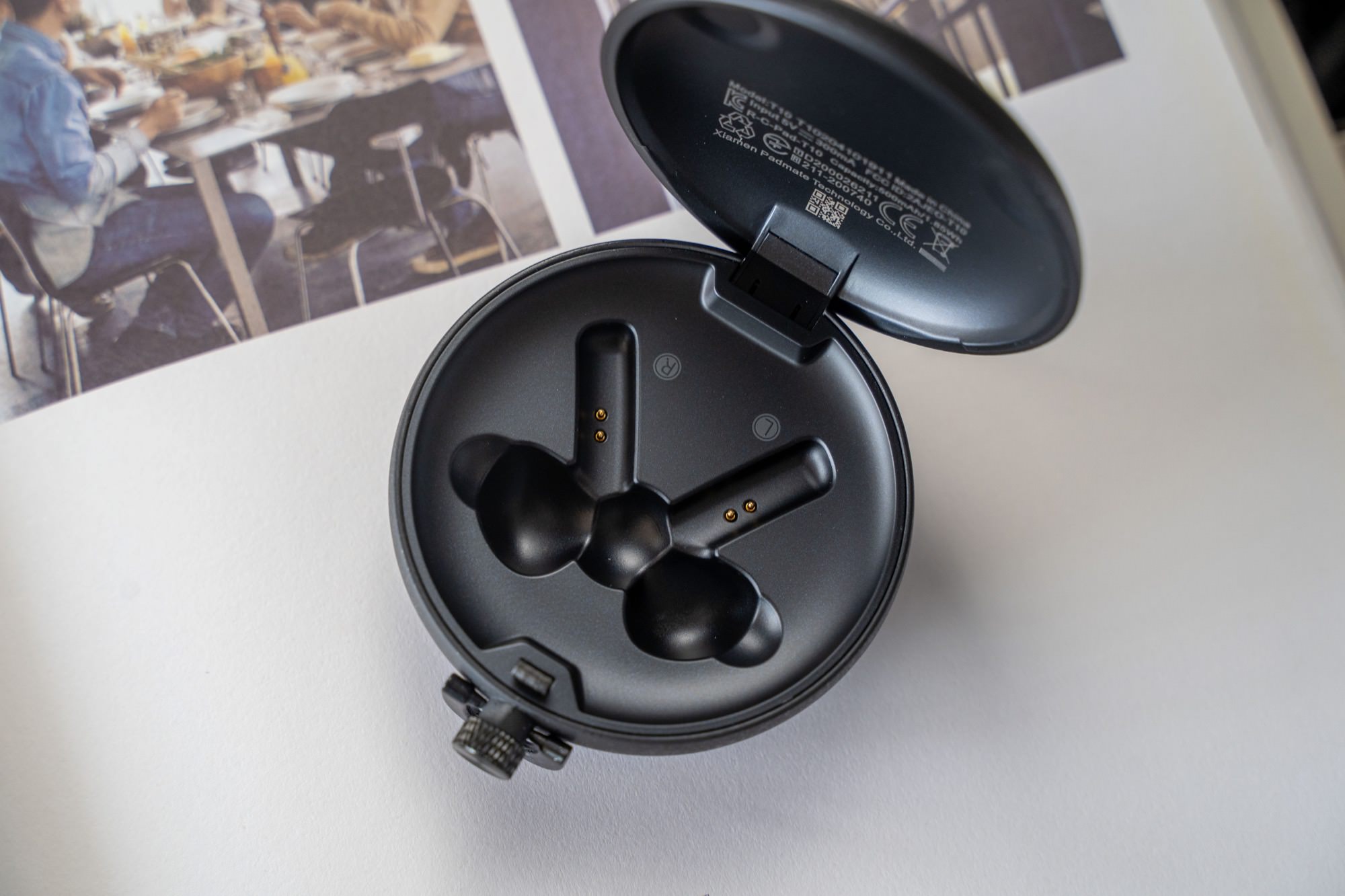 耳机盒的打开方式也很特别,按一下顶部的扣子按钮,就弹开了,露出了耳机真身。