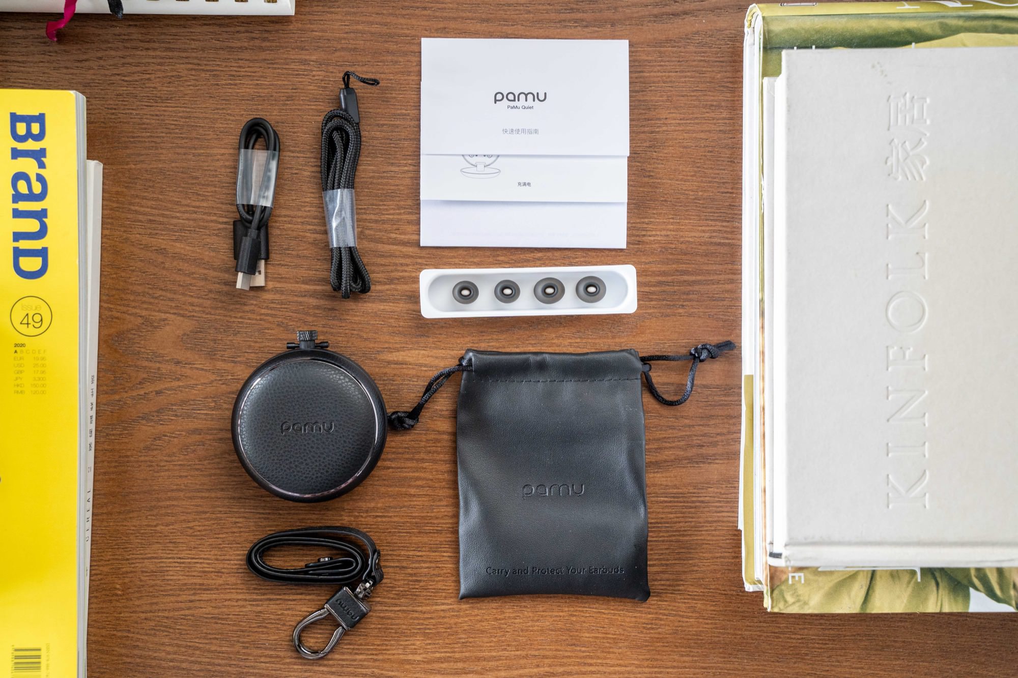 这就是盒内的所有配件,除了耳机本体、充电盒,还送了两对不同大小的可替换耳塞,一个收纳袋,一根挂绳和充电线。