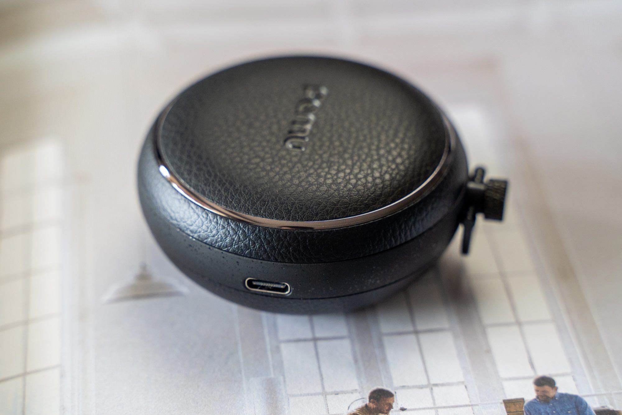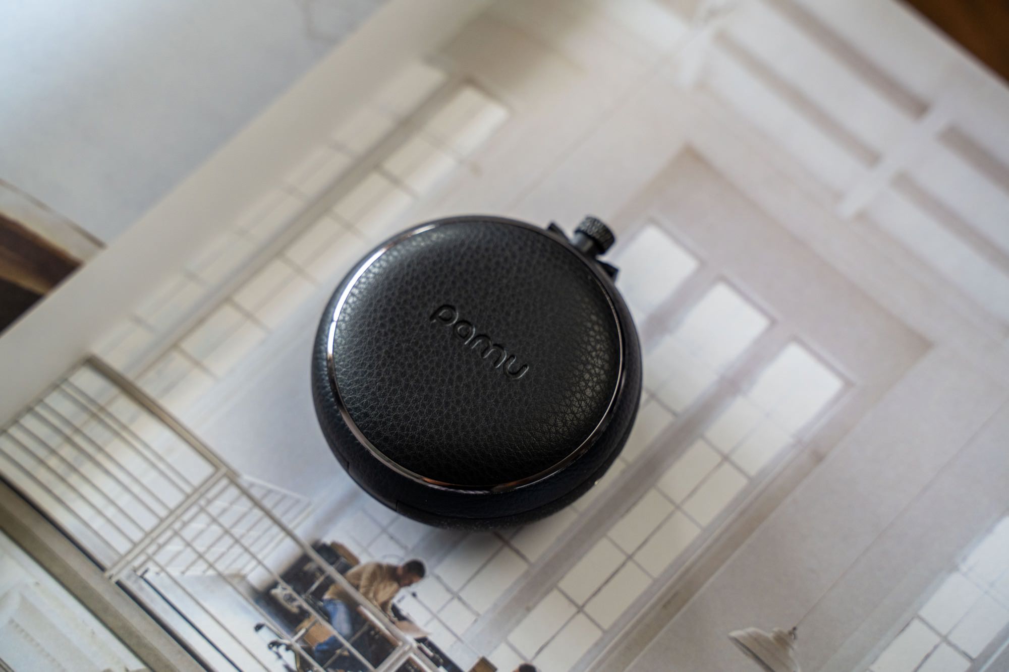 不同于大部分其他降噪耳机最常见的高亮漆面塑料材质, PaMu Quiet 采用的是黑色纹理的P U 皮、锌合金、塑料组合设计,设计像一个过去的怀表,走的是复古路线。