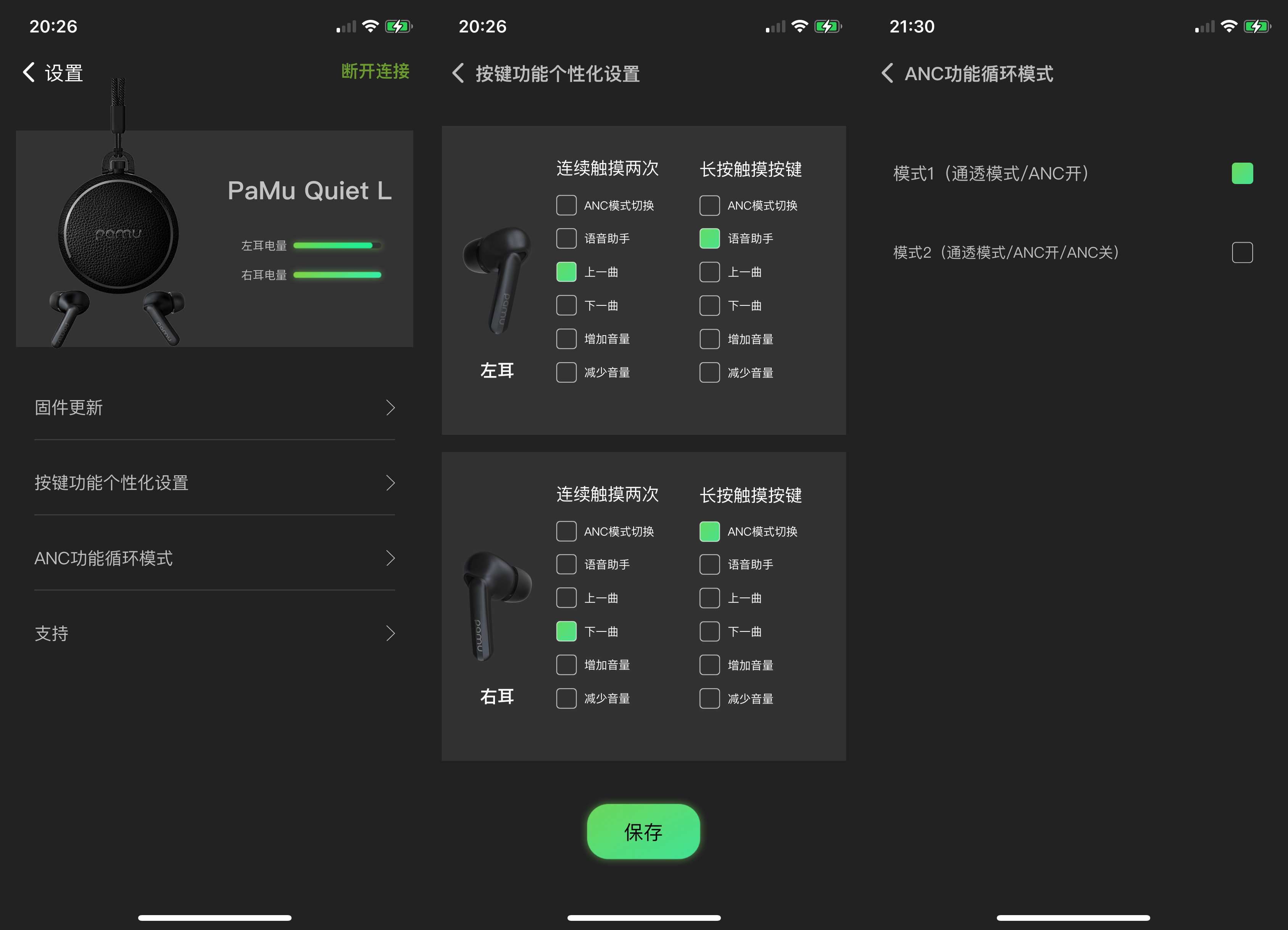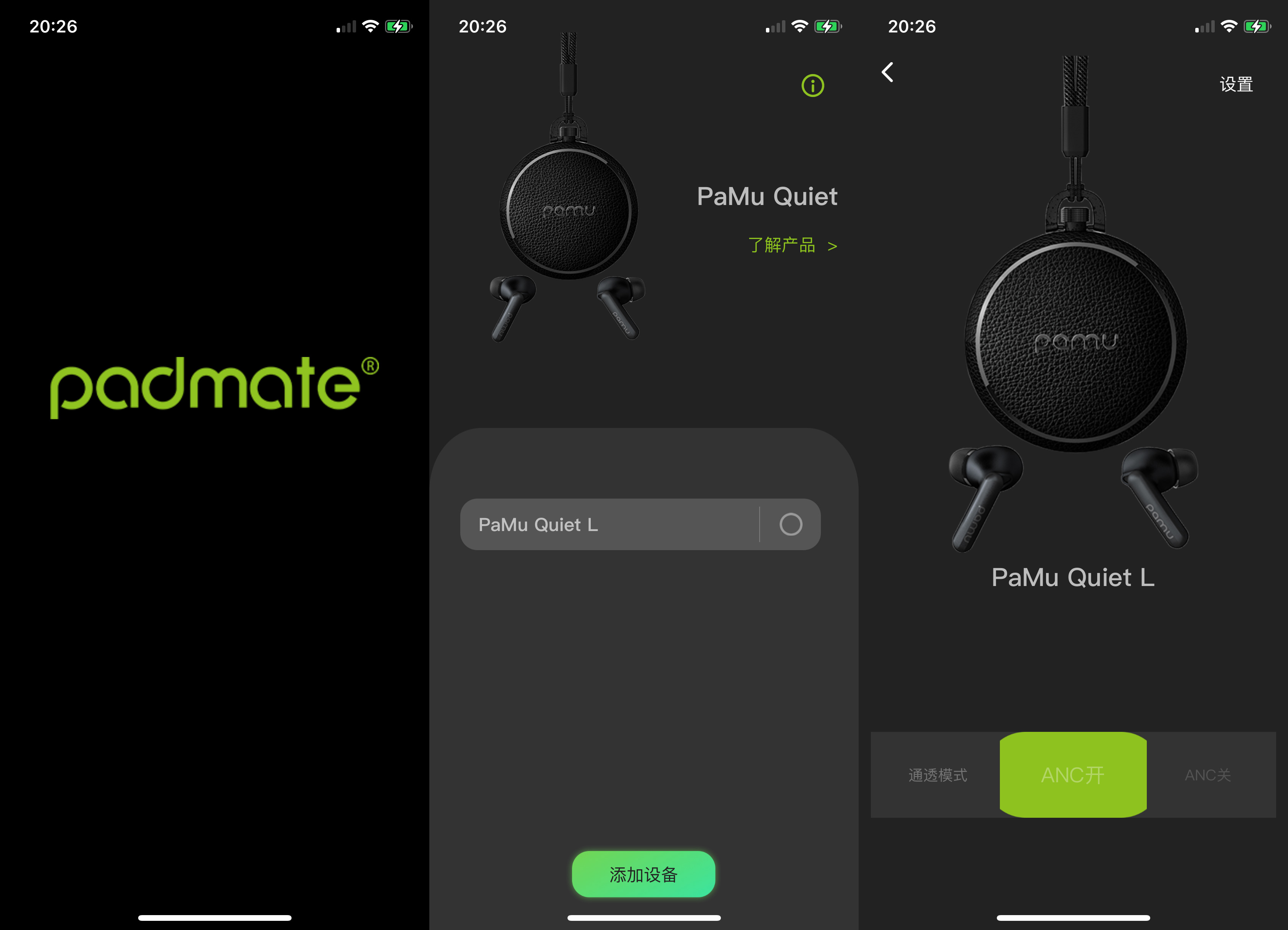 来到手机控制部分, PaMu Quiet 的APP就比较简单了,首页只有简单的添加设备,模式切换功能。