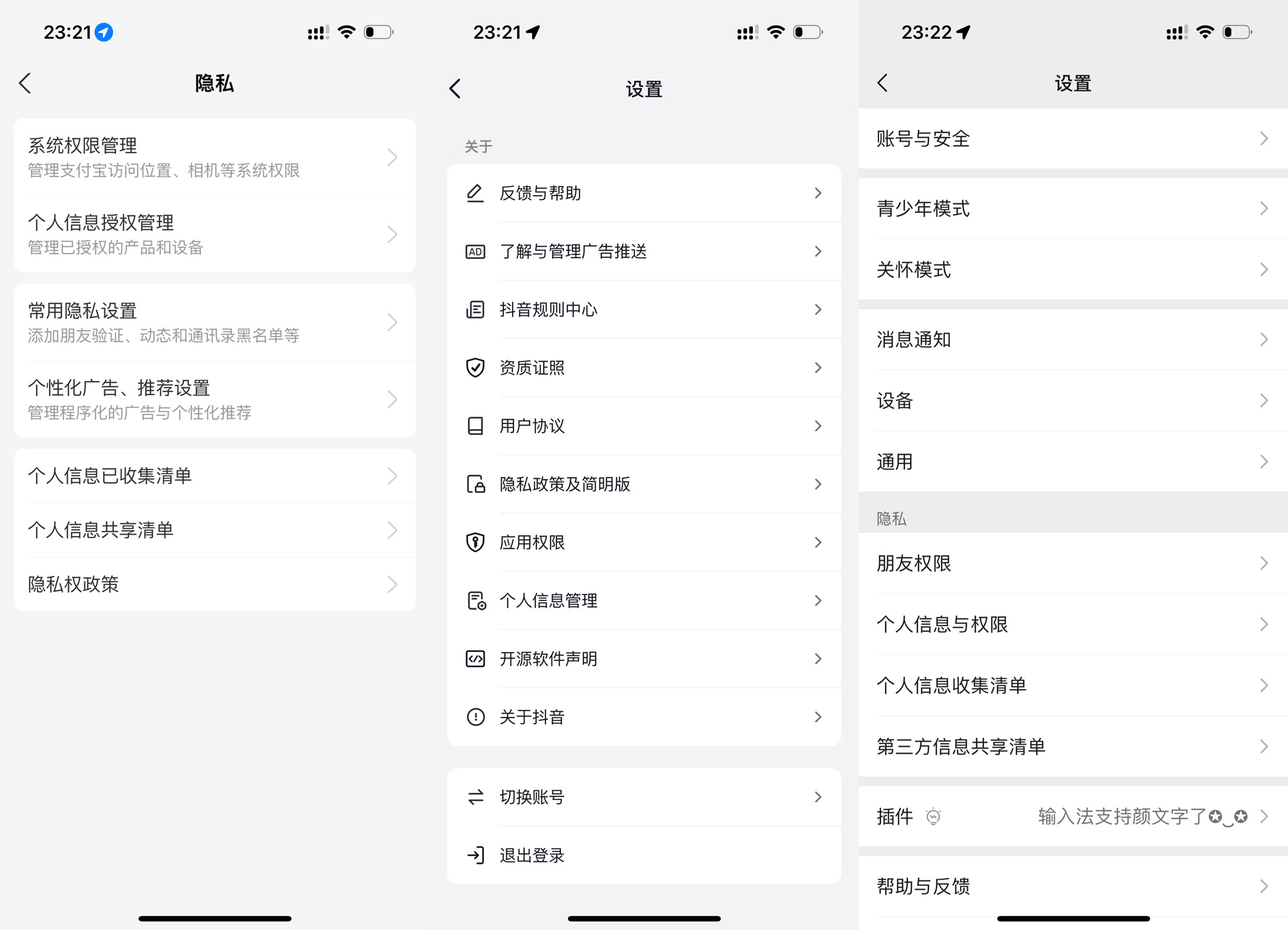 大家可以打开你日常使用最多的几个国内 APP,看看这些 APP 的用户协议,一般都会在APP的「隐私」栏里,在过去几年监管层的要求下,目前主流大厂的应用基本基本都强制公开了。