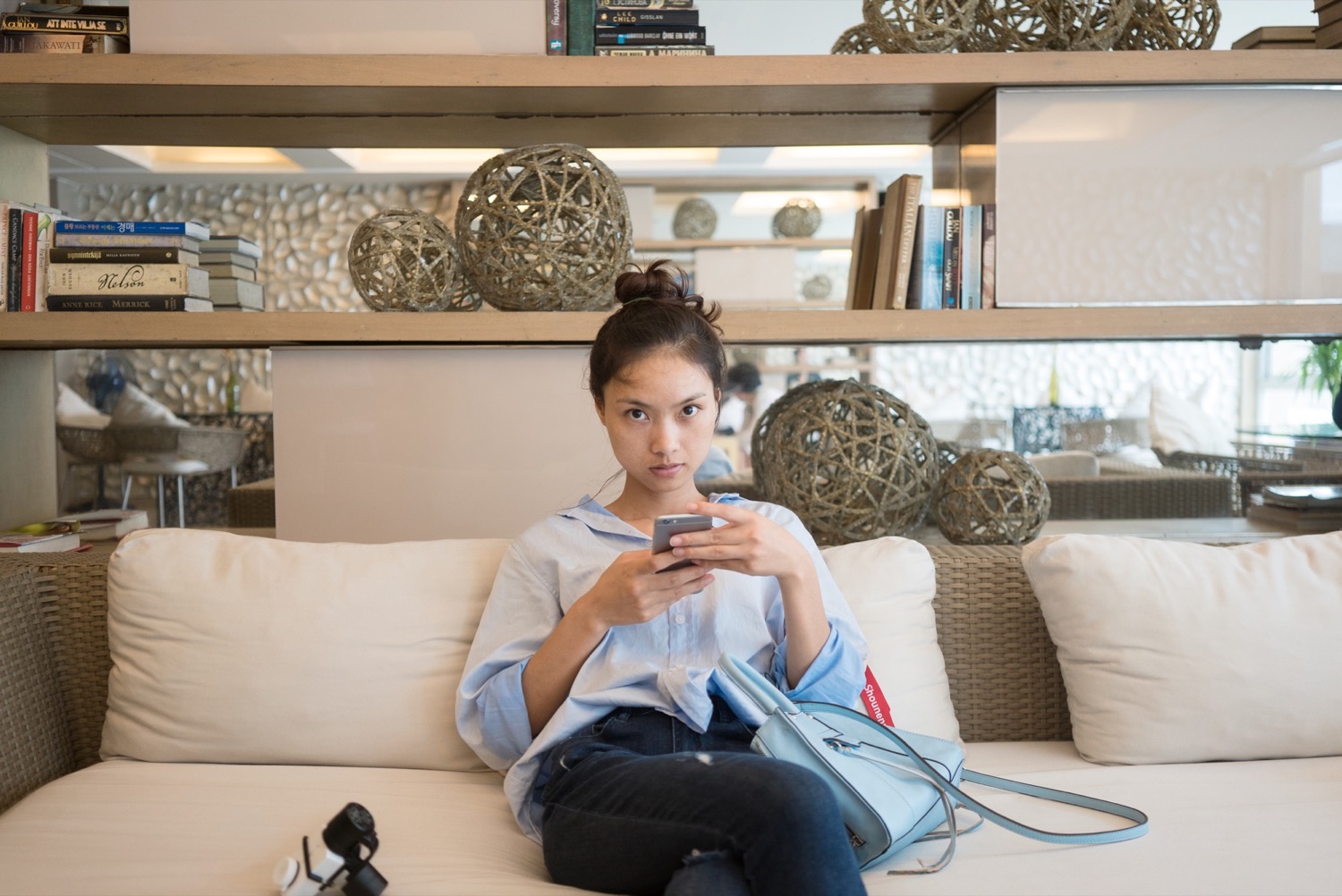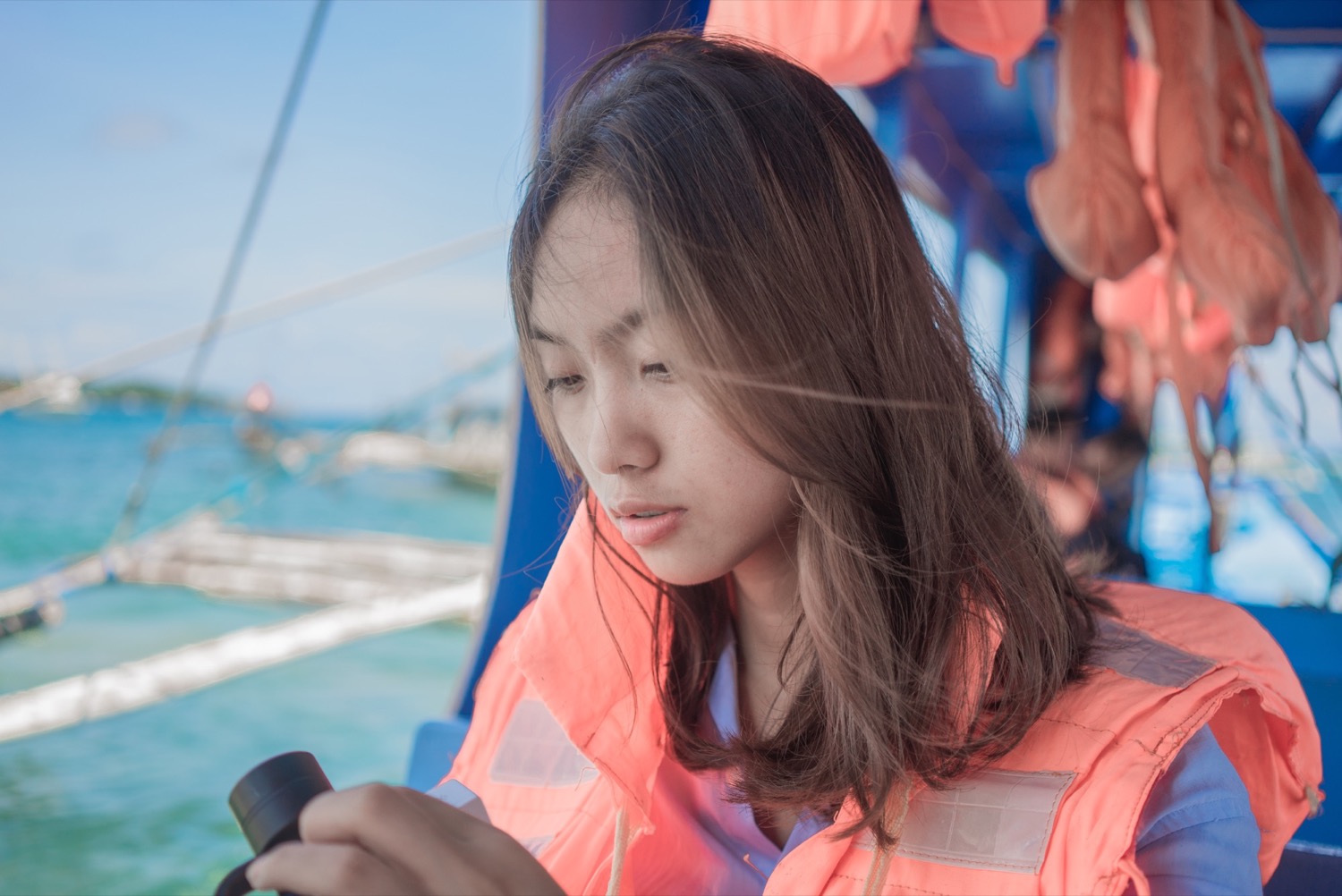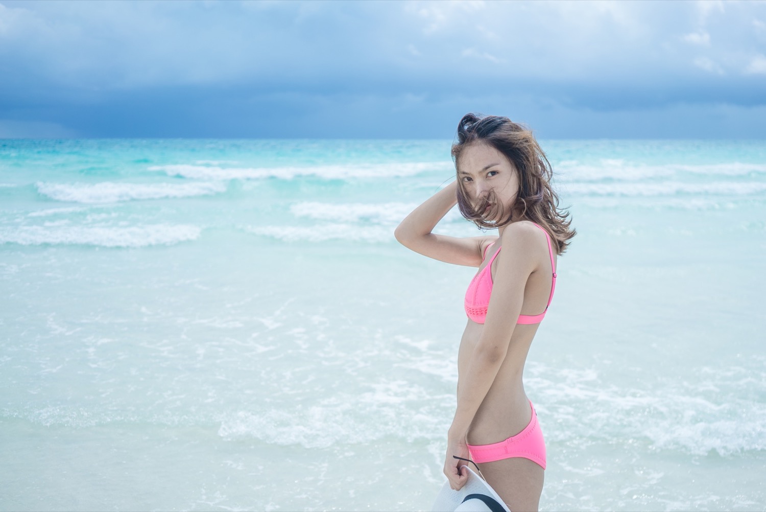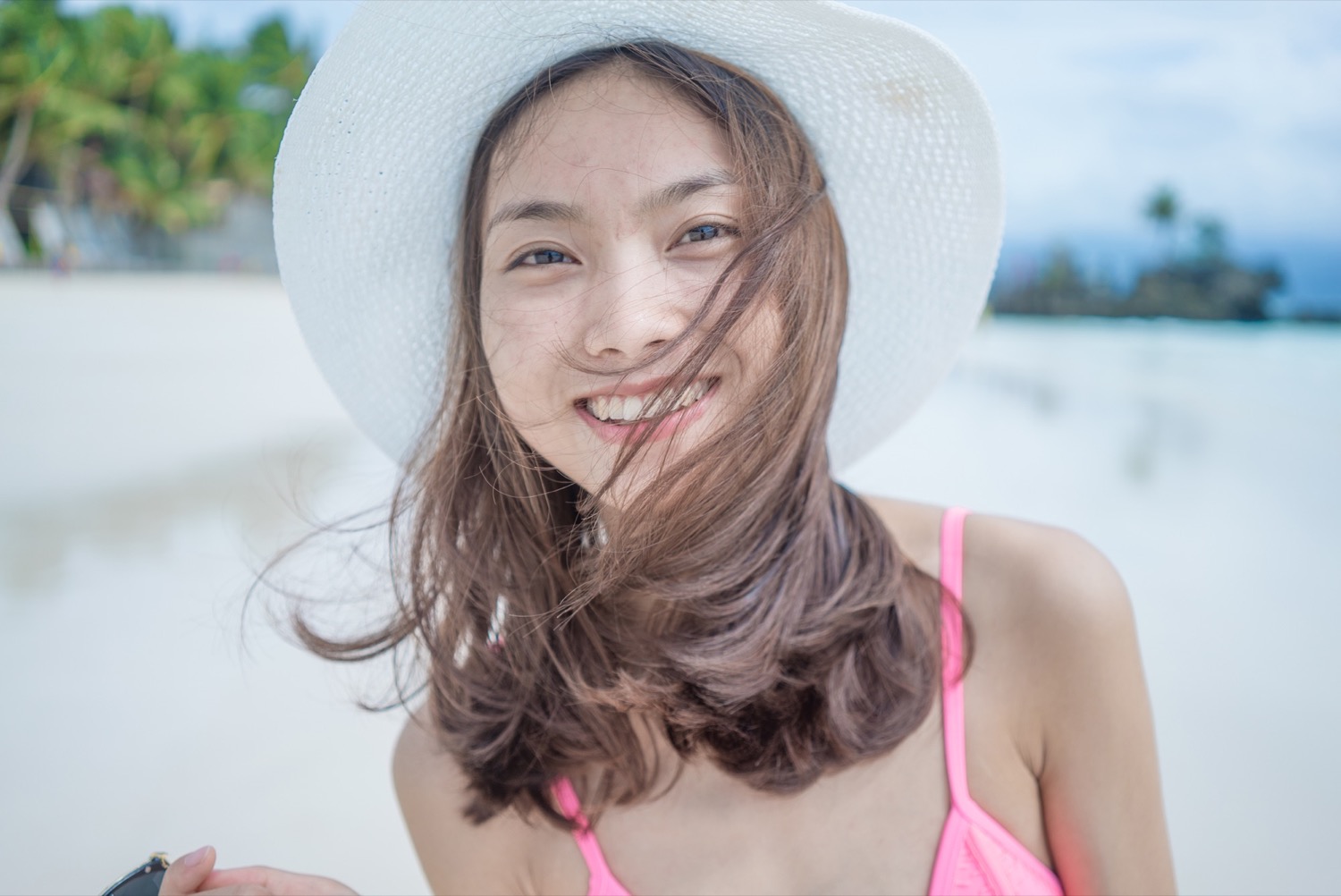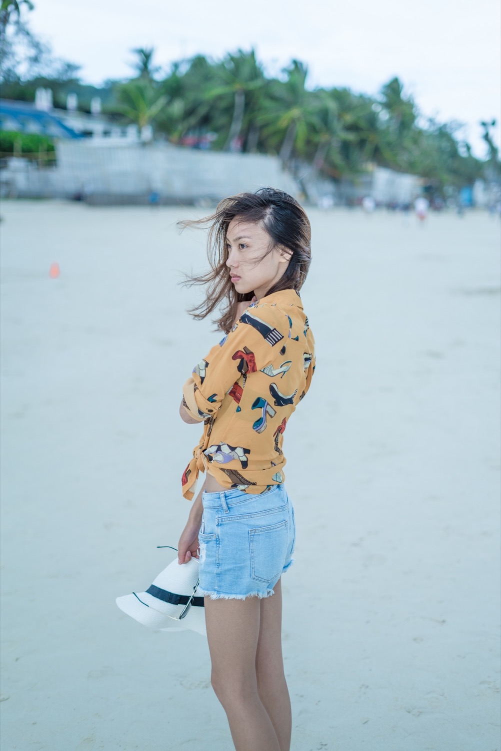 妹纸是一身「轻装」,我倒还背着相机,穿着人字拖在沙滩给妹纸拍拍拍,换上50mm的镜头,来给妹纸拍一张大头照。