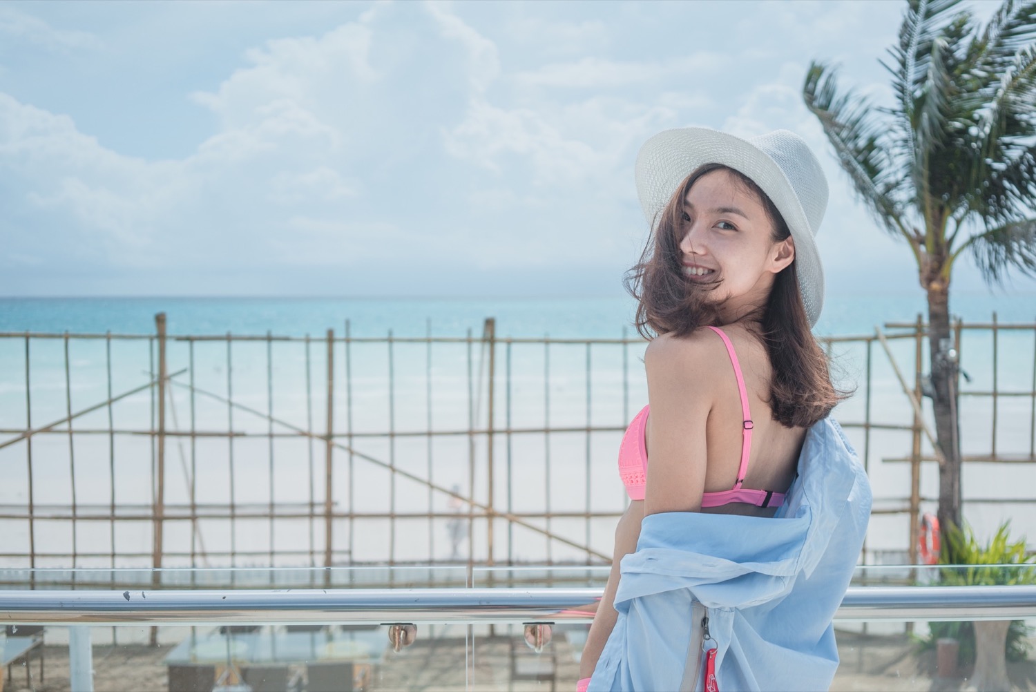 在二楼阳台,给妹纸拍一张,楼下的那个支架是这个季节防大风和大浪用的,9月还是长滩岛的雨季,基本上每天都会下雨,基本上都是短时间的阵雨。