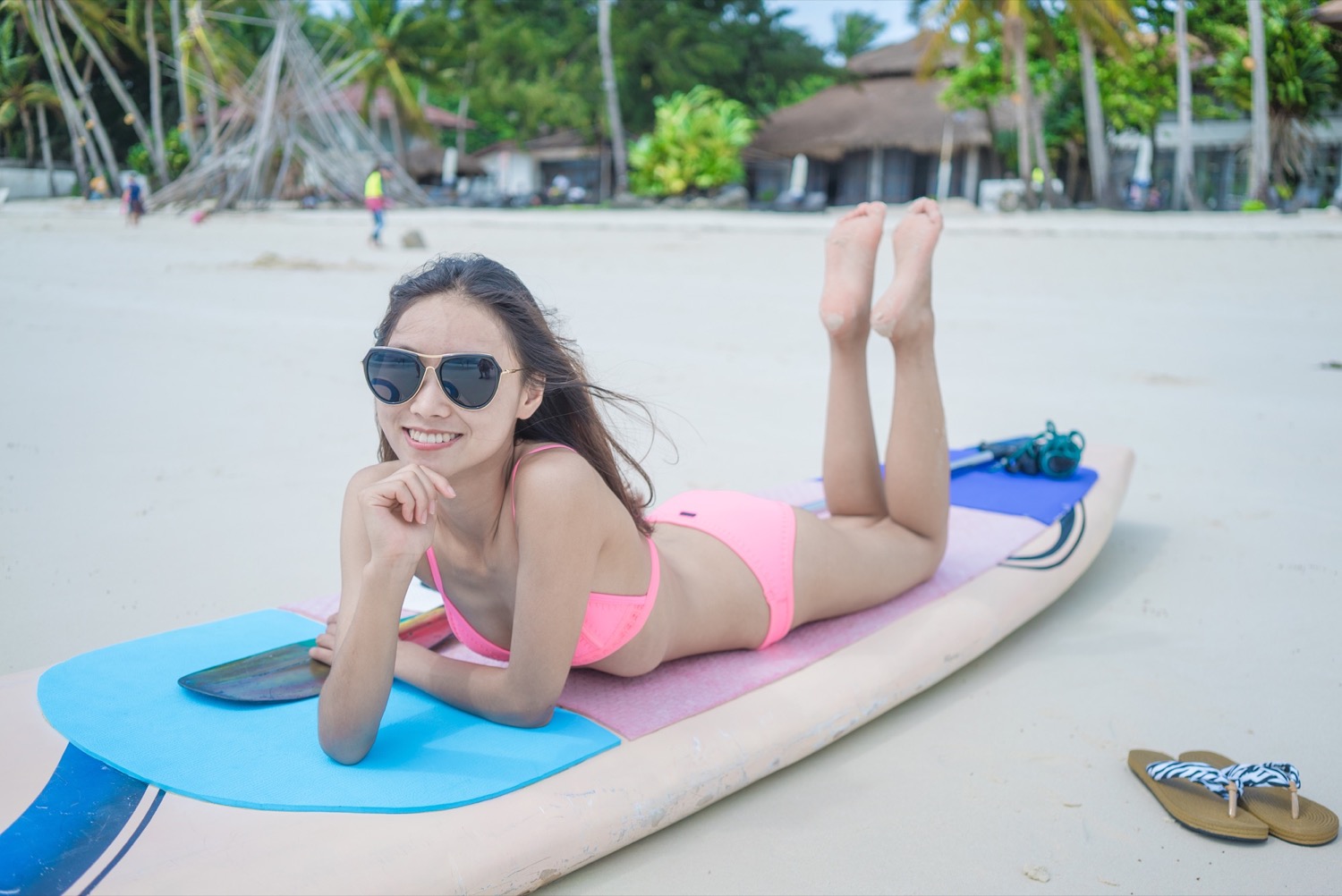中午的阳光刺眼,妹纸换上比基尼,一起去沙滩玩。