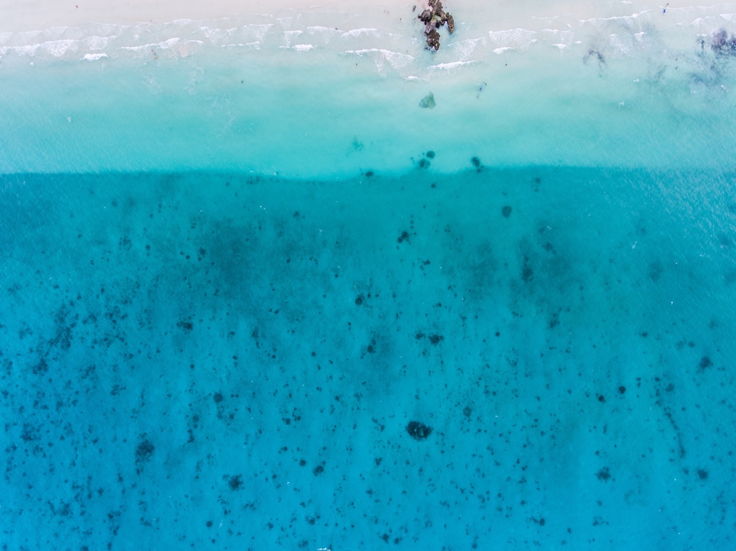 从空中看沙滩,可以看出十分明显的颜色渐变,白色的沙滩(这也是为什么叫白沙滩的原因),靠近海滩是淡绿色的海水,往远处则慢慢变成深绿,深蓝。