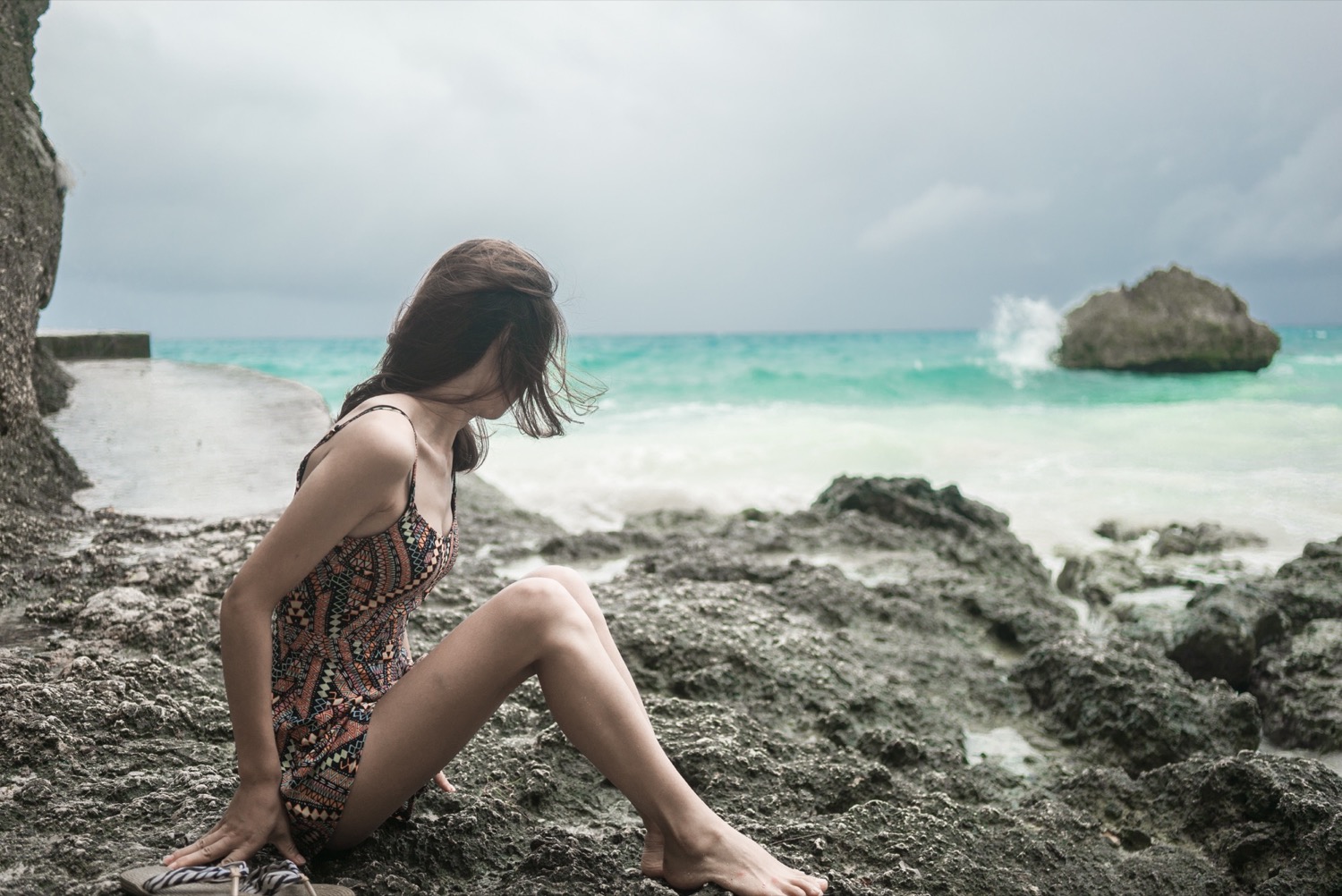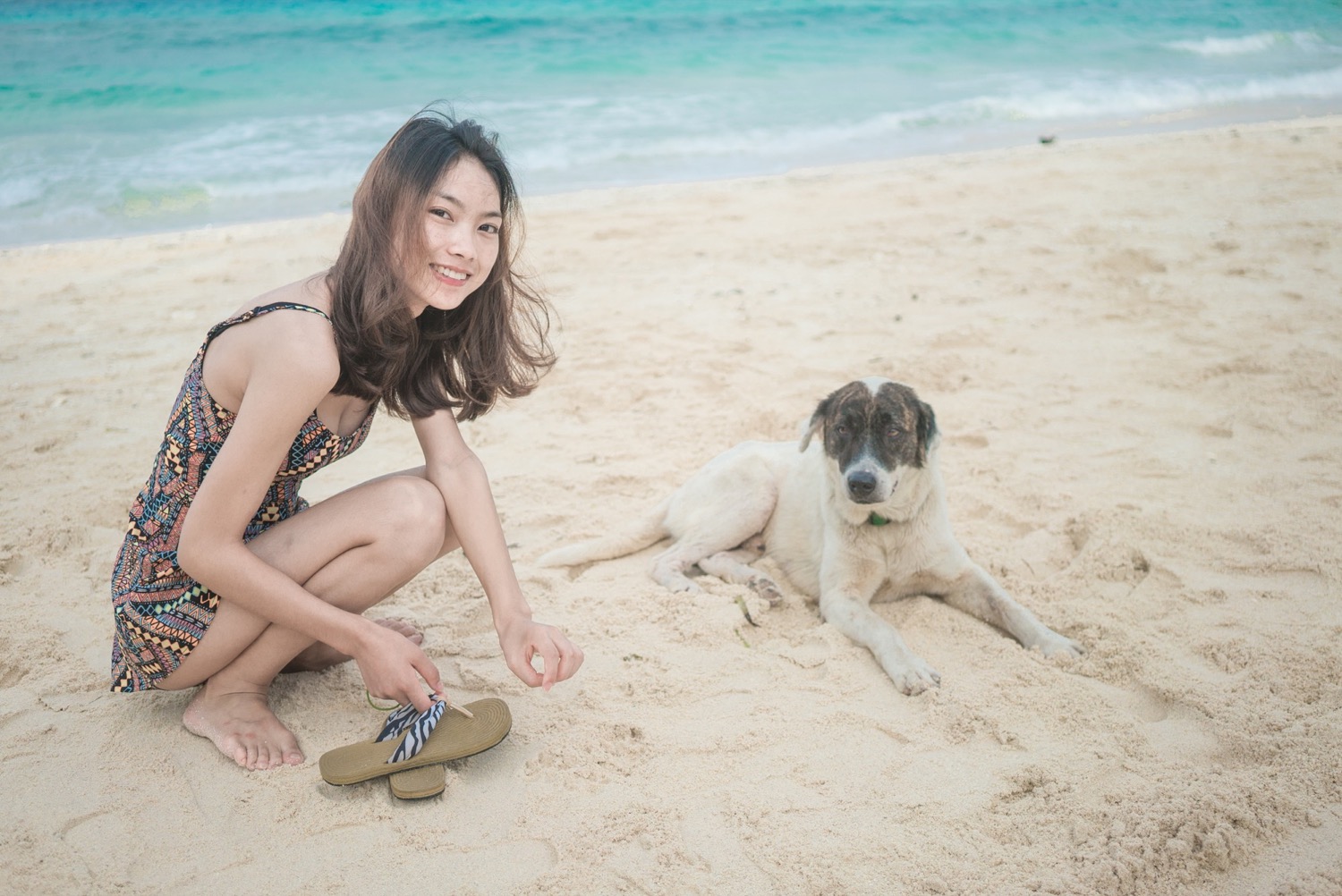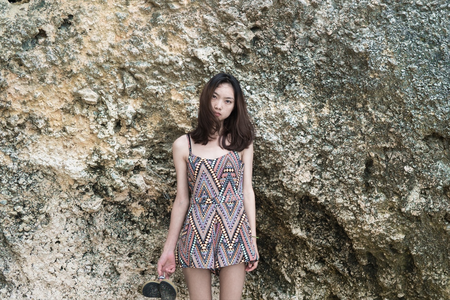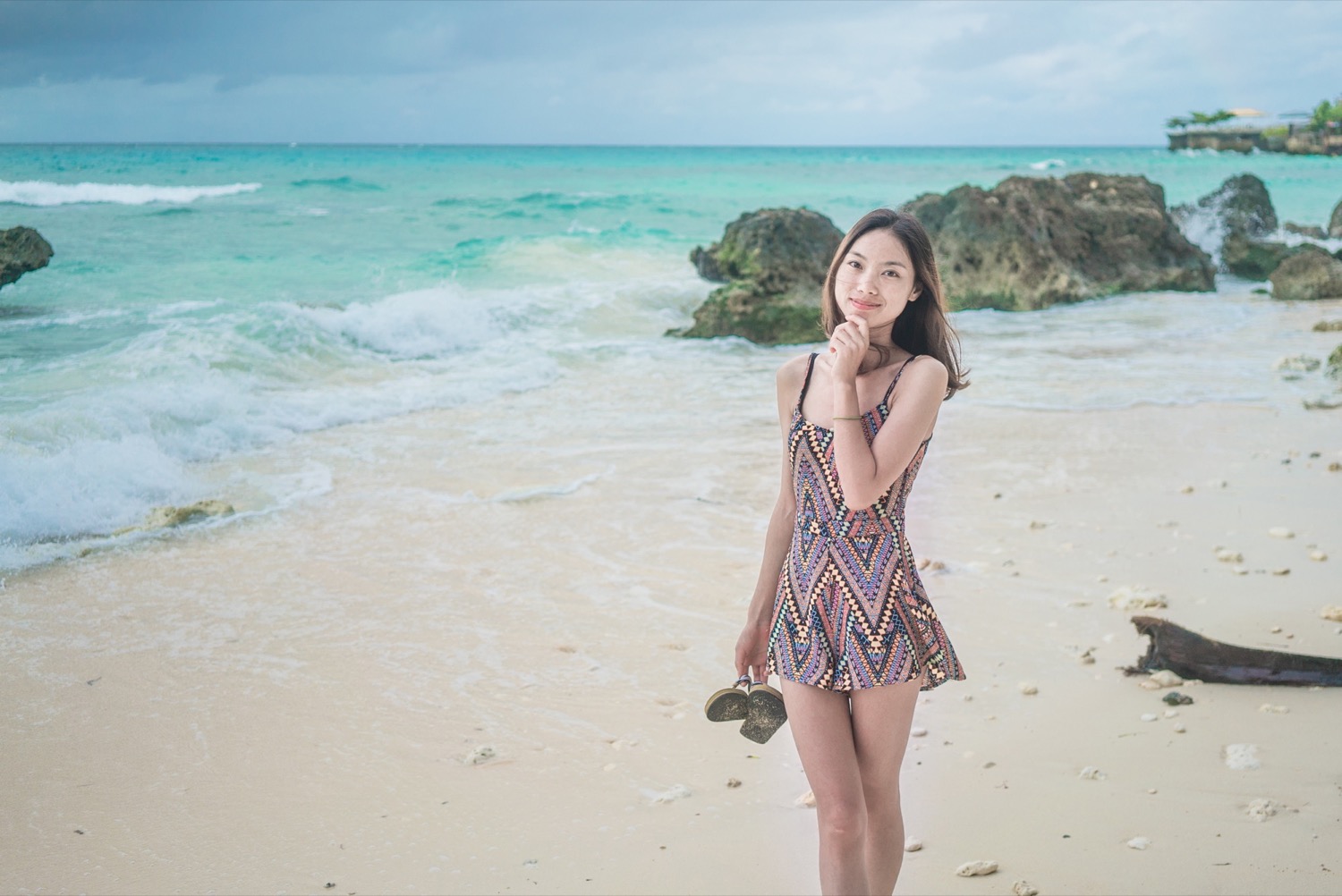 再往南走,就是白沙滩了,有一条小道沿着悬崖下通过去,但是看到浪径直打在路上,心想我背着相机,妹纸穿着拖鞋,还是有点危险,就放弃继续前行了。让杨左坐在岸边,在这里拍摄了一个视频特写。