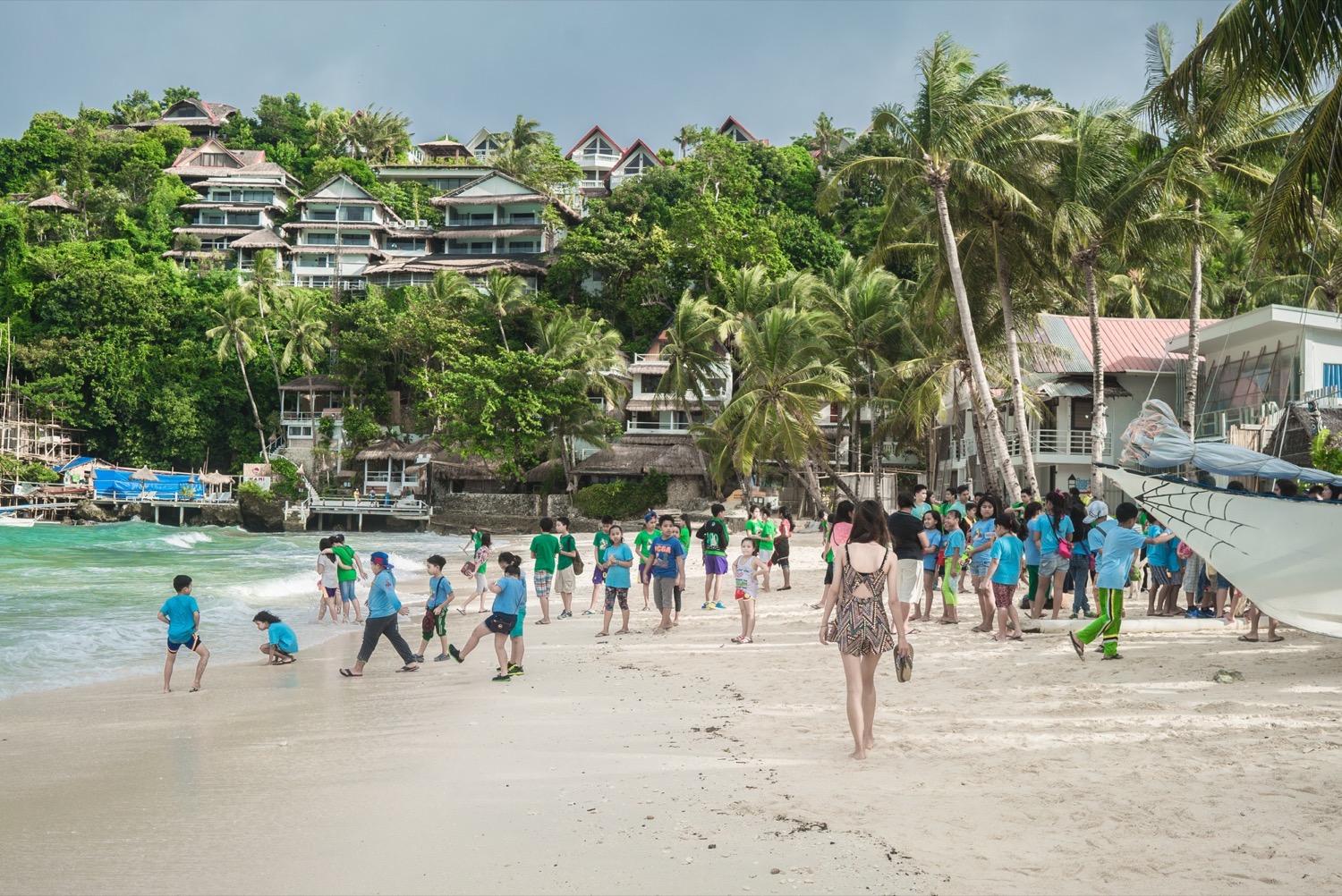 拍完长滩岛日出,回酒店放上无人机,拿起相机,妹纸也起床了,跟妹纸来一个晨行。海滩上来了一群当地的小学生,好像是在捡拾垃圾什么的。