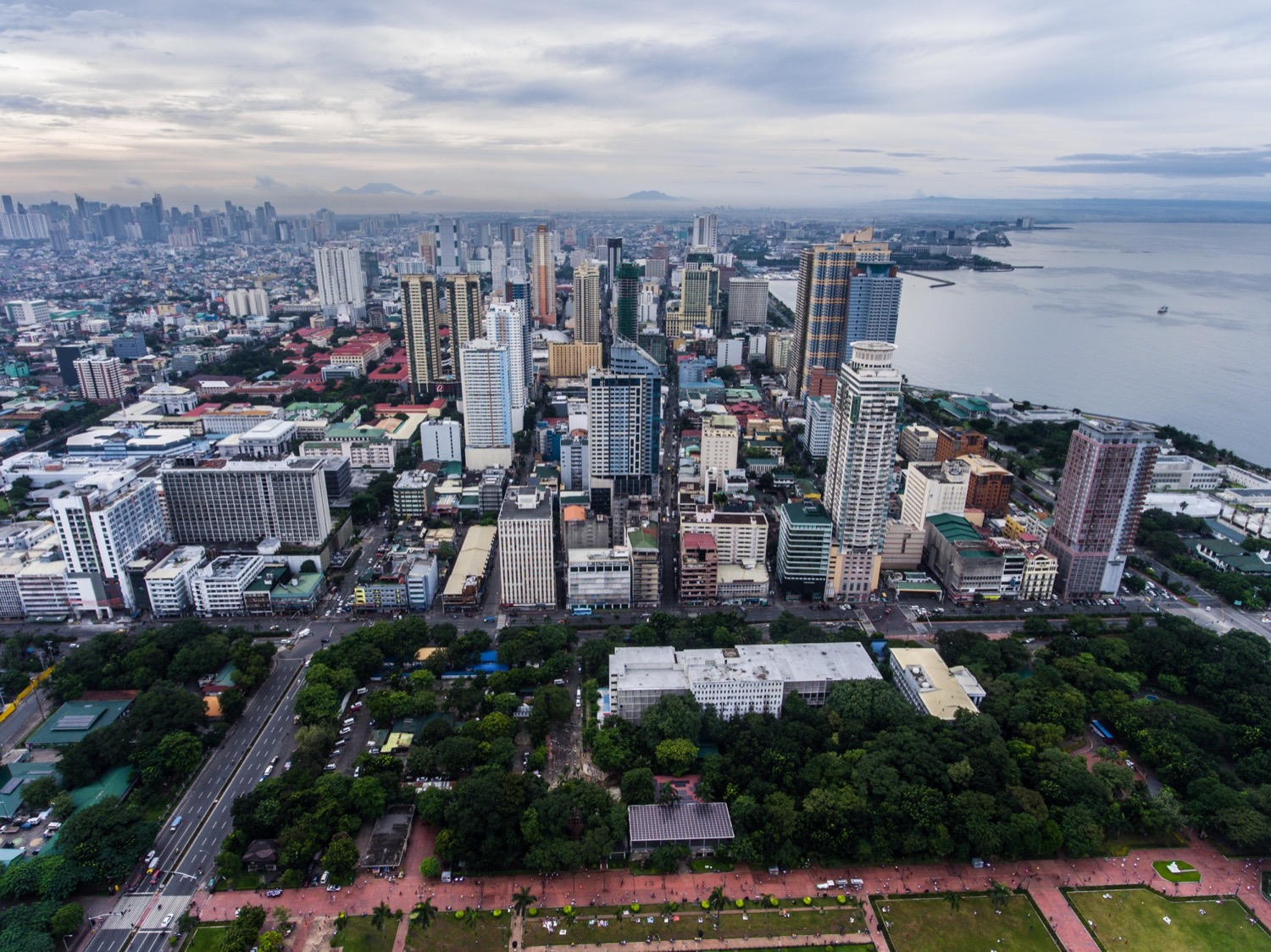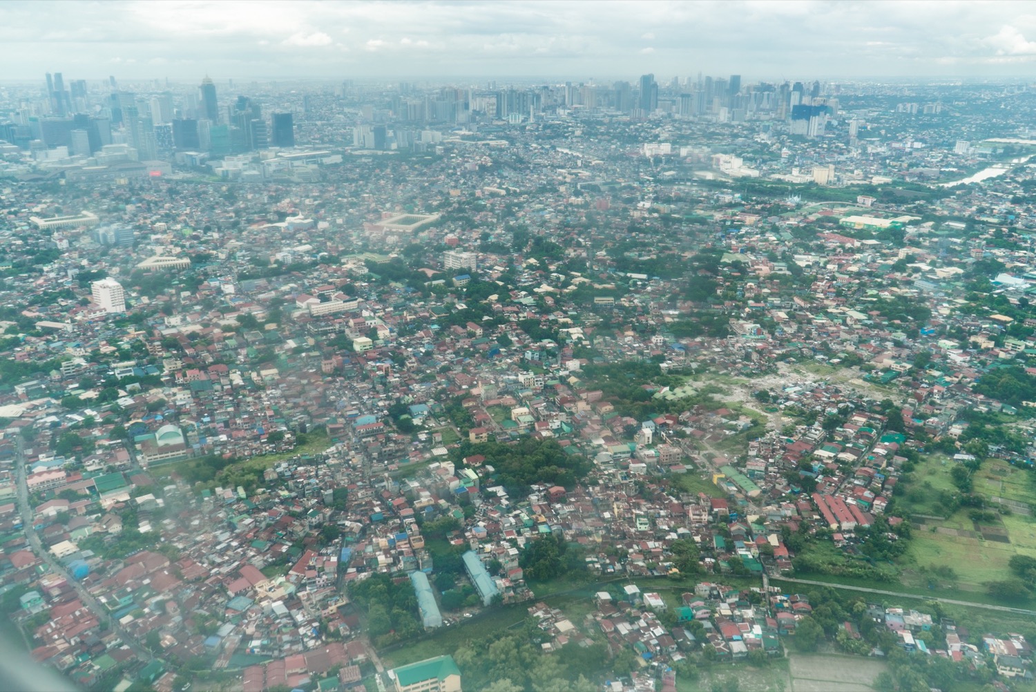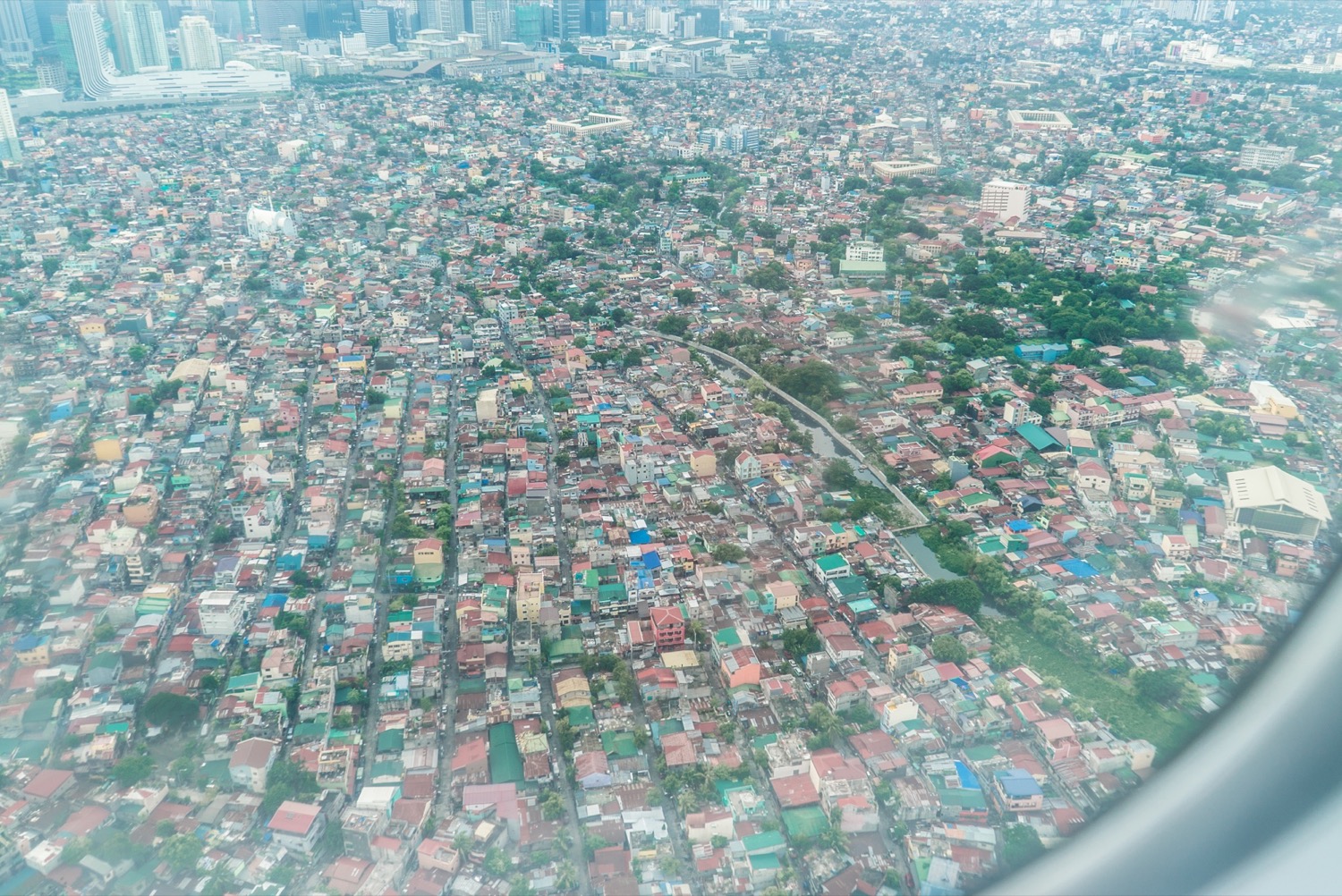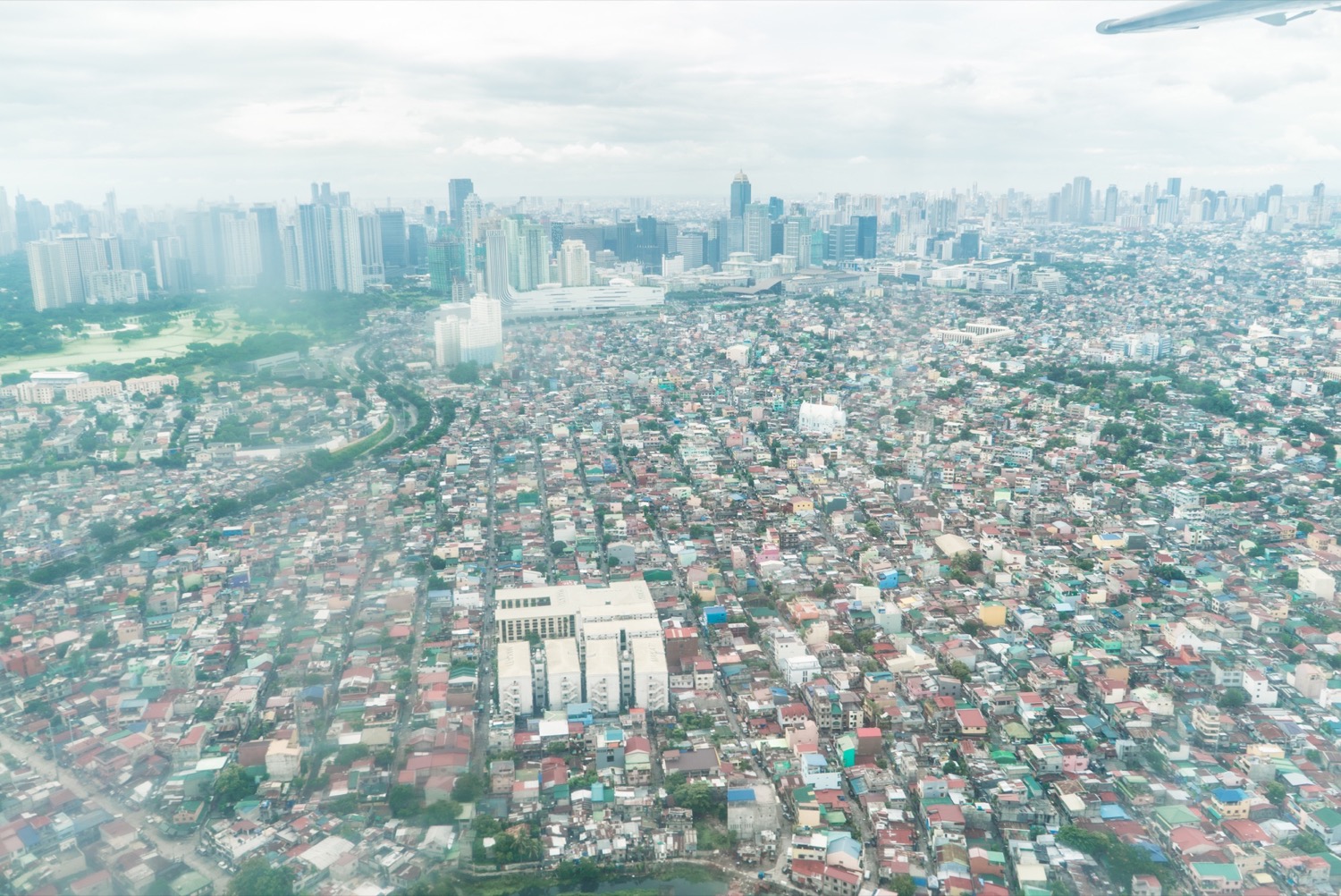 从空中俯瞰马尼拉城市,有高楼大厦,也有成片的民宿,发展中国家特色。
