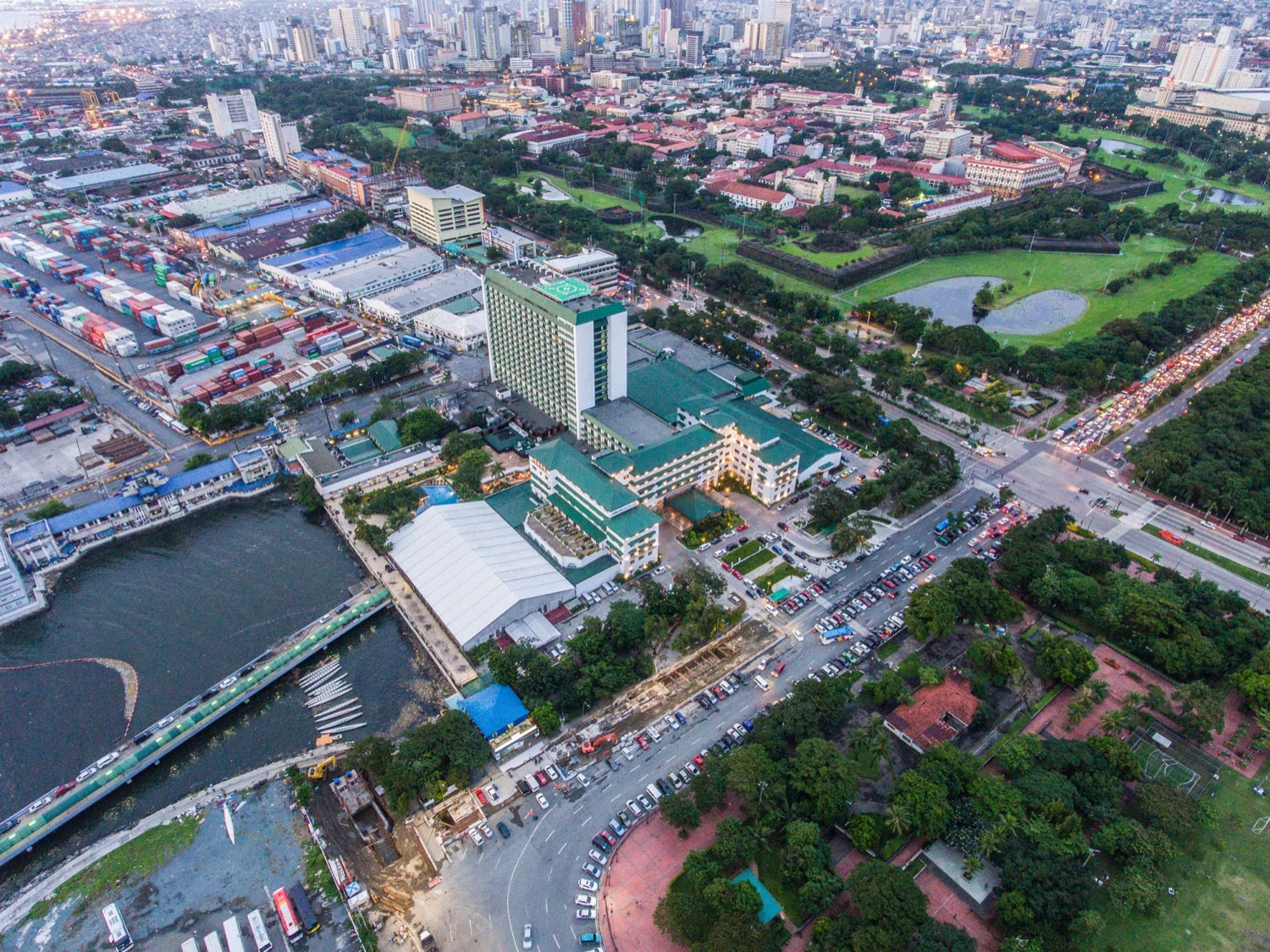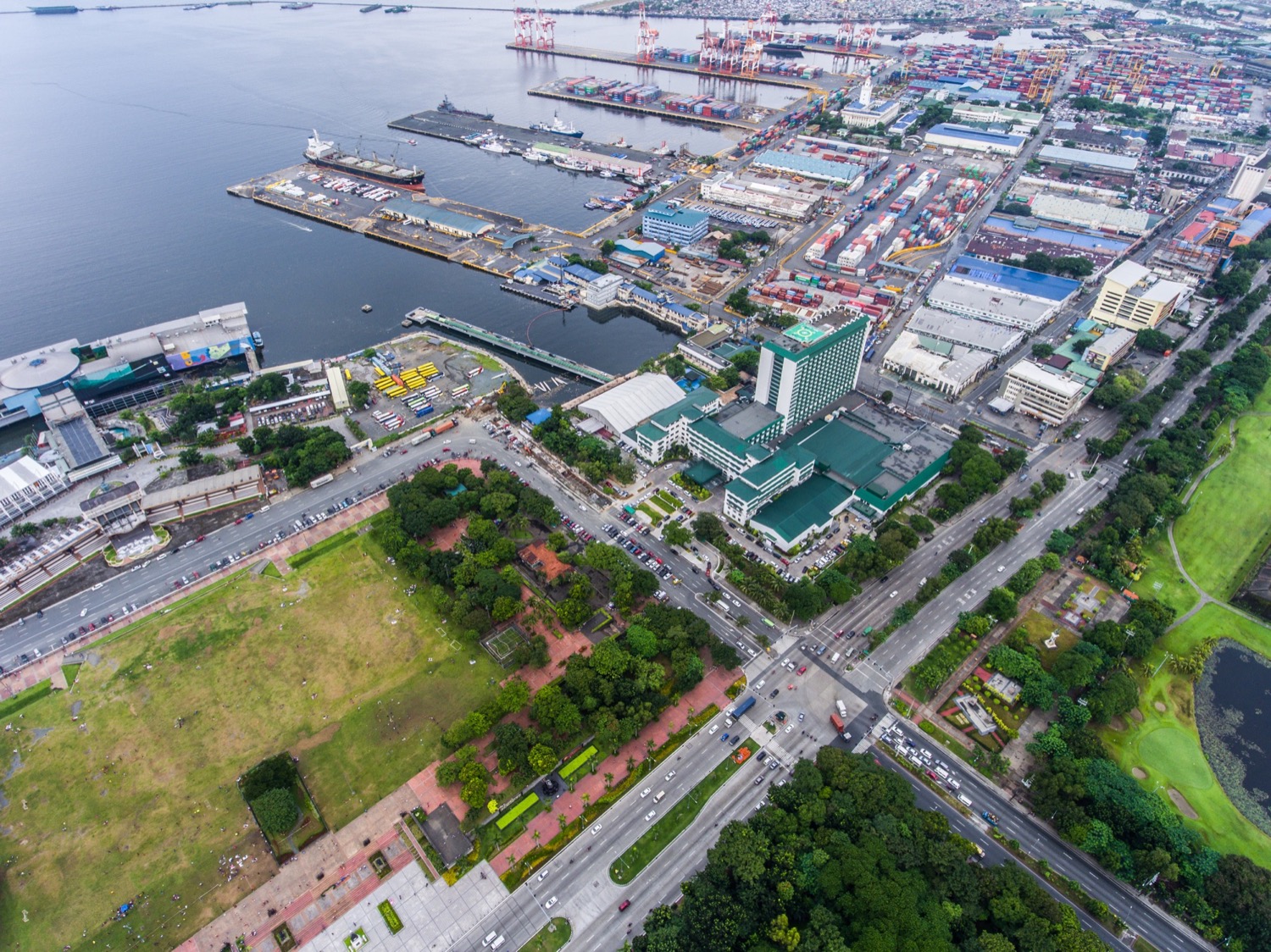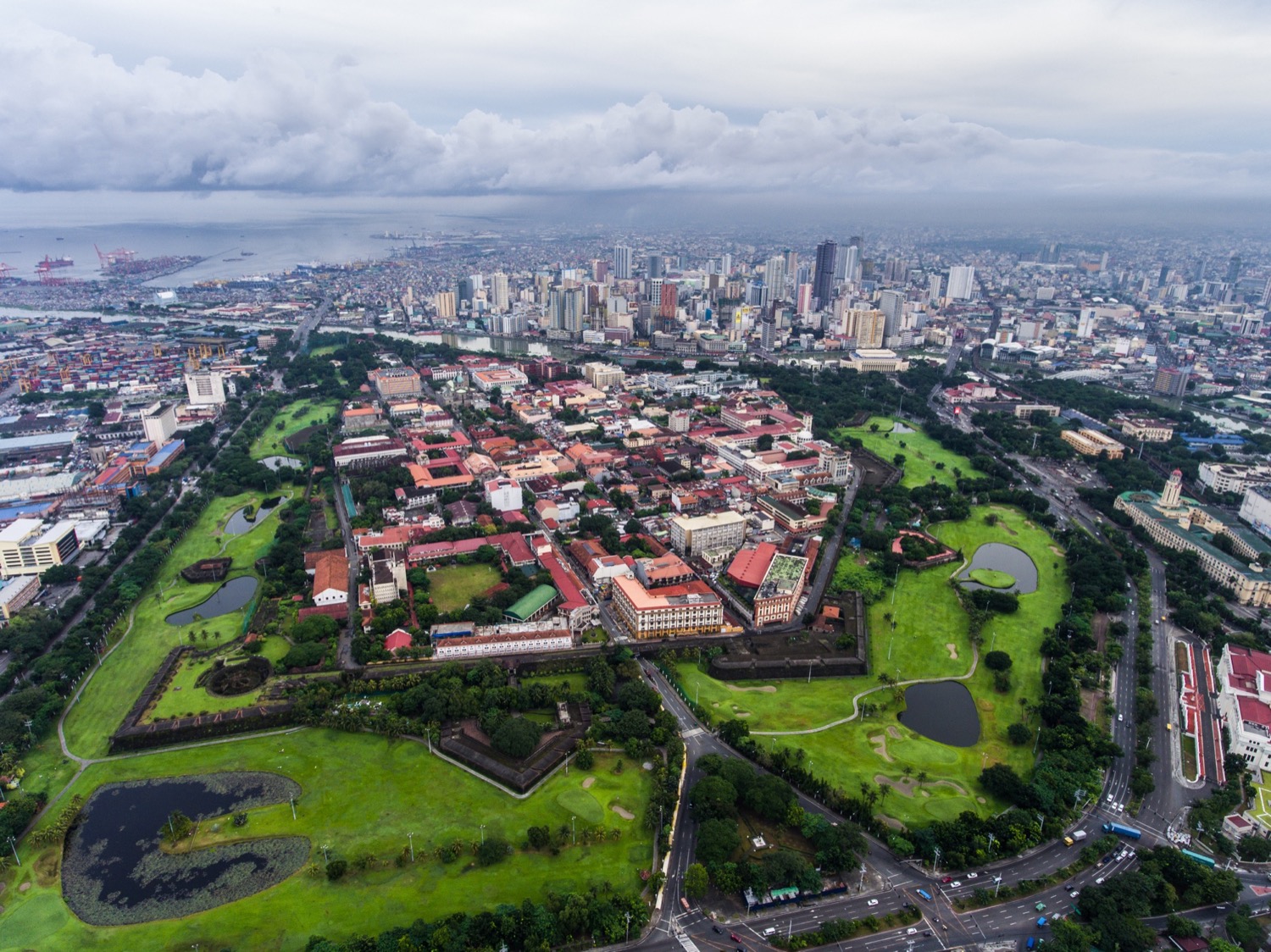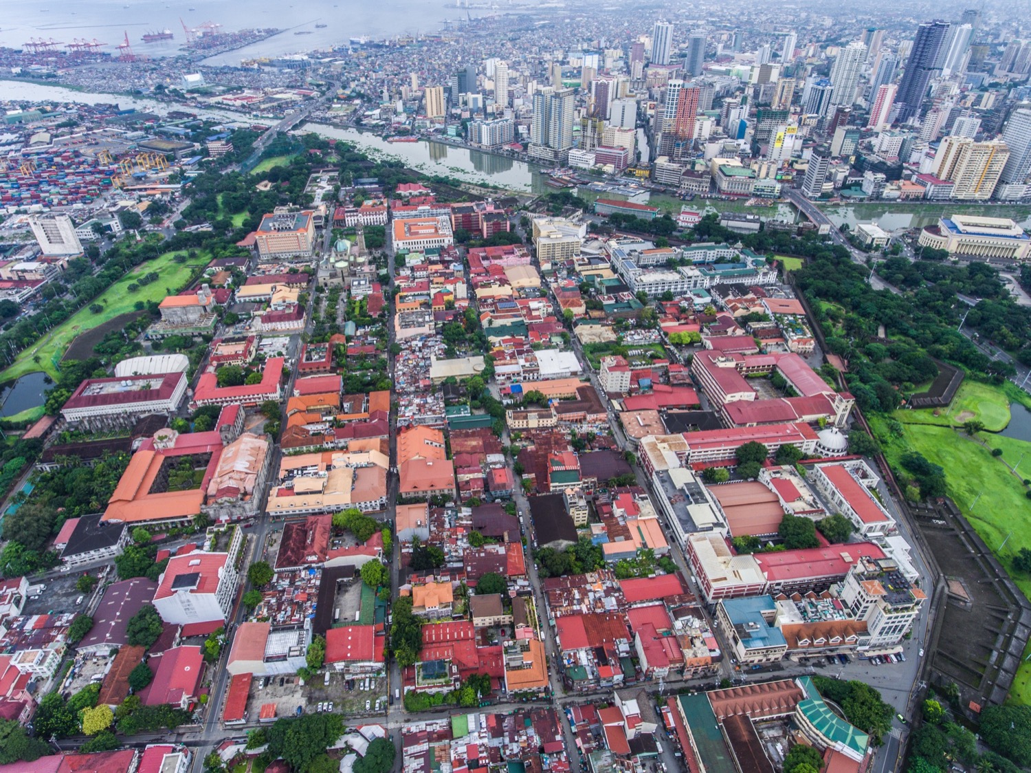 从空中俯瞰马尼拉城市,有高楼大厦,也有成片的民宿,发展中国家特色。