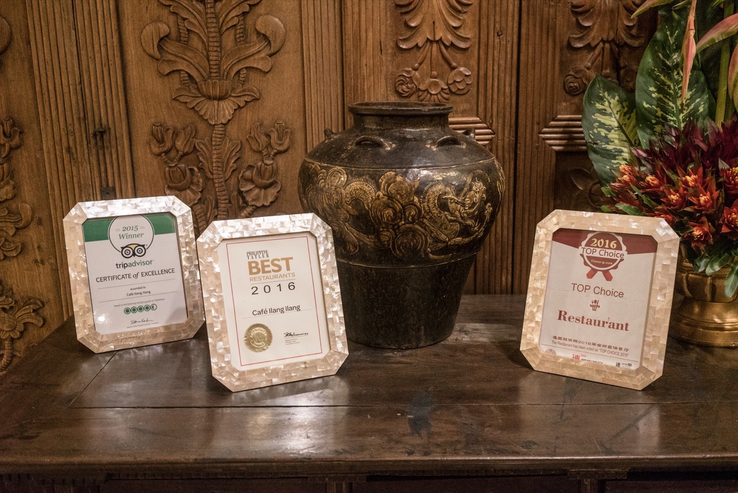 从酒吧出来,看到厅前放着马尼拉酒店获得的一些奖章。