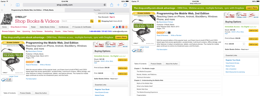 iOS 7以后,使用iPhone上的Safari浏览网页,滚动的时候会自动隐藏工具栏(ipad不会),iOS 8 ipad也有了这个细节上的变化(横竖都有)。不同的是,在横向模式的时候,iPad上面还有一小条,iPhone则是全屏。