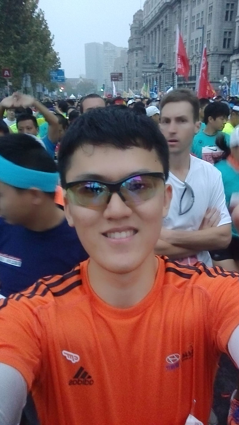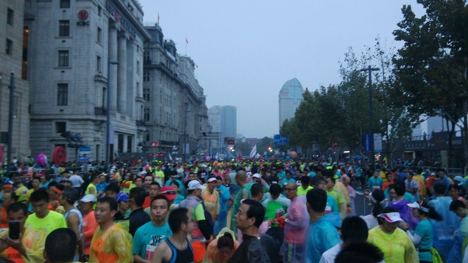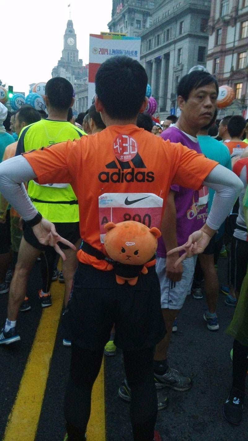 绕了两个路口,来到上马的起跑点,我是A组选手,在最前面,这次上马全程马拉松的人数有7000人,A组的选手倒来得挺早,趁着人不多,赶紧小跑了两圈热热身,接下来就在原地蹦哒和拉伸,当然,还有自拍、自拍、人群中的自拍,背景是东方之珠的自拍、外滩的自拍、起点的自拍,无尽的自拍。