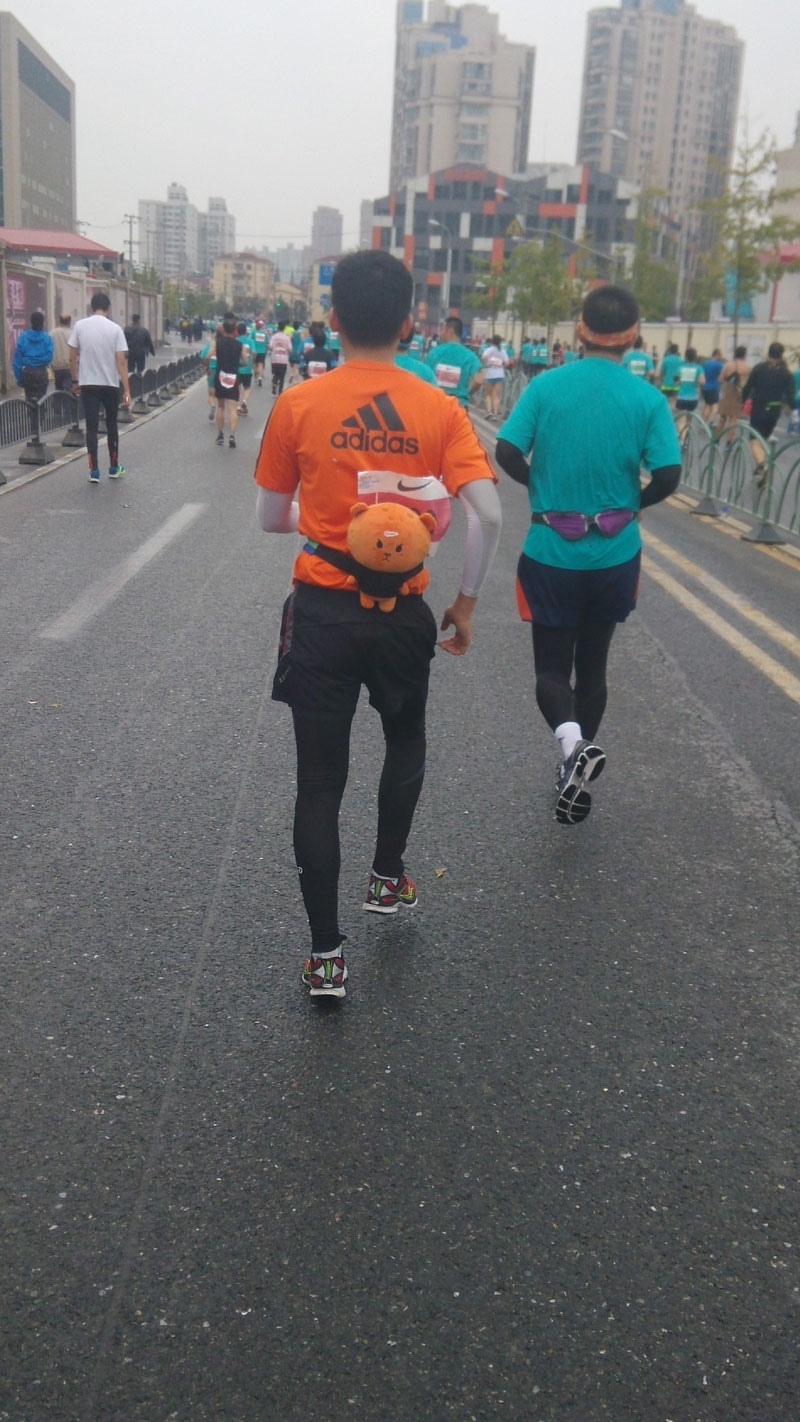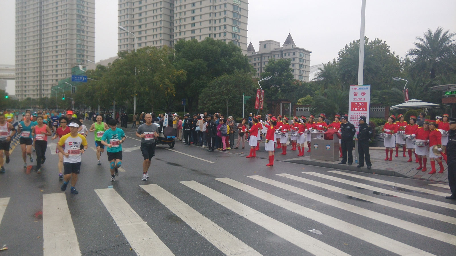 再一拐,进入一道大路,南京路步行街,街边的人也多了,早起的人们冒着雨,在路边给我们加油,在这里倒是要赞一下上马,真的是氛围很好的一座城市,有打鼓的,有老大妈的礼仪队,有妹纸的啦啦队,有乐队,有打腰鼓的,一路上真的是好不热闹。