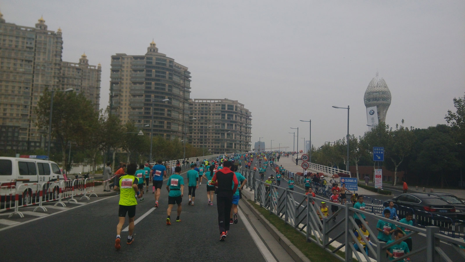 5公里,轻松;10公里,进入状态;我15公里,我感觉自己像一个机器,双脚在摩擦,前行,状态依旧不错;但是,我的膝盖,逐渐开始出现了异样,心理想着糟了,这个状态提前到来了,考虑了一下依旧保持配速,继续向前跑。15公里之后,已经跑出了市区,来到了江边,远处就是著名的南浦大桥,经过1/3的路程,已经拉开了大部分跑得慢的选手,道路宽阔没有人,我的位置介于345兔子和400兔子之间,进入到江边的折返路线,膝盖开始出现了痛觉,找路边的志愿者喷了一下云南白药气雾剂,咬了咬牙,稍微缓了点疼痛,继续前进,再这么跑到了20公里,看了下手表,1小时内1分,比上次北马的156提高了将近6分钟,心中倒也是一阵小下的傲娇,想着也创了一个记录,刷新了20KM的成绩。