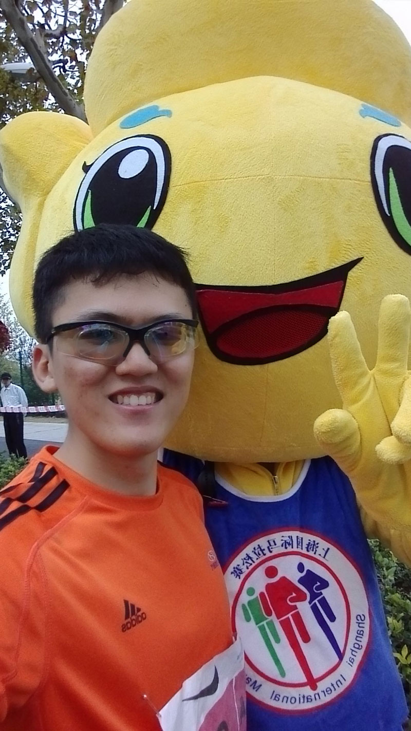 痛归痛,还是要会自娱自乐,一路见到旁边的观众还是会勾搭几句说上海的美女你们好啊,大妈大叔你们好啊,吉祥物你好啊我们来自拍个。
