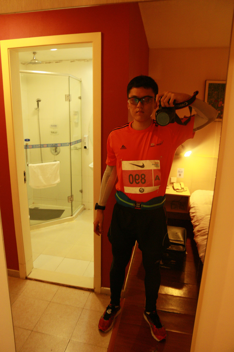到了宾馆,已经九点,打开行李箱,倒出上马发的装备袋,把明天要穿的衣物设备都铺在床上。给衣服别上号码牌,穿在身上,背着公司即将面世的吉祥物「小豹」,在屋里蹦哒了两下,顺便自拍了两张,唉这人这么越大越喜欢自拍了 ╮(╯_╰)╭ 。